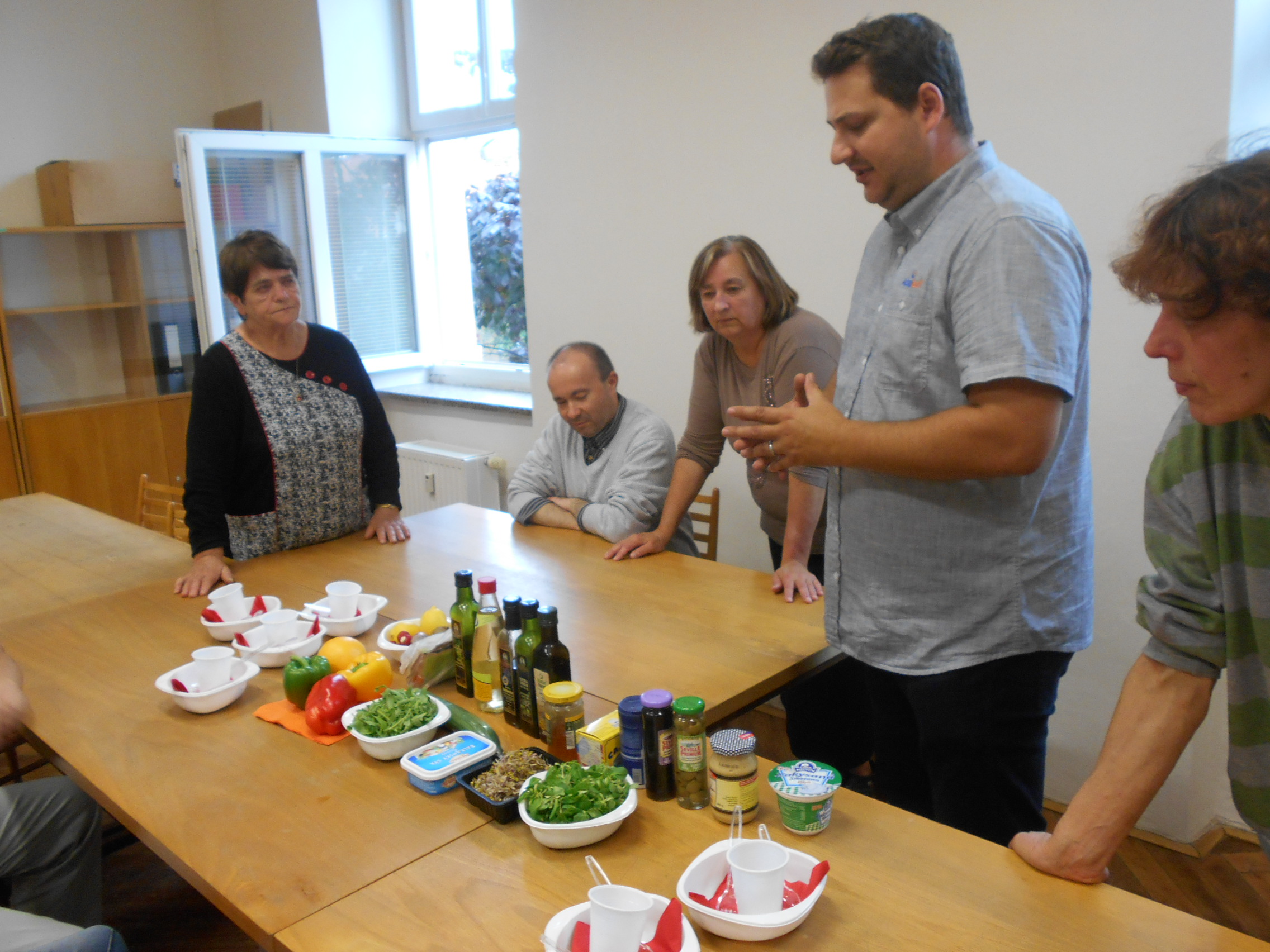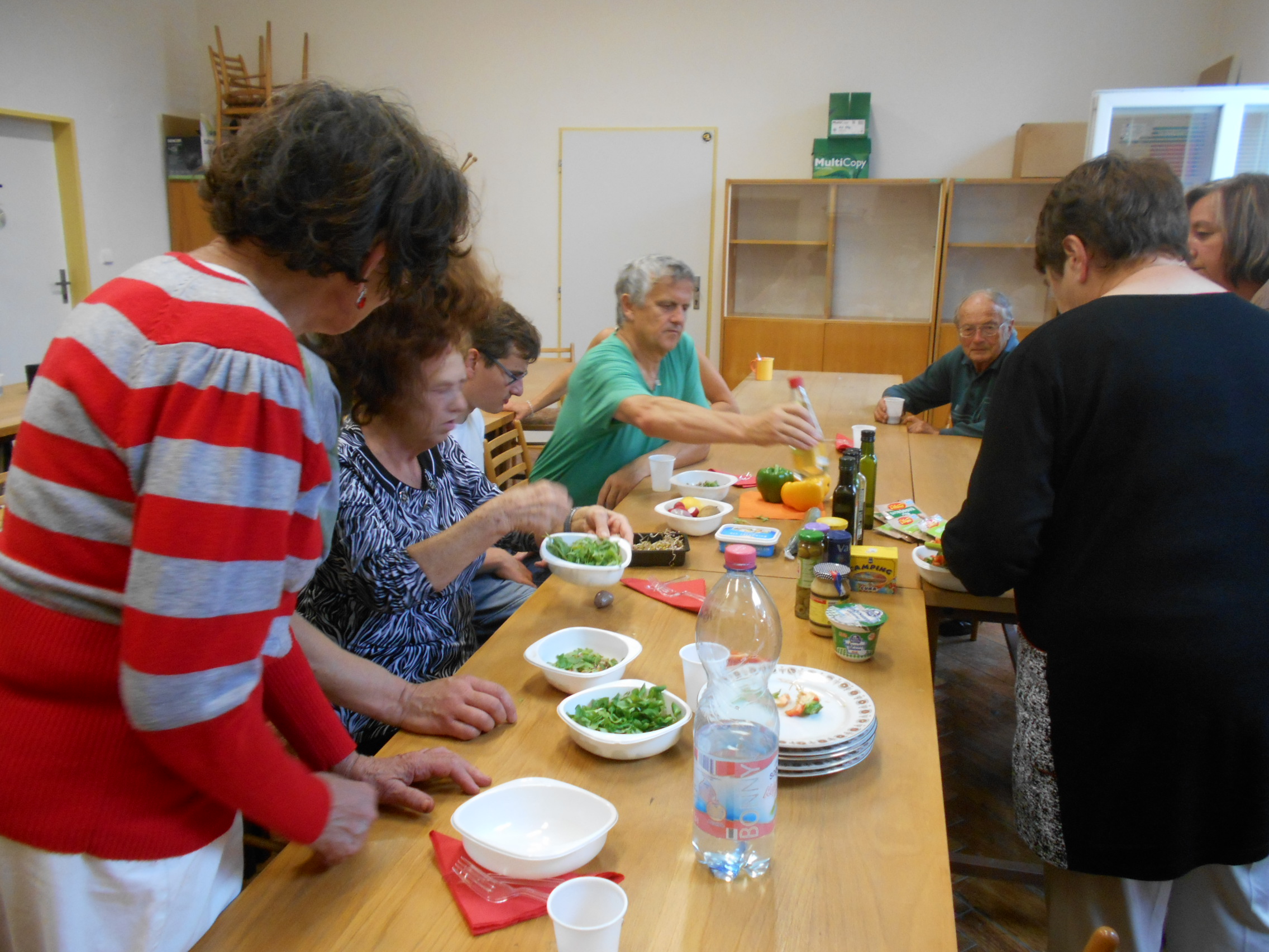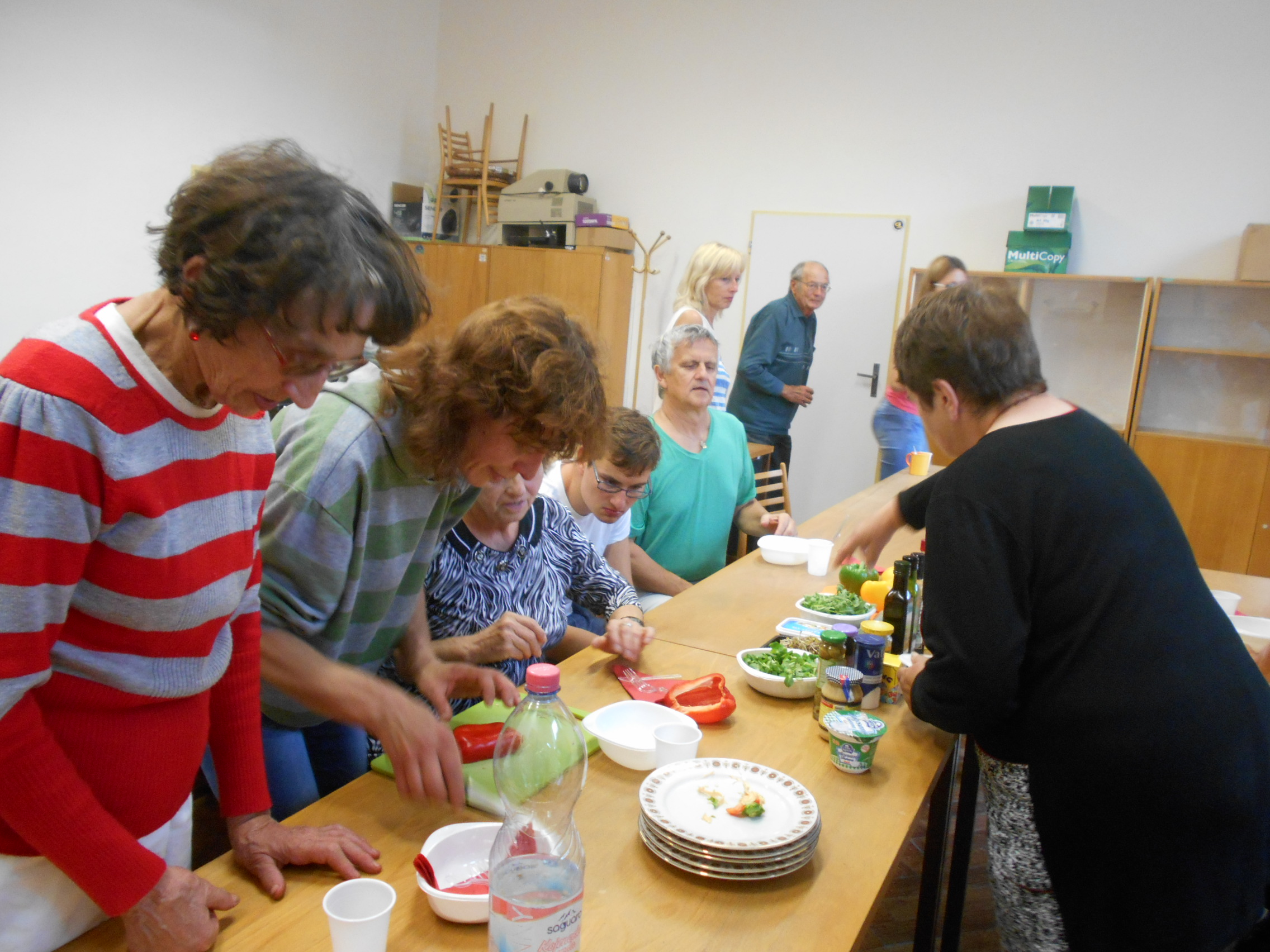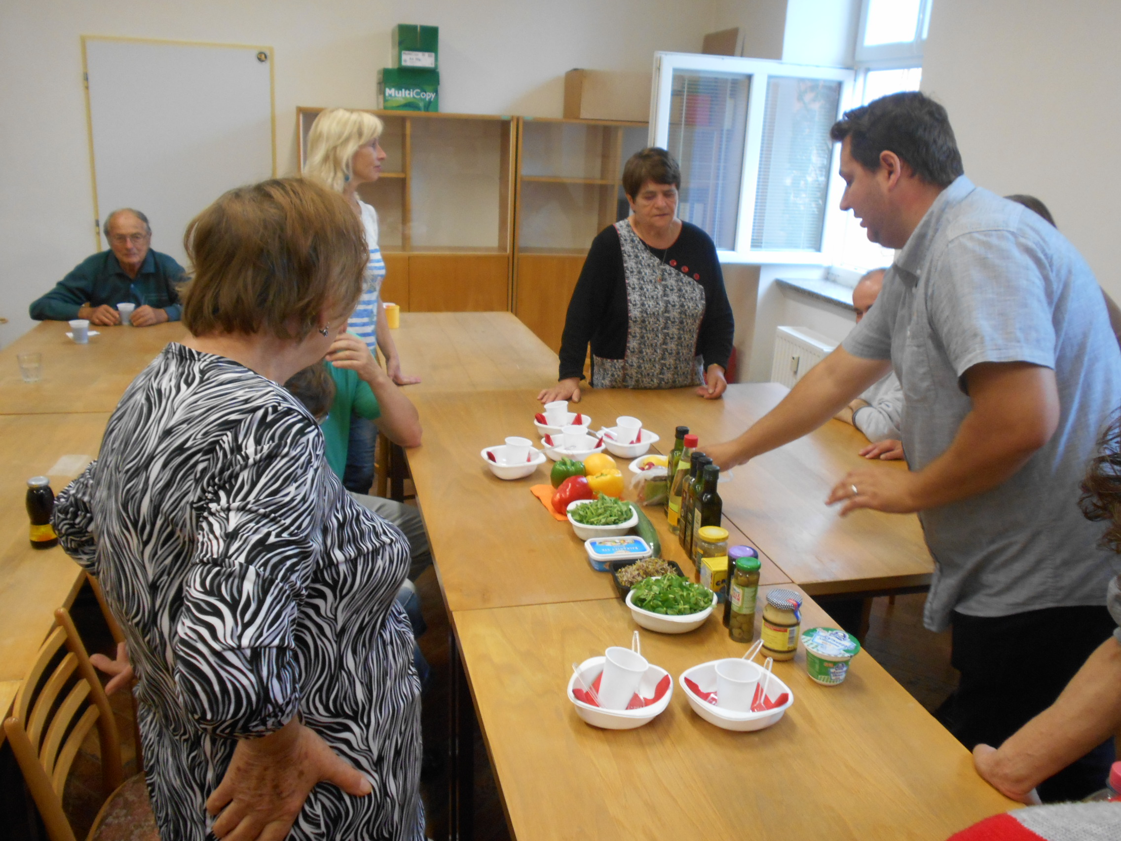 Poté jsme přivítali našeho hosta, kterým byl tentokrát pan Kavan ze společnosti Adaptech. Ten nám nejprve zběžně představil několik technických novinek z oblasti kompenzačních pomůcek pro zrakově postižené, a pak už jsme se věnovali hlavnímu bodu tohoto odpoledne, kterým byla soutěž v přípravě zeleninových salátů.