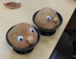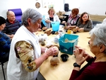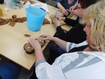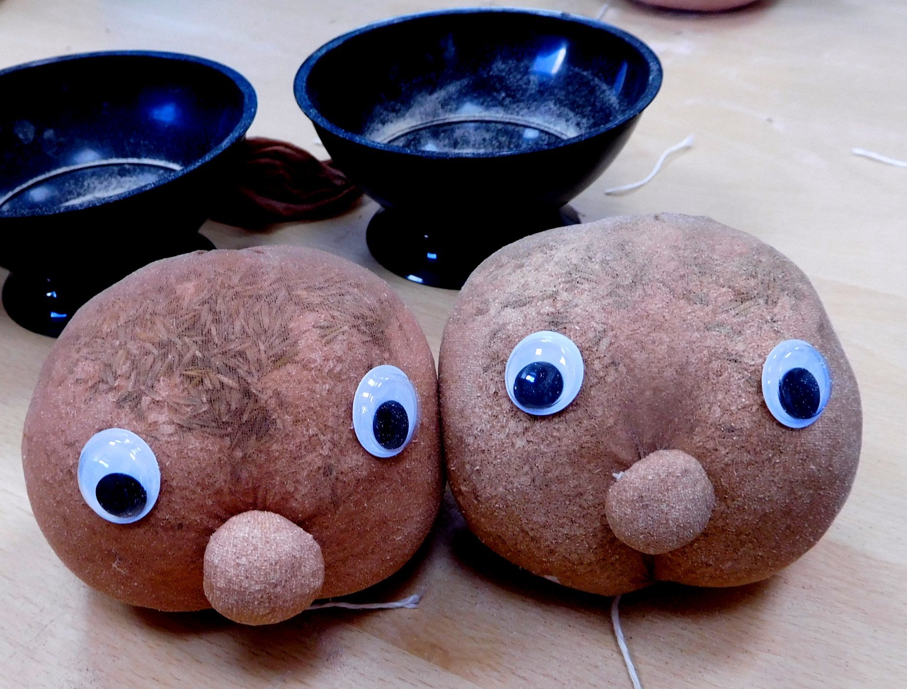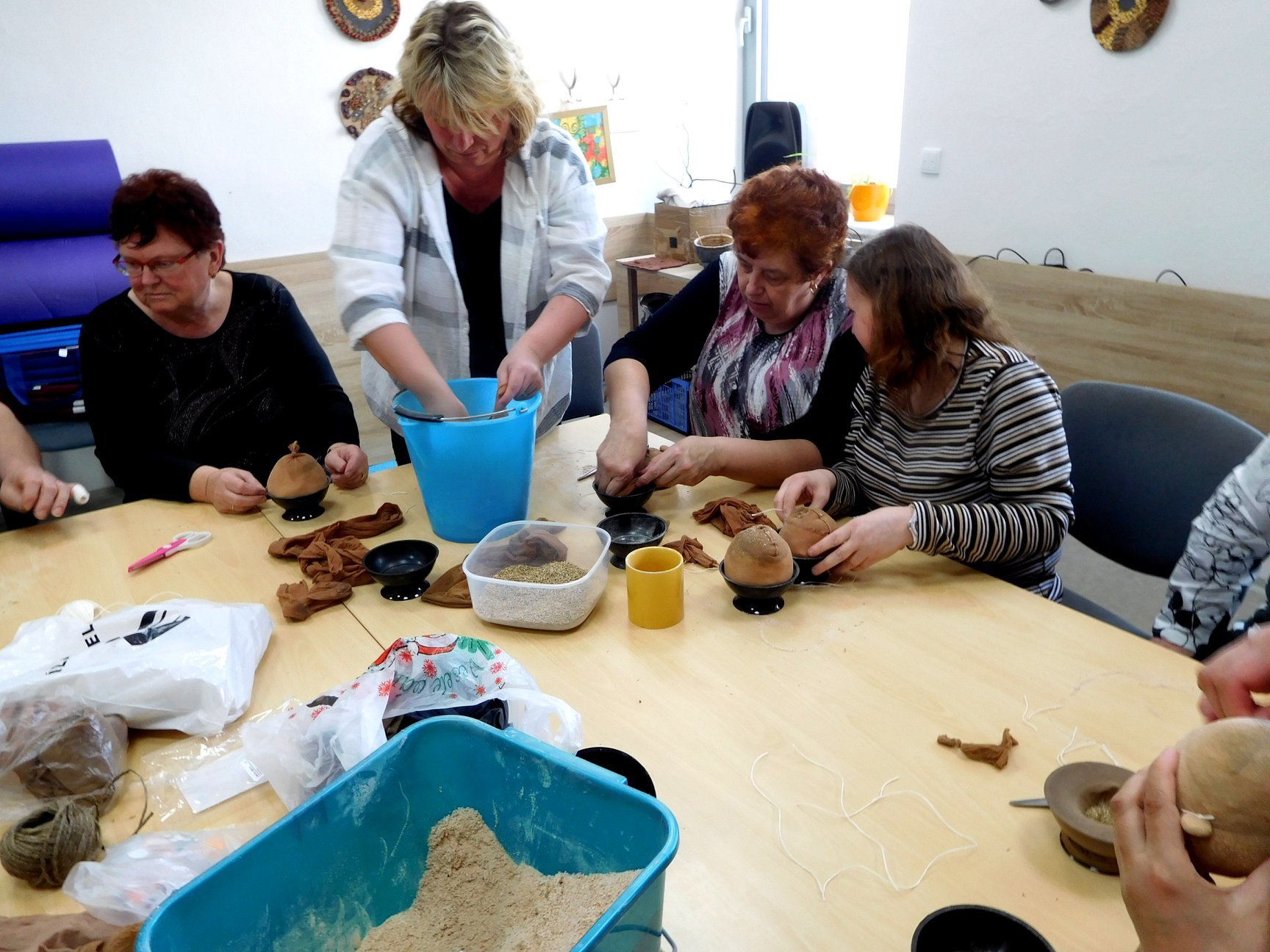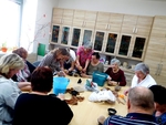 Vyráběli jsme Trávníčky. Takové klučíčí obličeje, kterým na hlavě vyraší vlasy - zelené jarní osení. S přípravou bylo nutné začít již brzo, protože nasbírat vhodné punčochy, ze kterých se hlavička tvarovala, v dnešní době kalhotové módy není tak jednoduché. Dále zajistit pytel pilin bylo snadné, když náš předseda se dřevem pracuje, pak jen obstarat travní semeno, pro zájemce - nejvhodnější se Hřišťová obnova a dát se do díla. Je jasné, že v momentě byly piliny všude, ale také spokojenost, radost ze zdařeného díla byla "slyšet" a "vidět". Je spousta věcí které lze snadno vyrobit, ale ne všechny pracovní postupy jsou vhodné pro zrakově postižené či nevidomé. A taky je třeba pečlivě vybírat postupy, volit materiály, aby práce byla bezpečná, snadná a zároveň prospěšná při neustálém tréninku procvičování jemné motoriky.