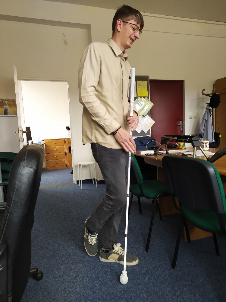 orientační, zvětšovací a čtecí pomůcky jako navigaci přímo v bílé holi, brýle s kamerou,