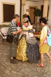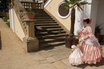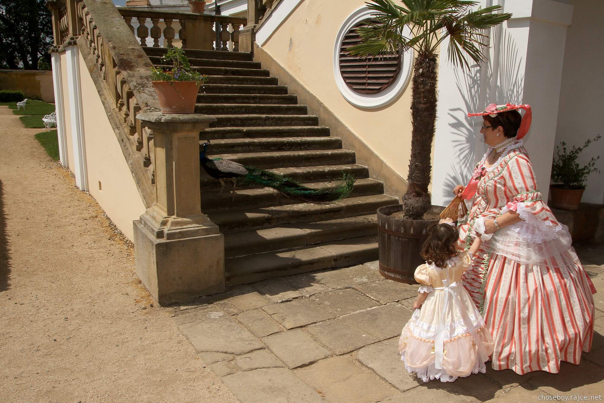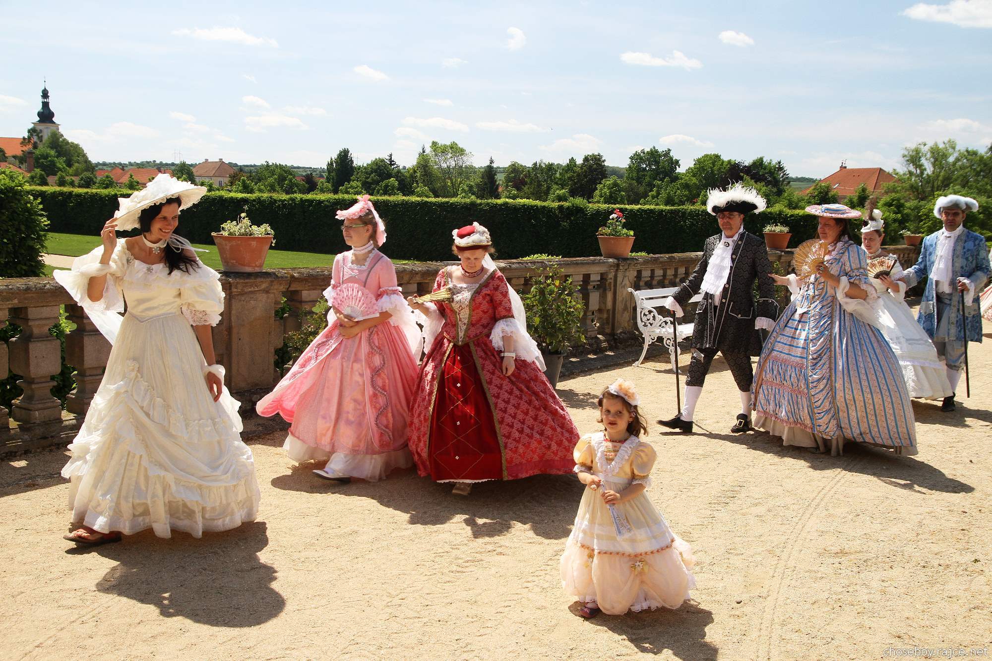 Dlouho jsme hledat nemuseli, zajeli jsme do zámku, všechny nechali obléct do barokních, rokokových či romantických kostýmů a rázem jsme tu měli skupinku 12ti hrabat, hraběnek a také jednu princezničku. A tak si naši úspěšní výtvarníci mohli nejen osahat kostým, na který většinou není dovoleno šahat, bílou hůl vyměnit za hraběcí špacírku, ale také vyzkoušet se promenádovat francouzskou zahradou, nádvořím zámku či oranžérii. A copak zjistili? Že to ti hrabata neměli až tak špatné a že asi nebyli nevidomí. Protože doprod s nevidomým měli k sobě příliž daleko díky krinolínám, nadýchaným sukním.