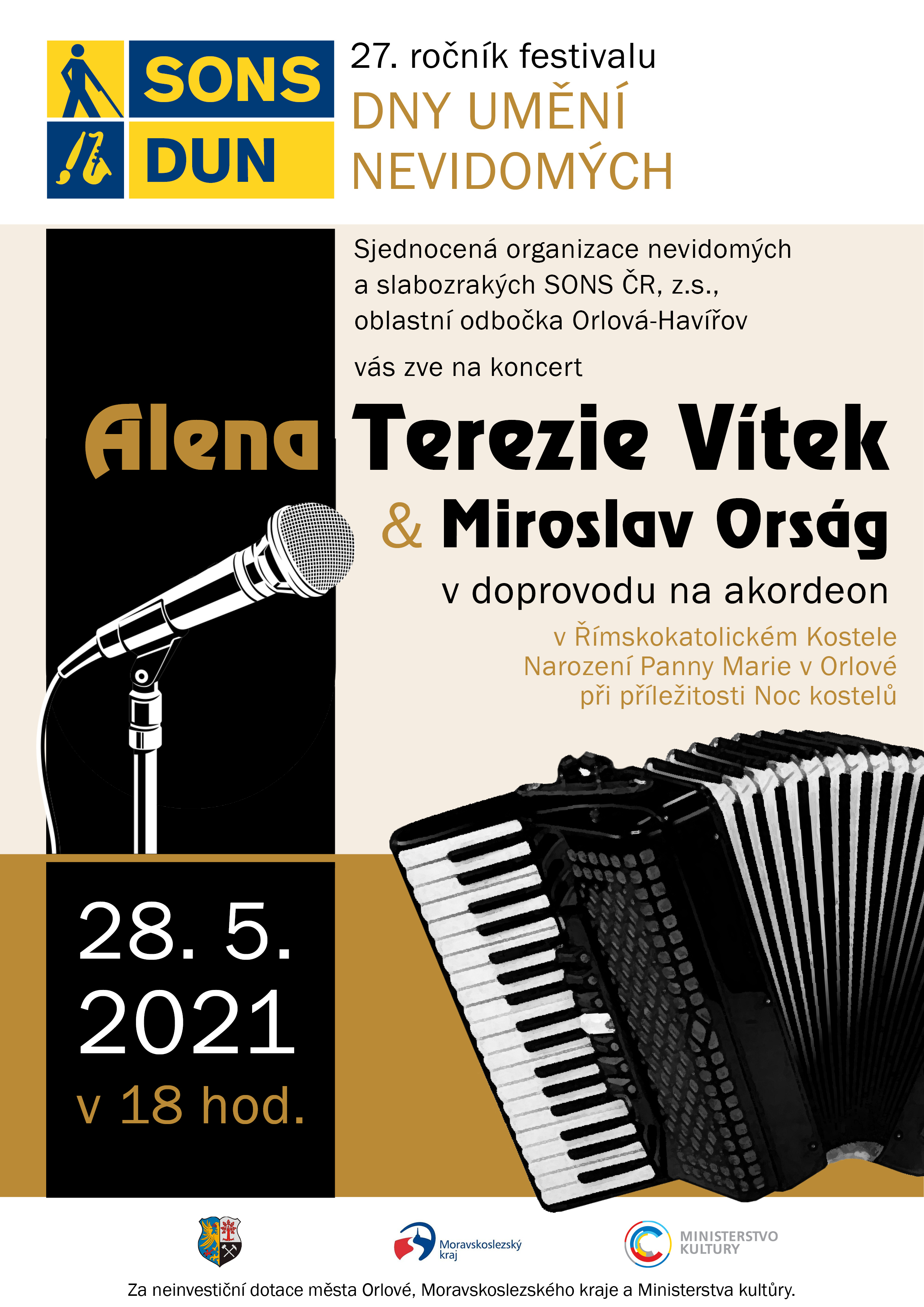 Dne 28.5.2021 se v kostele Narození Panny Marie v Orlové představí nevidomí zpěváci Alena Terezie Vítek a Miroslav Orság. Bližší informace naleznete na přiloženém plakátu.