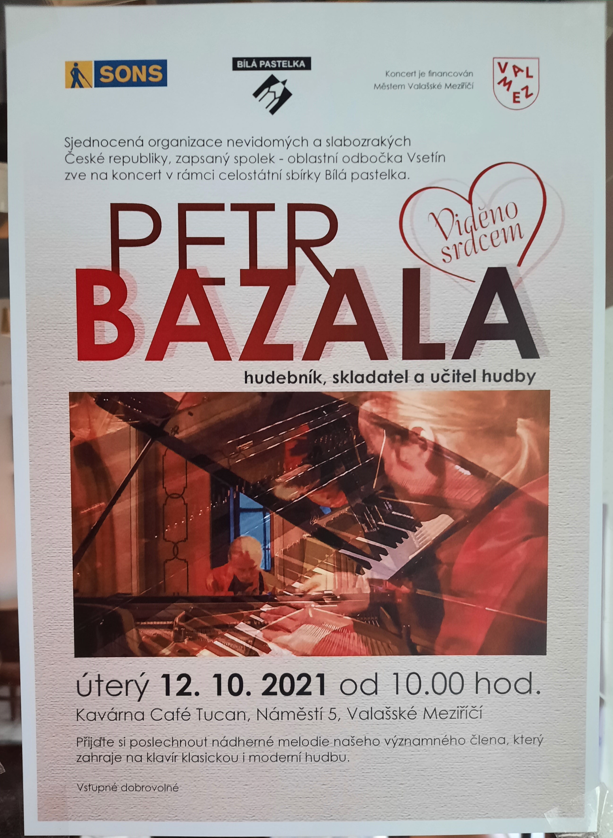 Dne 12.10.2021 se členové setkali ve Valašském Meziříčí v Café Tucan na koncertu Petra Bazaly pod názvem „Viděno srdcem ". Koncert byl uspořádán v rámci celostátní sbírky Bílá pastelka. Petr Bazala zahrál na klavír velmi pěkné melodie různého žánru ale i ze své vlastní tvorby. Členové si zároveň všechny písně pobrukovali, poté i zazpívali. Koncert se velmi vydařil, členové si zároveň o přestávce popovídali, zakoupili si bílou pastelku i kalendáře. Ocenili útulné prostředí kavárny i přes některé technické problémy, neboť kavárna se nachází na náměstí, které se v současné době revitalizuje. Setkání proběhlo ve velmi přátelském duchu. Vzhledem k tomu, že členové byli dlouho z důvodu pandemických opatření omezeni, vznesli požadavek takovéto setkání v brzké době zopakovat.