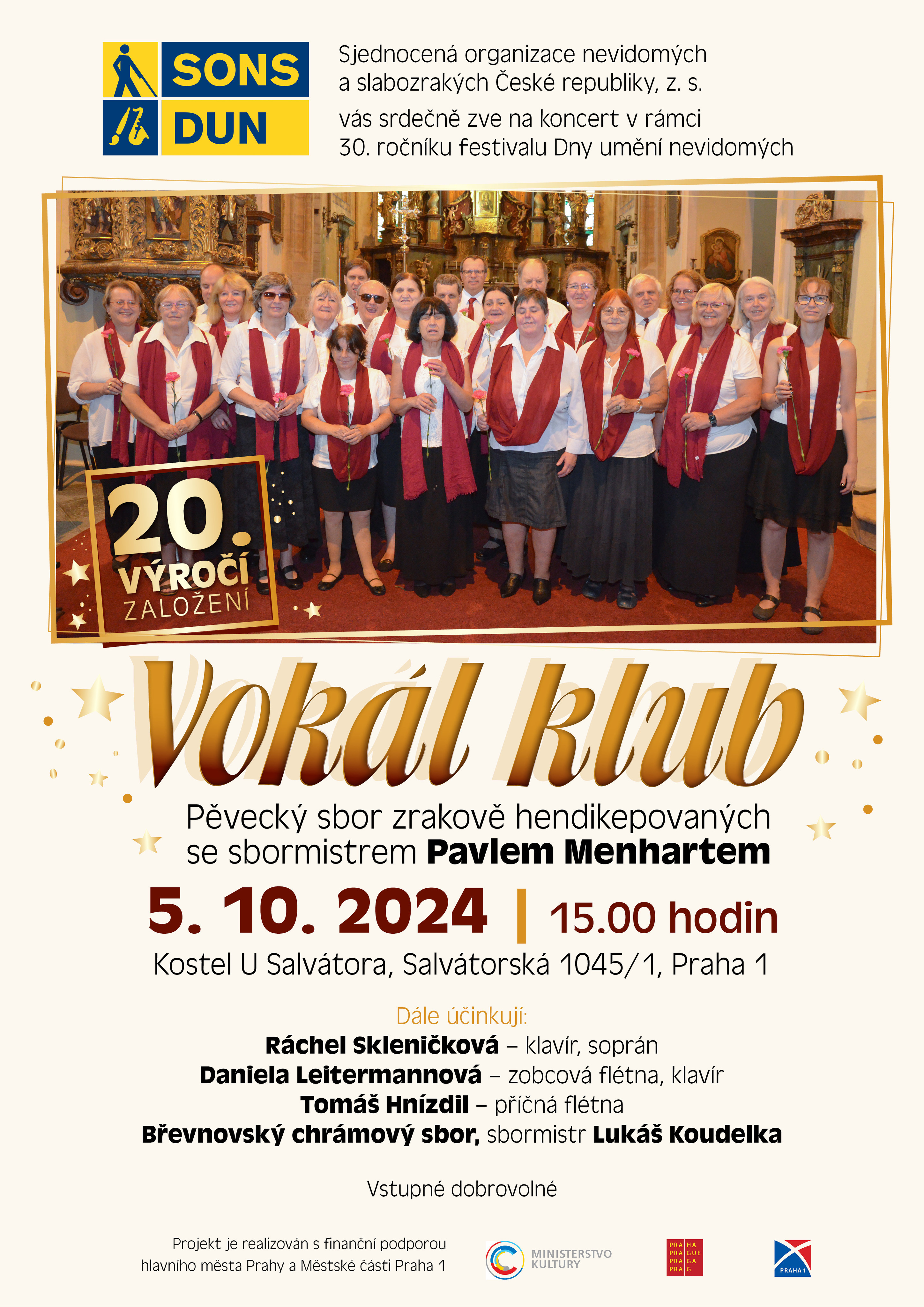 Zveme Vás na koncert pěveckého sboru zrakově handicapovaných Vokál klub, který se koná k 20. výročí jeho pěvecké činností.