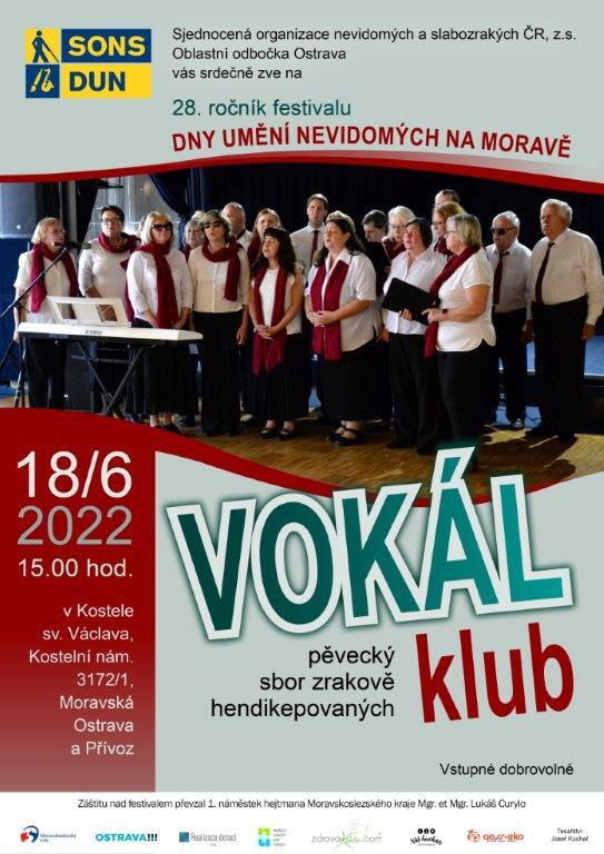Sjednocená organizace nevidomých a slabozrakých České republiky, z.s. - oblastní odbočka Ostrava vás zve v rámci 28. ročníku festivalu DNY UMĚNÍ NEVIDOMÝCH NA MORAVĚ na koncert VOKÁL klub, pěvecký sbor SONS, z.s. Koncert proběhne v Kostele sv. Václava v Ostravě od 15:00.