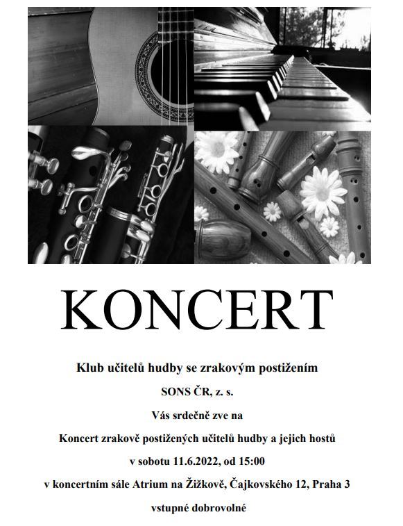 Klub učitelů hudby se zrakovým postižením SONS ČR, z. s. Vás srdečně zve na Koncert zrakově postižených učitelů hudby a jejich hostů v sobotu 11.6.2022, od 15:00 v koncertním sále Atrium na Žižkově, Čajkovského 12, Praha 3. Vstupné dobrovolné.