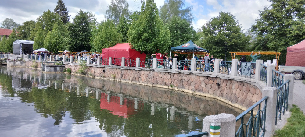 Místo konání vypadá jako taková dlouhá promenáda, z jejíž jedné strany je parčík s možností posezení na trávě, tedy pokud tam zrovna potřebu nekonal pejsek, za což bych páníčky ke stromům a hlavou dolů nad mraveniště přivazovala. Nebo v případě akcí na lavičkách a lavicích se stoly. Z druhé strany promenády je rybník s hromadou všetečných, hladových a zdá se, že i mírně ochočených kaprů. Ochočených proto, že tyhle zmatené vánoční pochoutky se naučily šmírovat lidi a shlukovat se pod nimi v hejnech kdykoli, když se na břehu zastaví byť jen na minutku. Protože lidi, jak ví každý kapr, s sebou nosí pečivo.