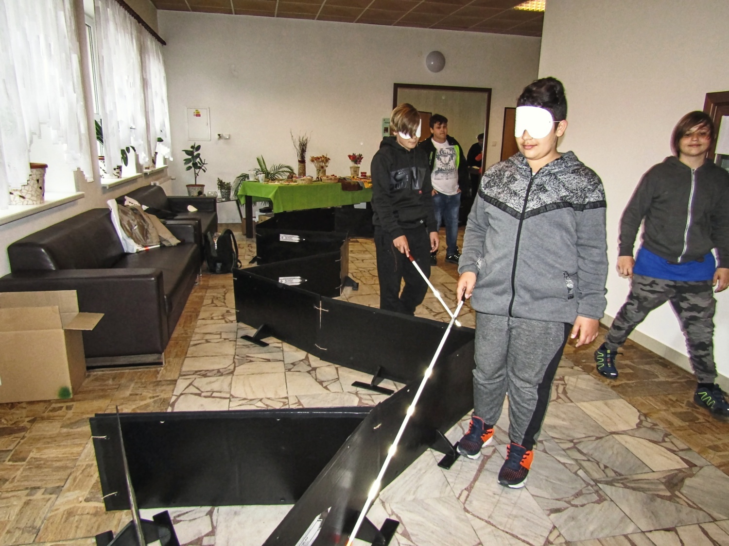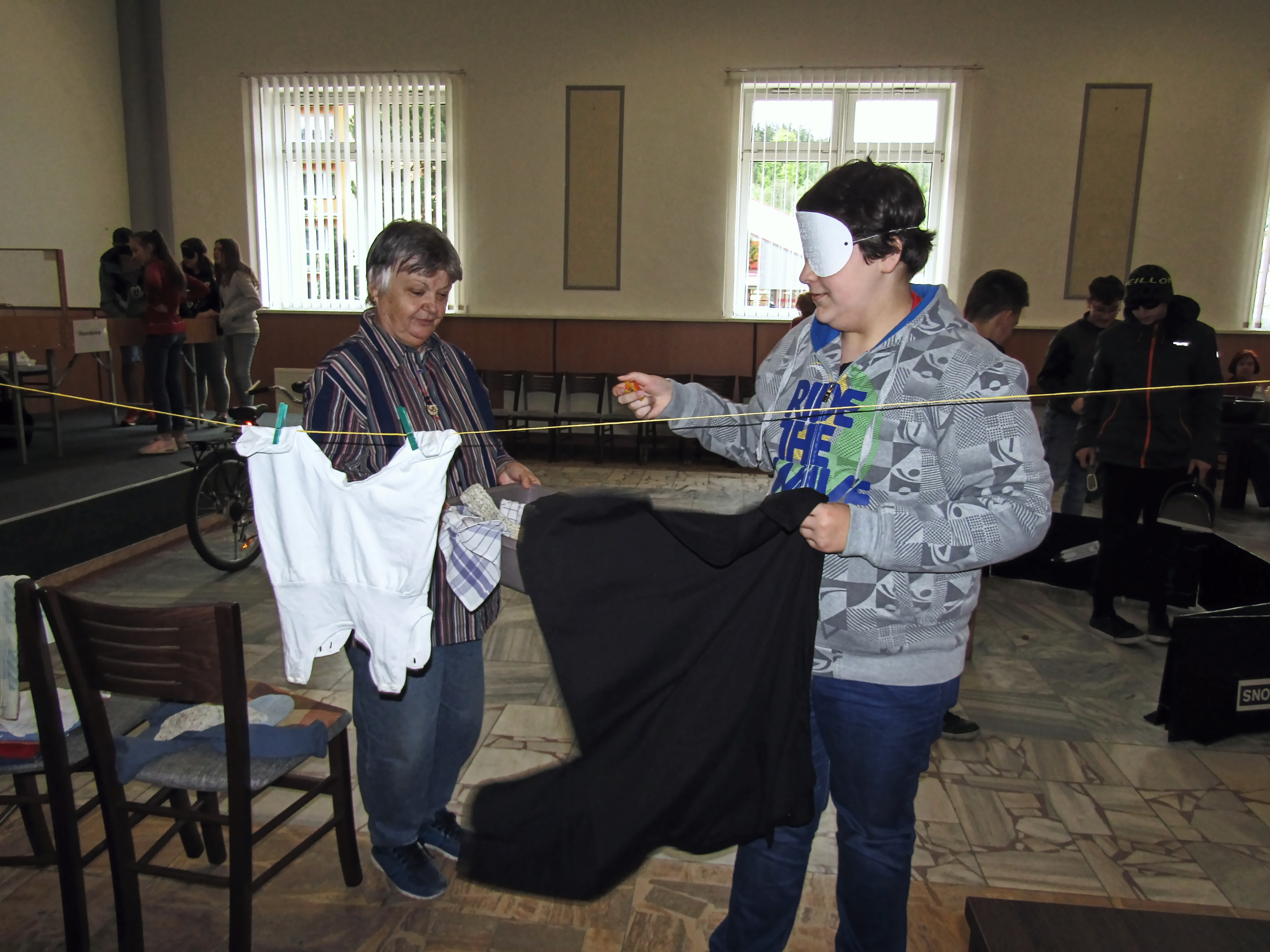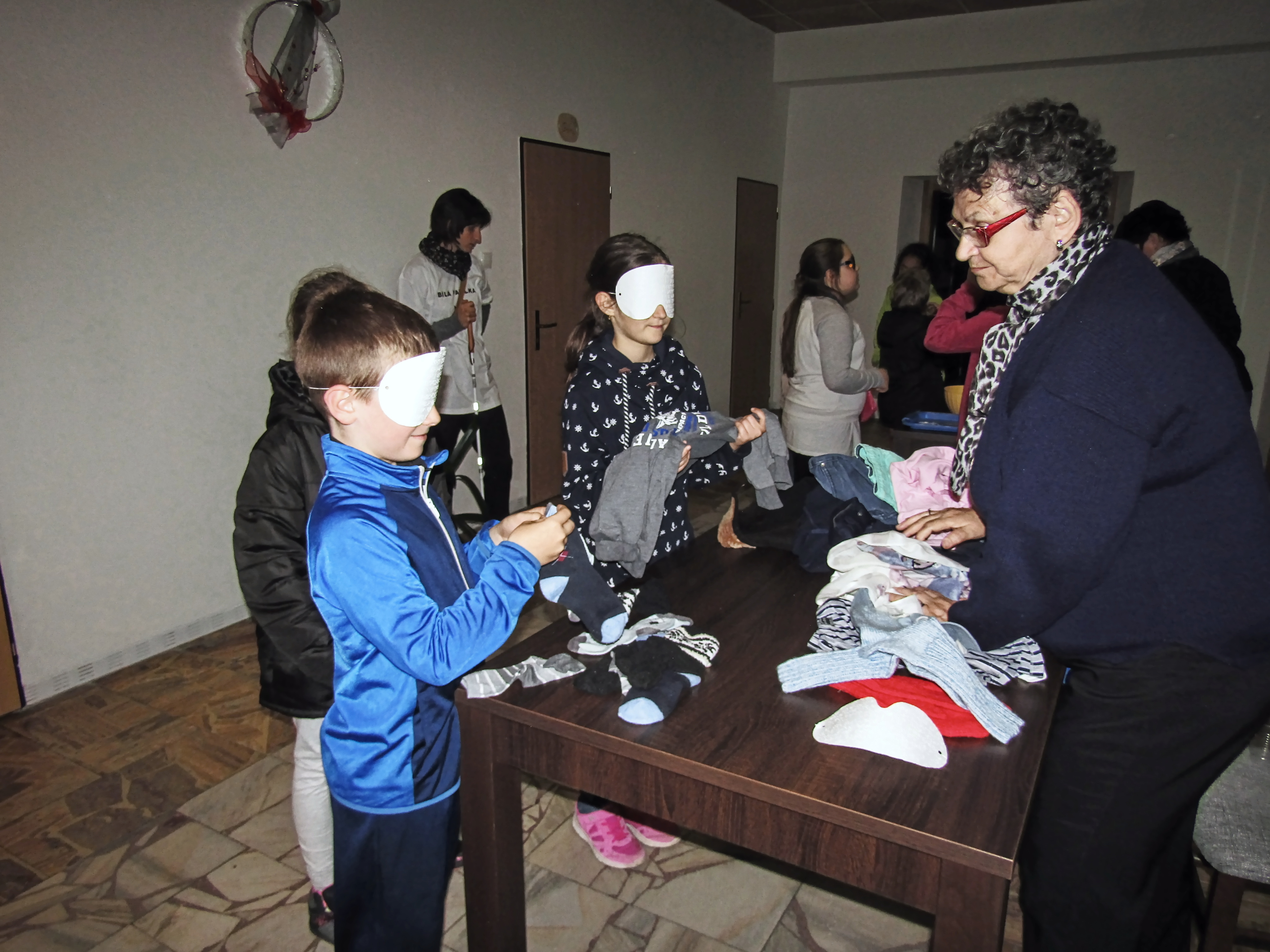 Začínalo se ránem, kdy si připravujeme snídani, pokračovalo se výběrem různého oblečení, chůzí s bílou holí po předem vyznačené trase, následovala ukázka kompenzačních pomůcek, třídění odpadů, zametání a úklid podlahy a nakonec příprava postele ke spaní. Tyto každodenní úkony byly doplněny o zábavné a sportovní aktivity jako jsou např. přizpůsobené stolní hry, střelba pomocí zvukem naváděné pistole, kuželky a mezi zrakově znevýhodněnými velmi oblíbený showdown neboli aplikovaný stolní tenis. A abychom umocnili zážitek z této akce, připravili jsme i tajemný pokoj, ve kterém jste mohli hledat jednu určitou ponožku v úplné tmě.