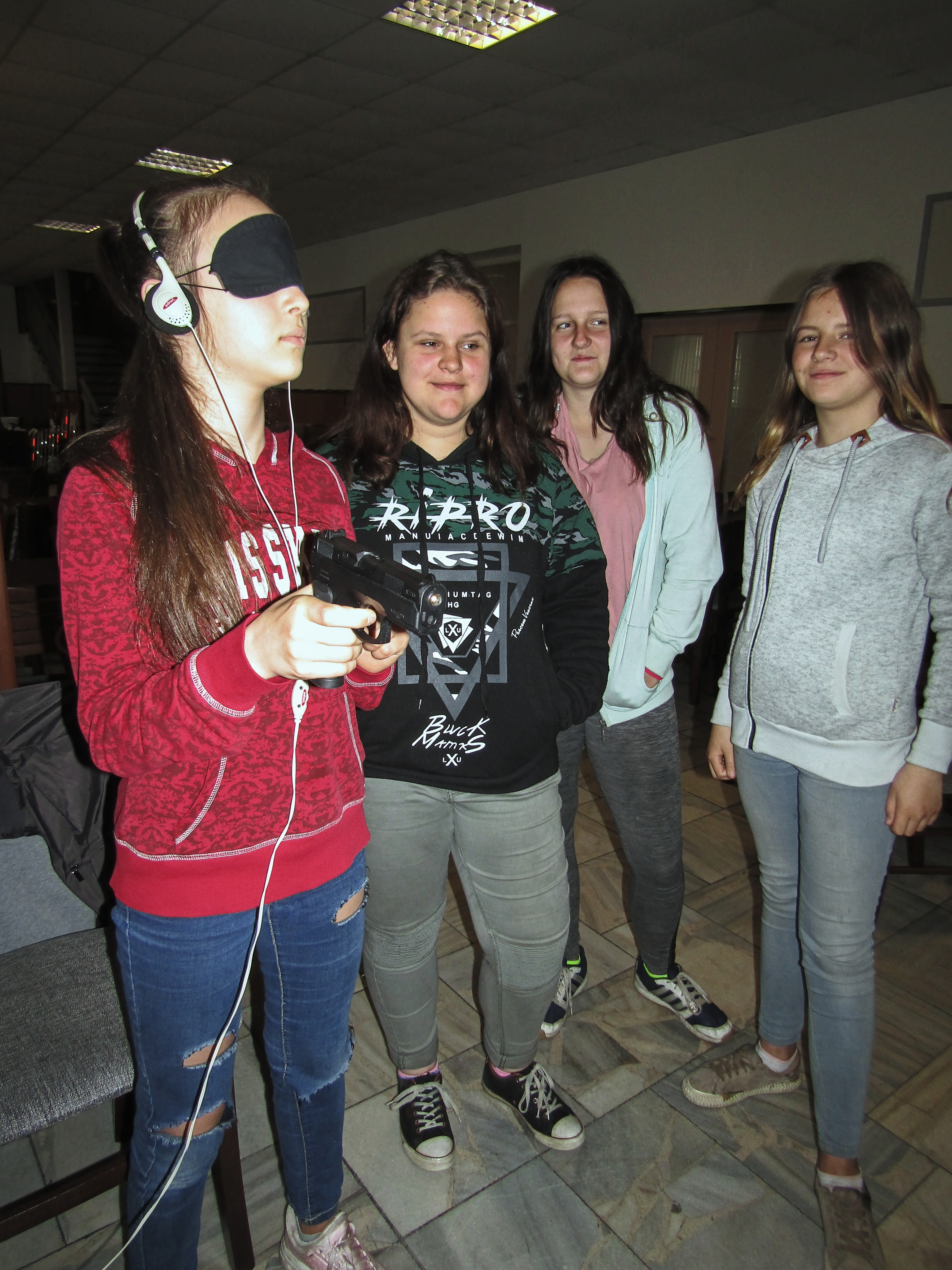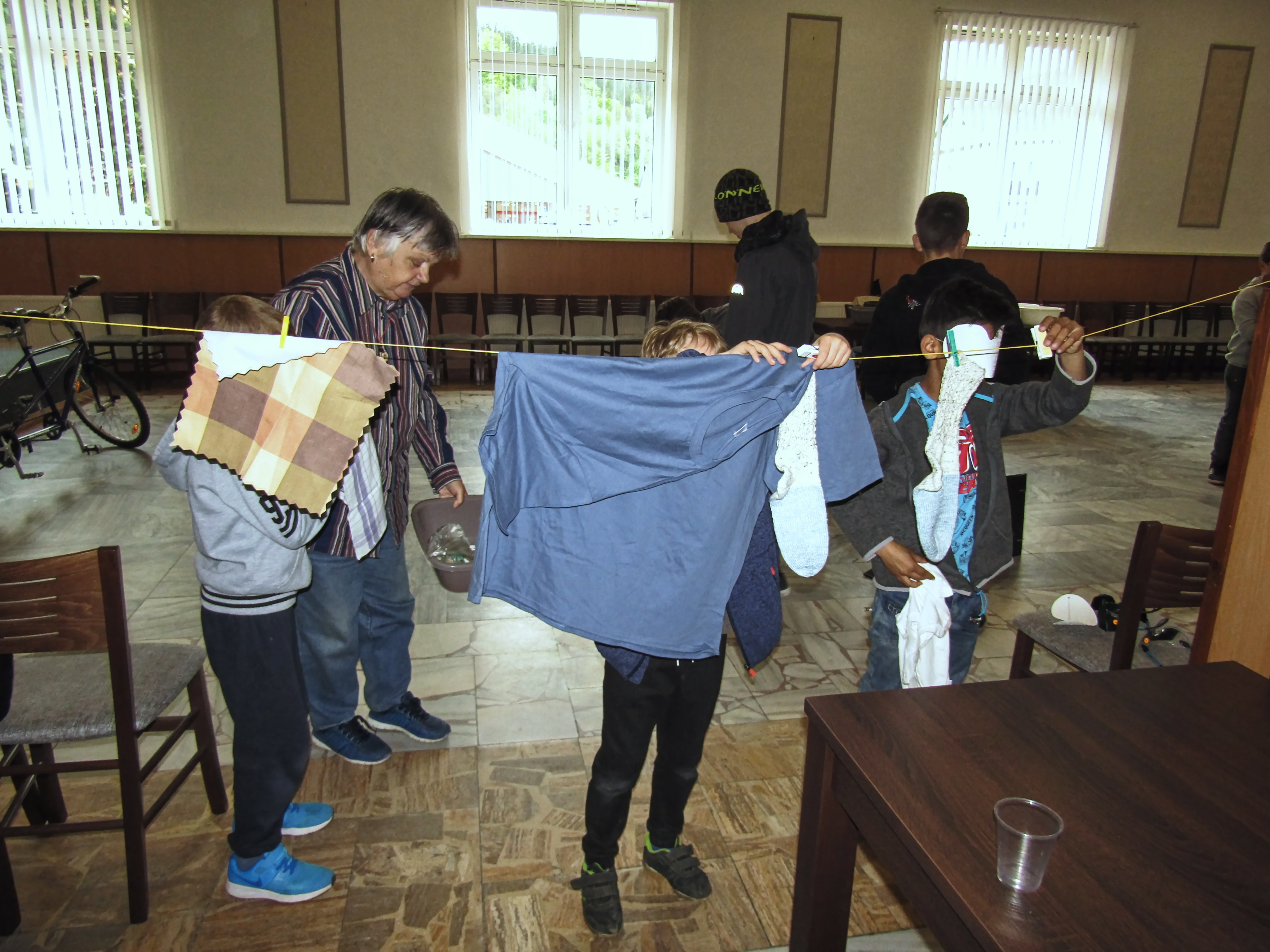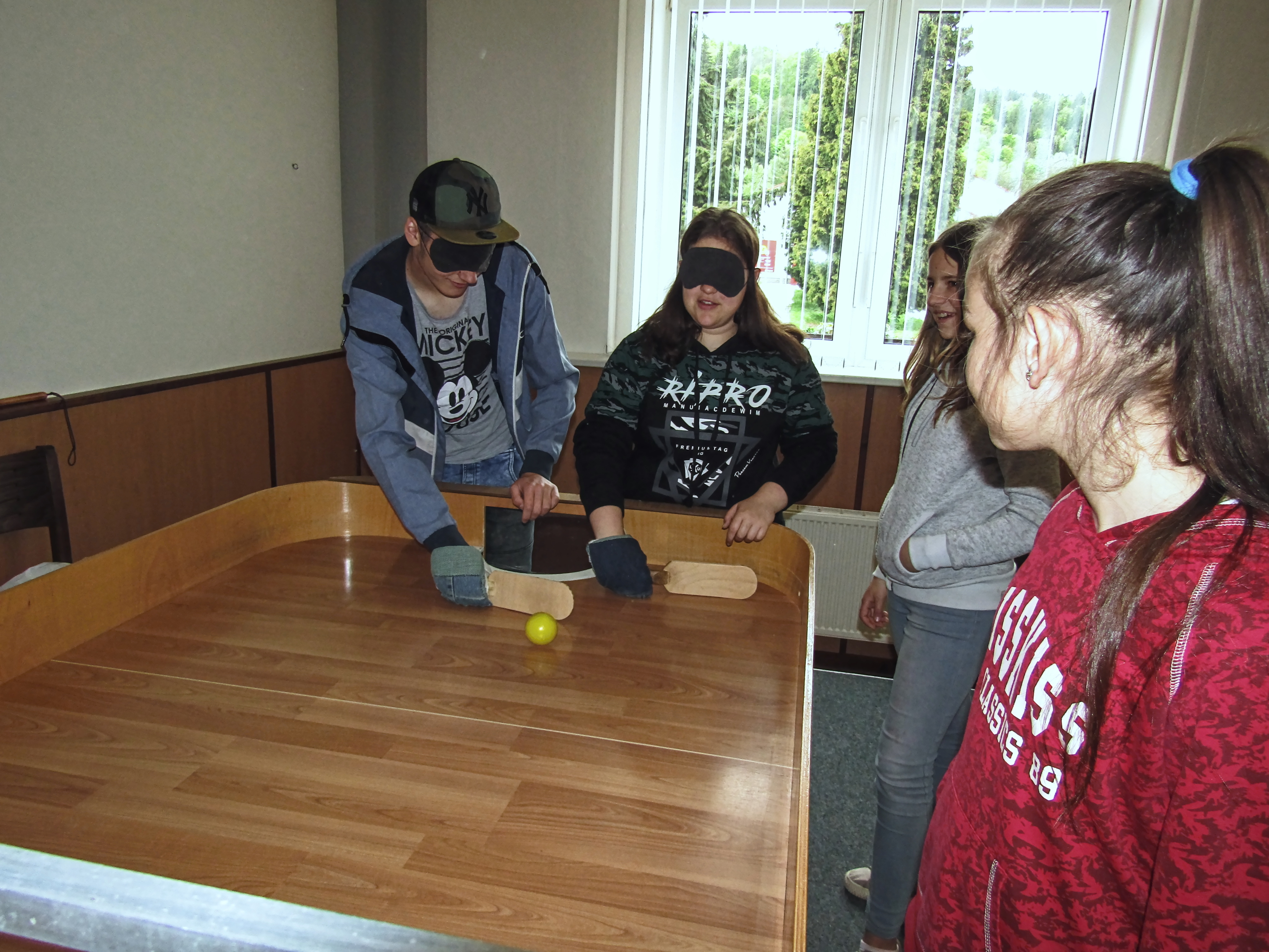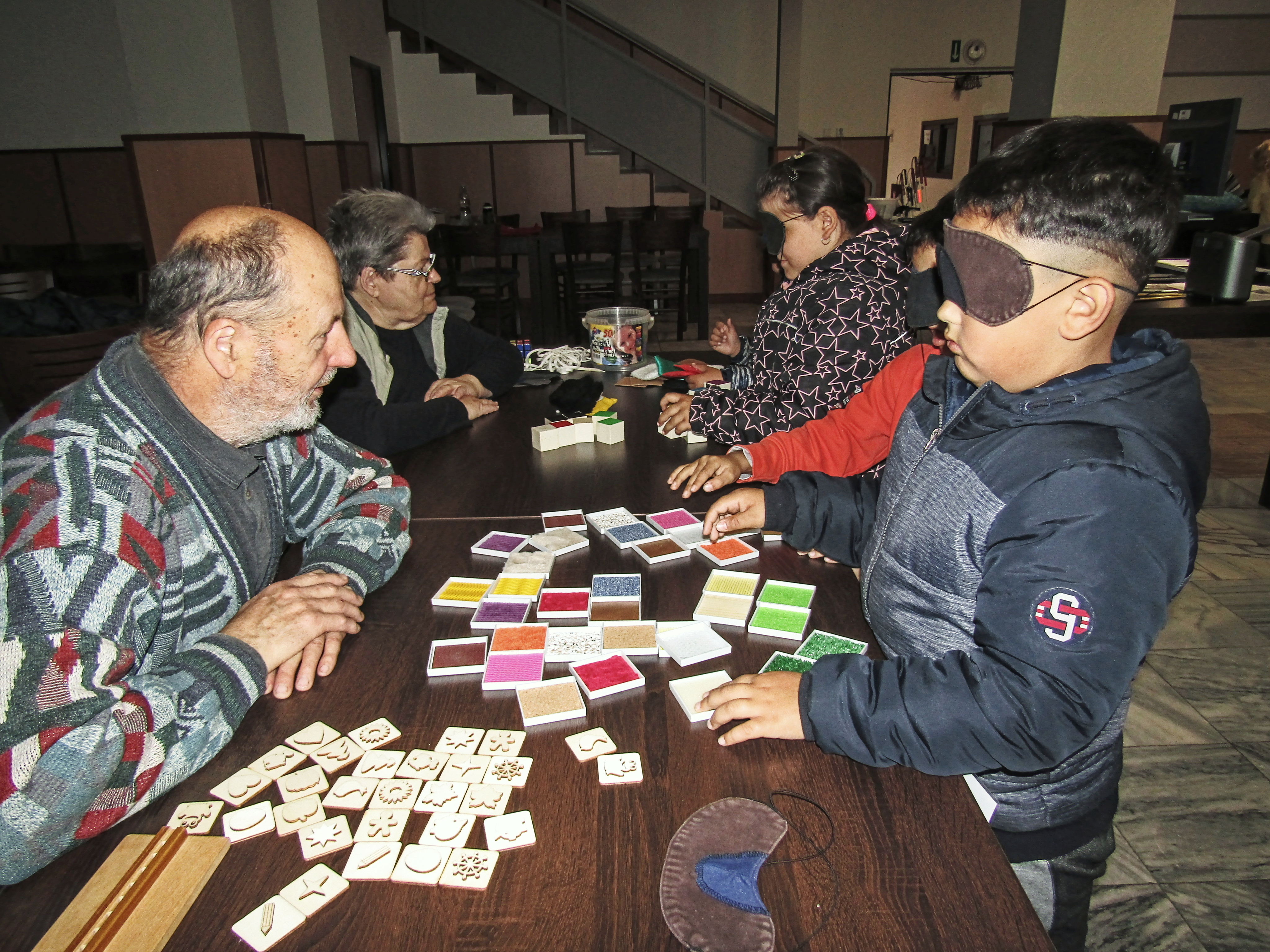 Začínalo se ránem, kdy si připravujeme snídani, pokračovalo se výběrem různého oblečení, chůzí s bílou holí po předem vyznačené trase, následovala ukázka kompenzačních pomůcek, třídění odpadů, zametání a úklid podlahy a nakonec příprava postele ke spaní. Tyto každodenní úkony byly doplněny o zábavné a sportovní aktivity jako jsou např. přizpůsobené stolní hry, střelba pomocí zvukem naváděné pistole, kuželky a mezi zrakově znevýhodněnými velmi oblíbený showdown neboli aplikovaný stolní tenis. A abychom umocnili zážitek z této akce, připravili jsme i tajemný pokoj, ve kterém jste mohli hledat jednu určitou ponožku v úplné tmě.