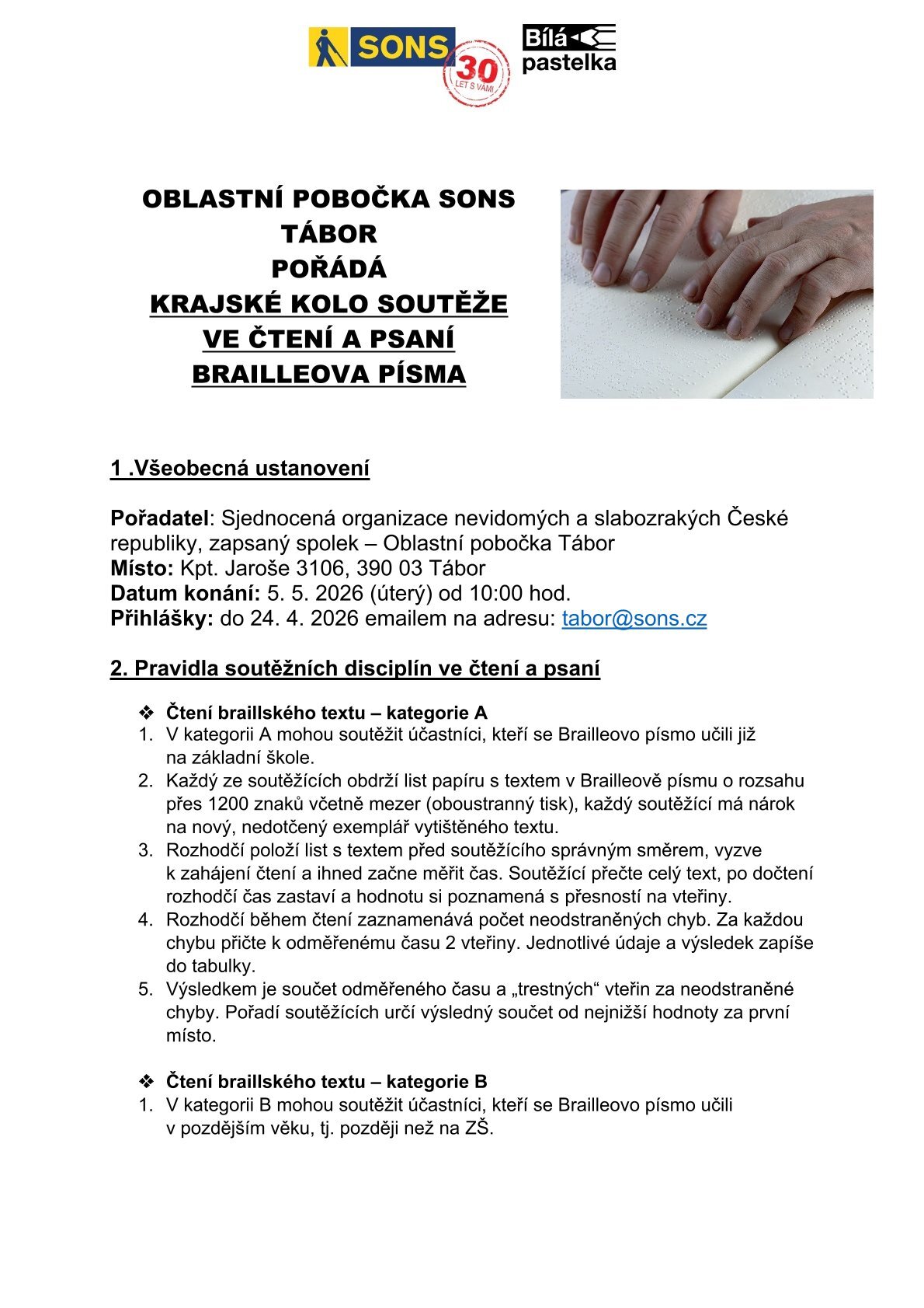 V úterý 5. května táborský SONS pořádá krajské kolo soutěže ve čtení a psaní Brailleova písma. Těšíme se na Vás.