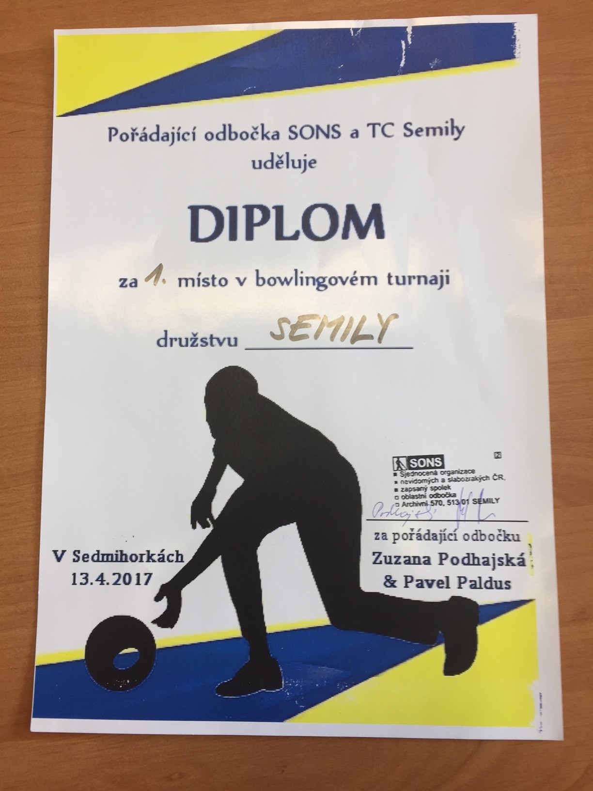 Ve čtvrtek 13. 4., se konal v Sedmihorkách krajský přebor v bowlingu, kterého se zúčastnily a utkaly se spolu, všechny odbočky SONS ČR libereckého kraje, tj. Česká Lípa, Jablonec nad Nisou, Liberec, Semily a TyfloCentrum Liberec, o. p. s.,
