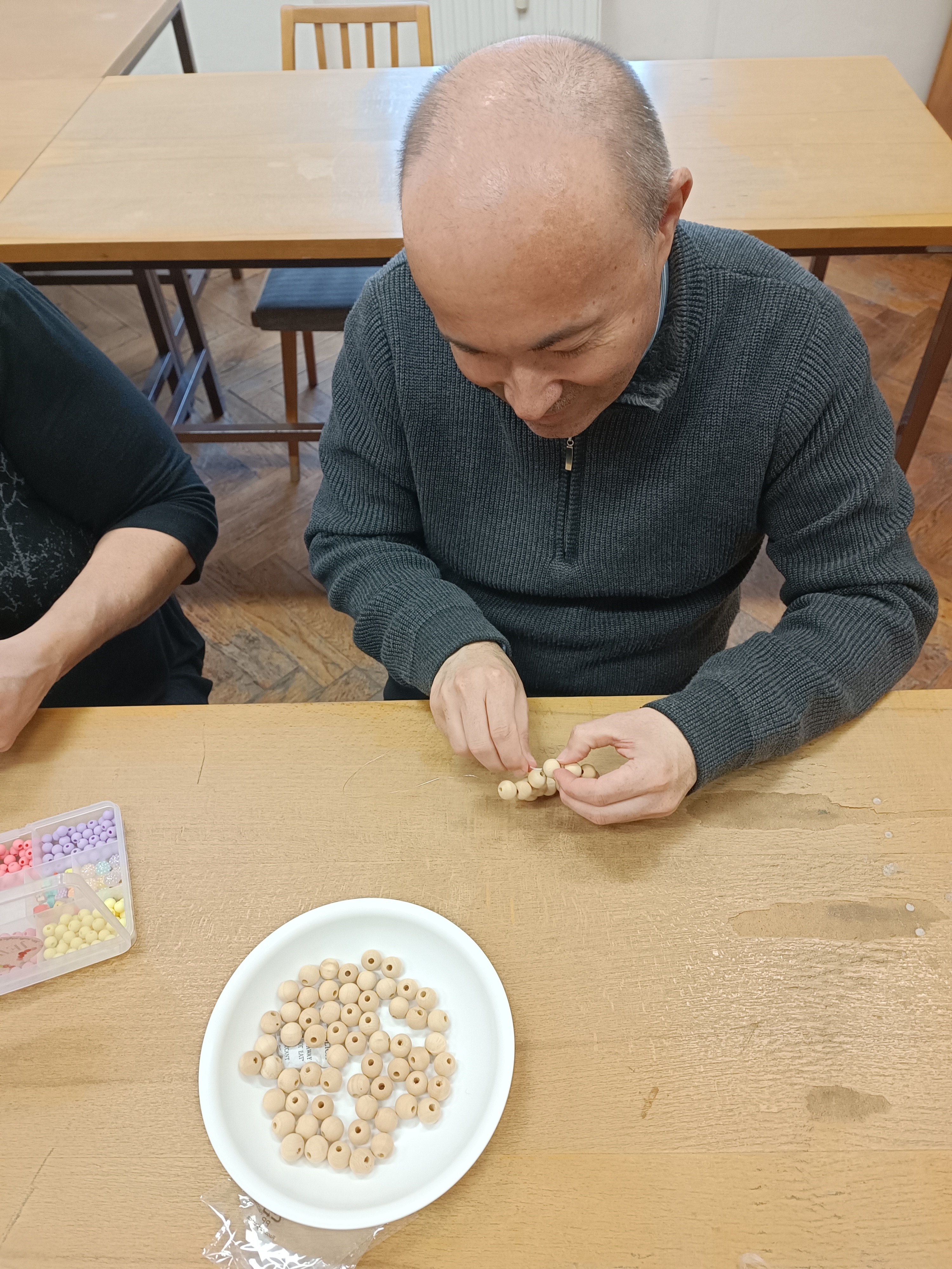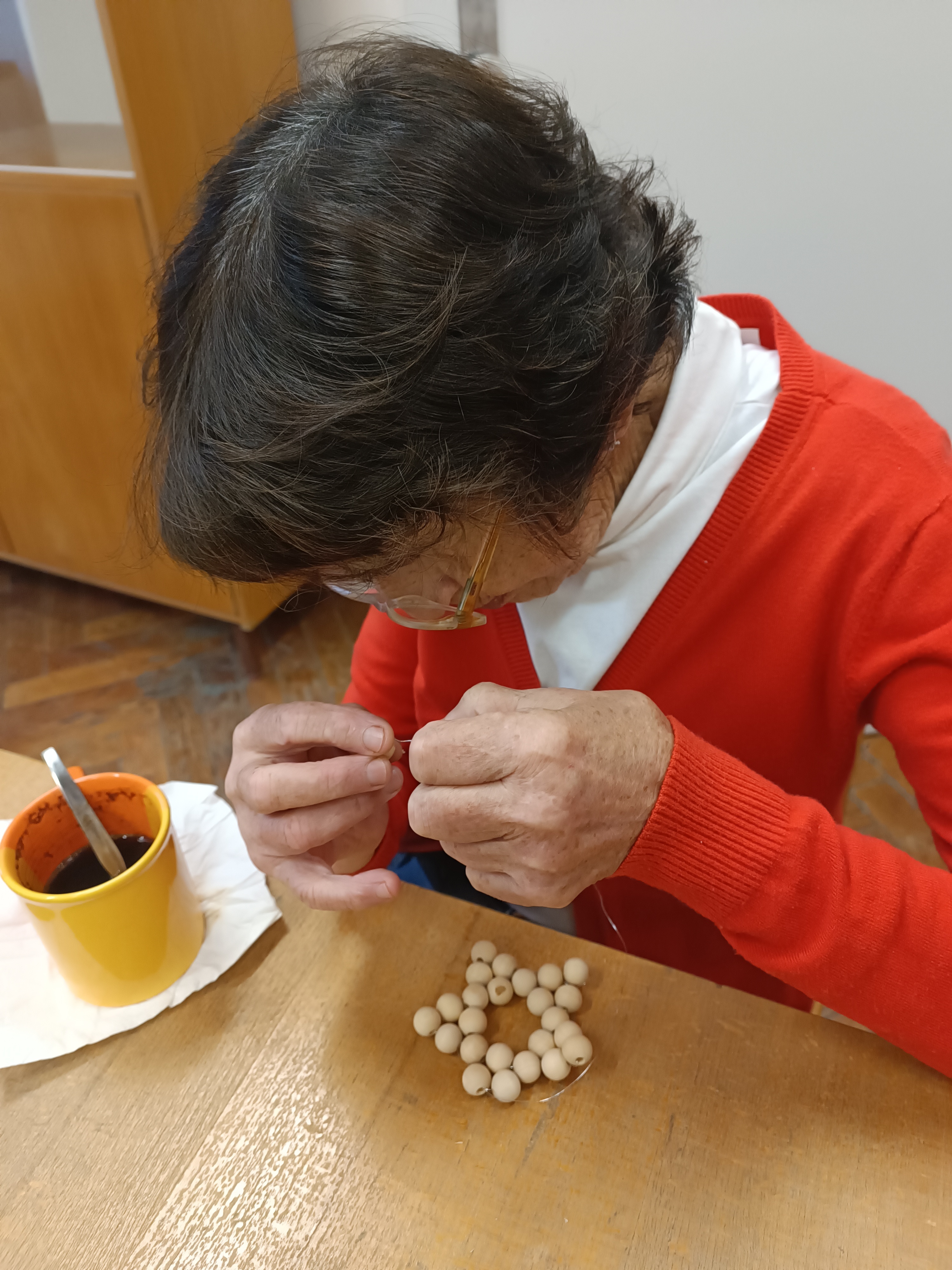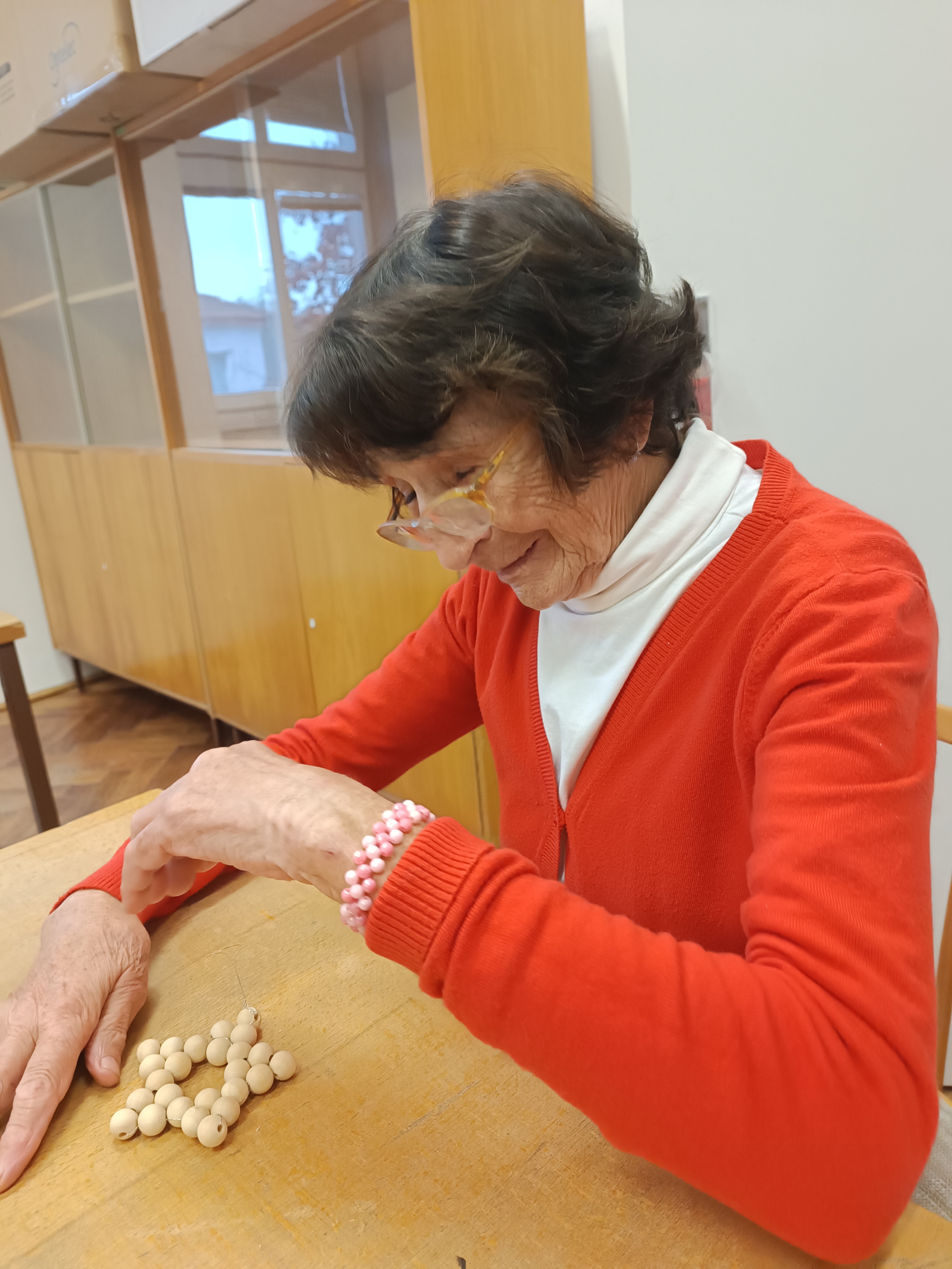 Během příjemně stráveného zábavného dopoledne jsme si vlastnoručně vyrobili vánoční ozdoby z různobarevných a dřevěných korálků navlékaných na tenký drát vázaných do pěti a šesticípých hvězd a korálkové náramky z menších korálků navlékaných a vázaných na pružný vlasec do jednoduchého vzoru, barevně sladěných dle vkusu a nálady každého z účastníků tvoření.