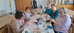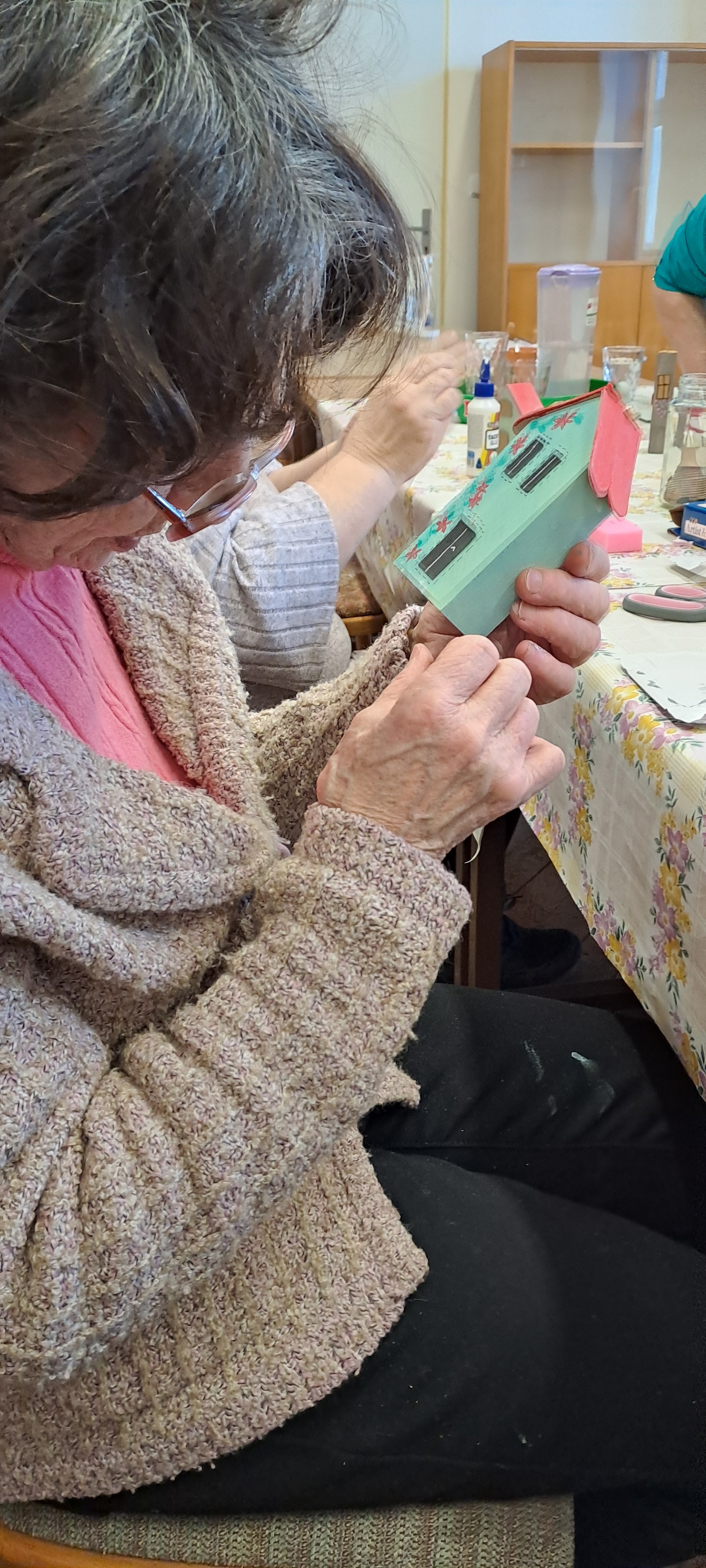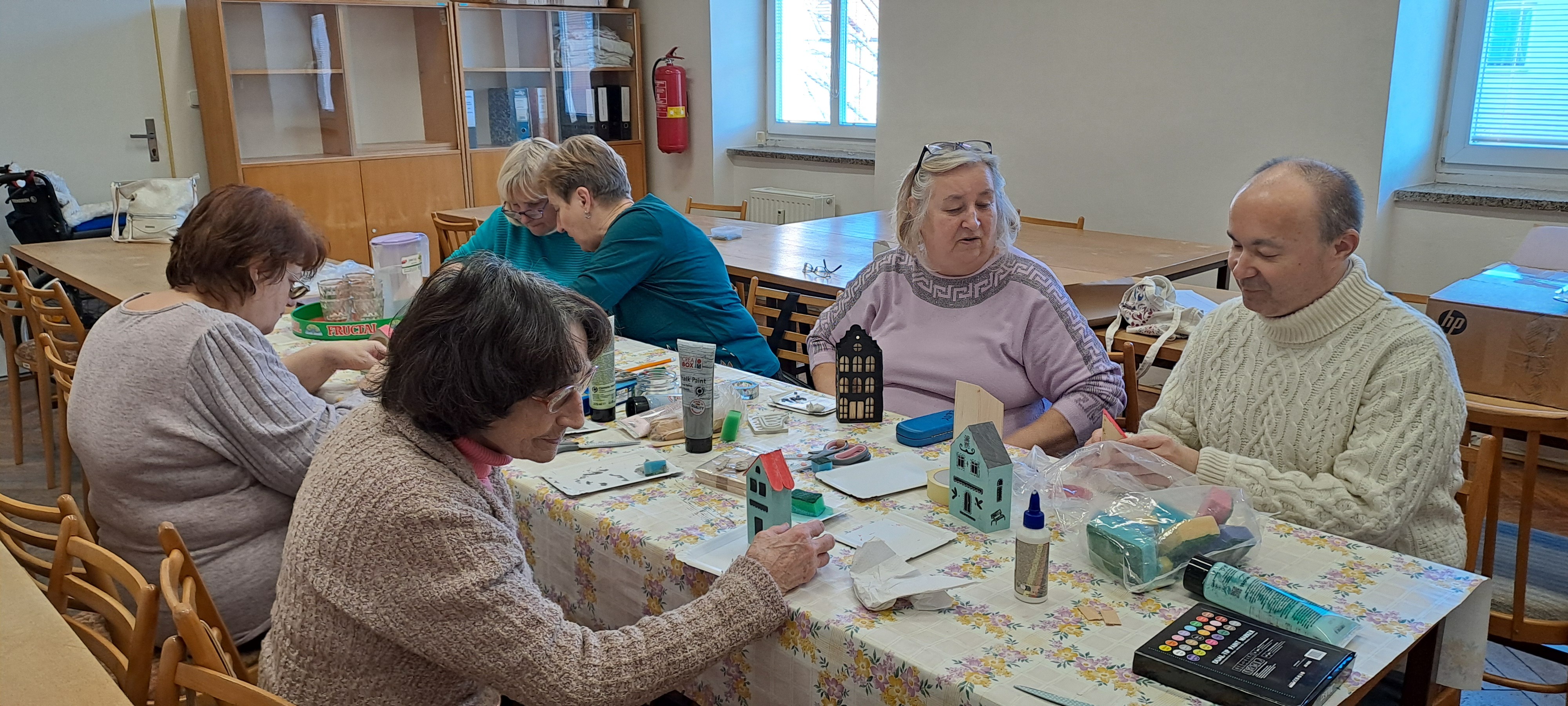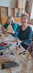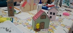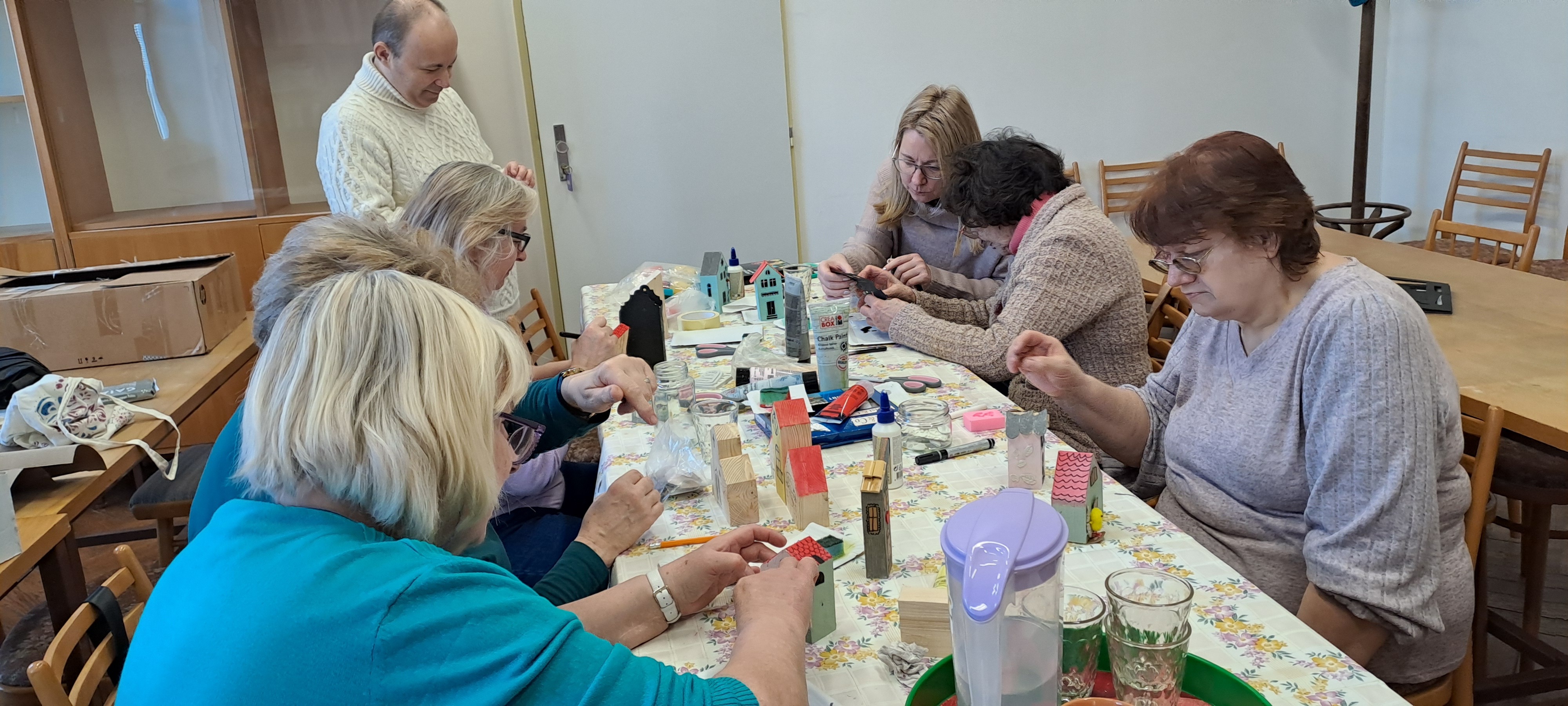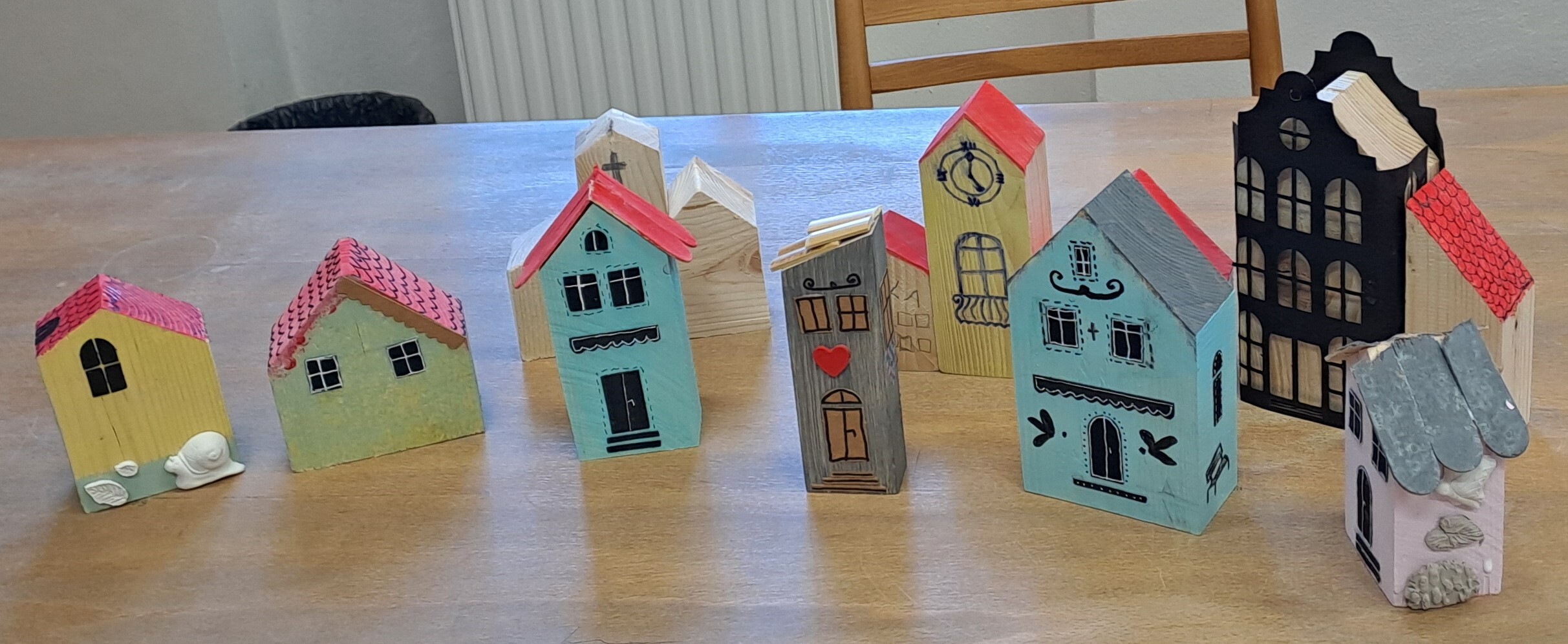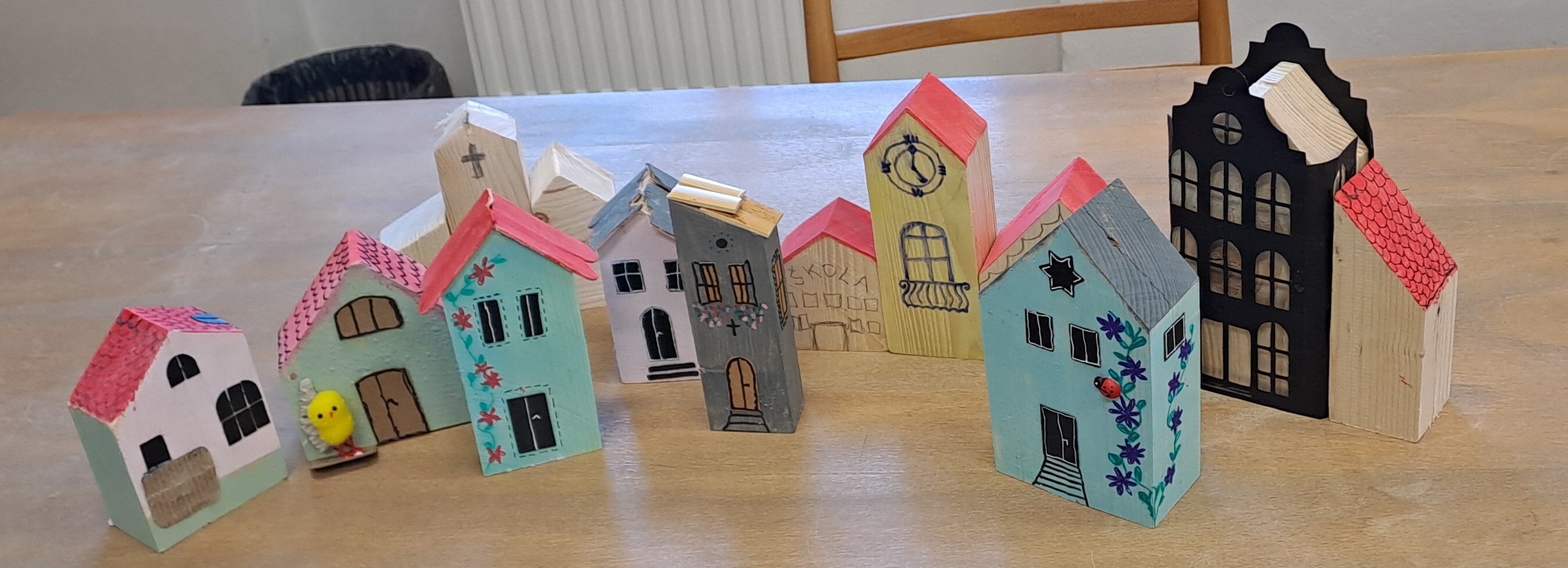 S využitím křídových barev a dekorativních doplňků z papíru a samotvrdnoucí modelovací hmoty vznikaly v šikovných rukou našich členů chaloupky se zahrádkou, stodola, radnice, kostel či škola ze kterých jsme závěrem tohoto tvoření postavili barevné dřevěné městečko.