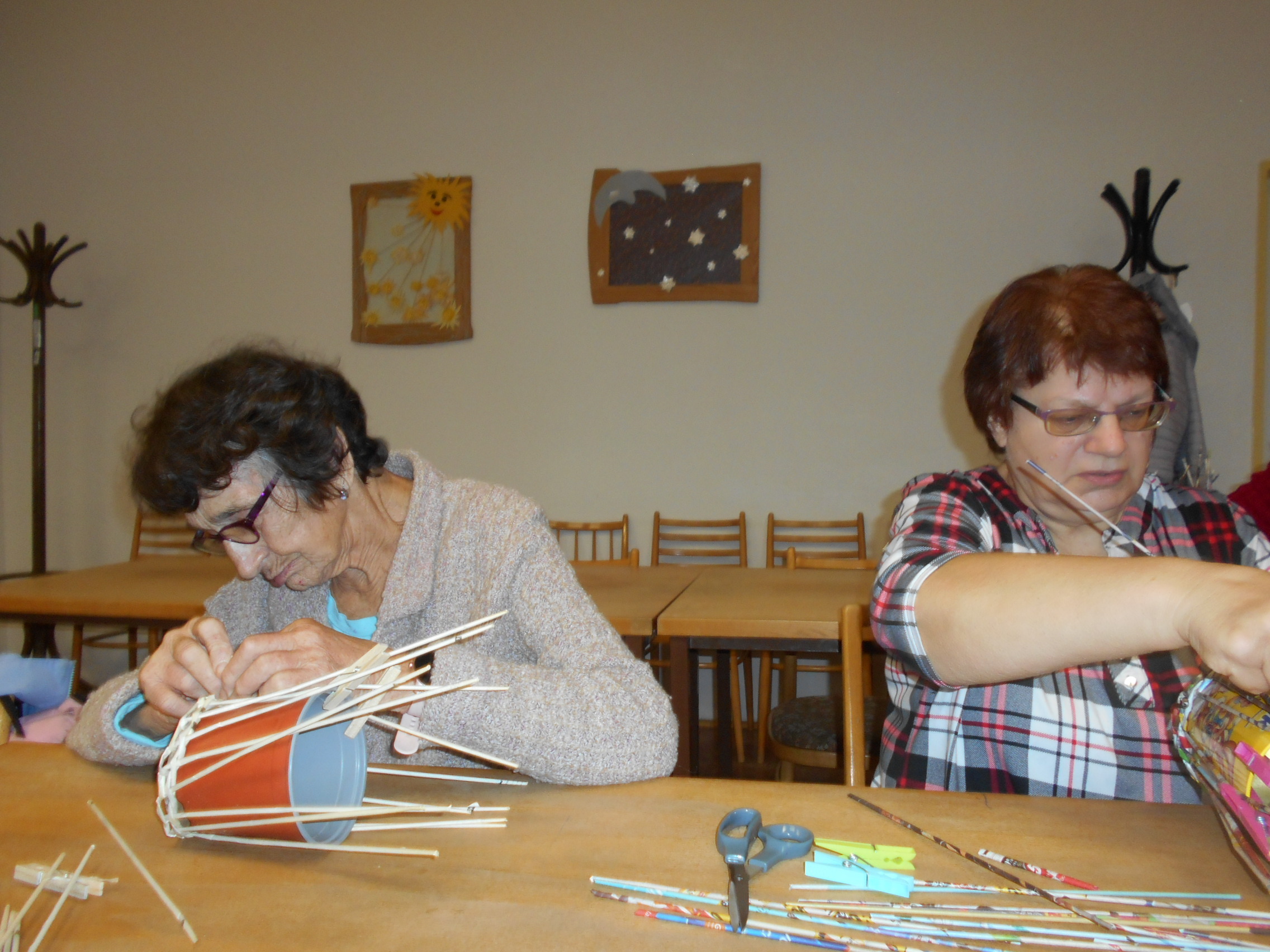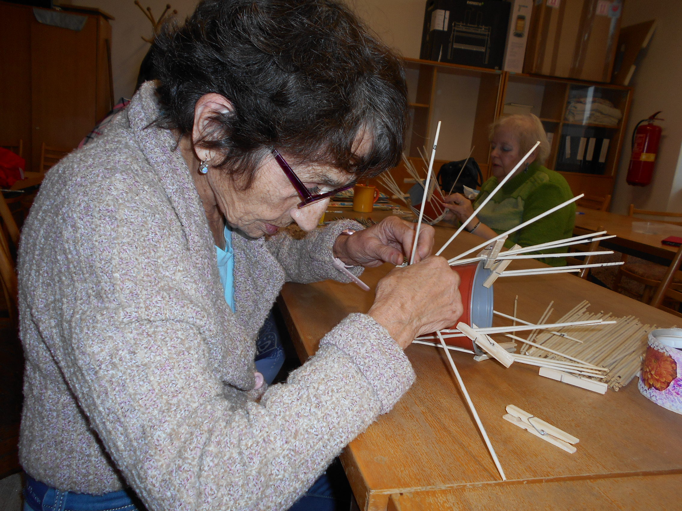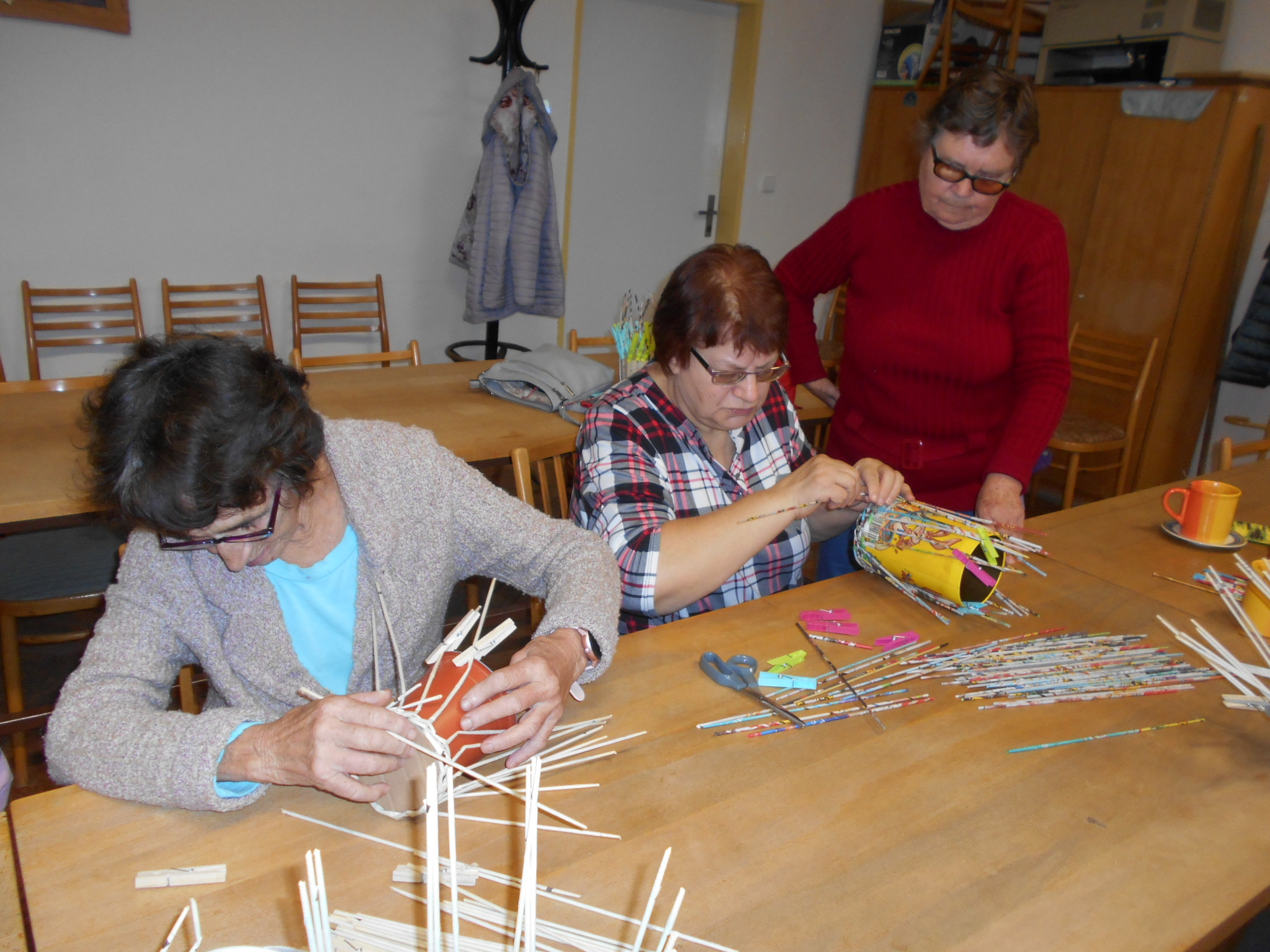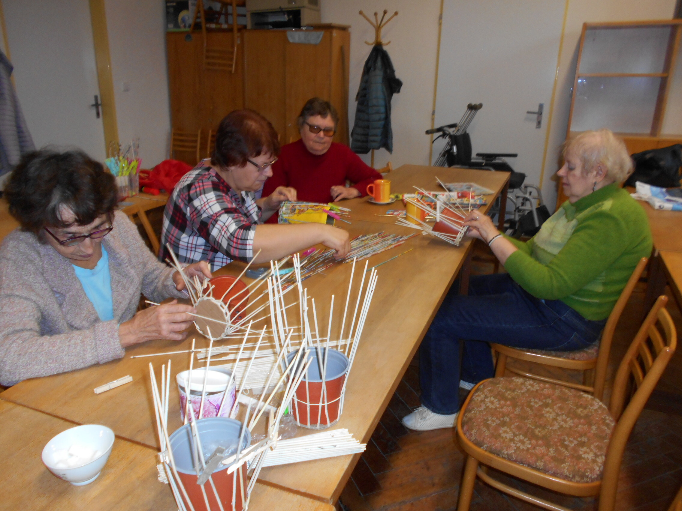 K práci jsme použili květináče, na kterých jsme si mohli vyzkoušet základní vzory pletení. Z počátku jsme procvičili spíše svou trpělivost, ale za chvíli se nám začalo dařit a pletení rychle přibývalo. Domů jsme si odnesli skoro hotové výrobky, které dokončíme na příštím kreativním dopoledni.