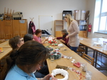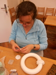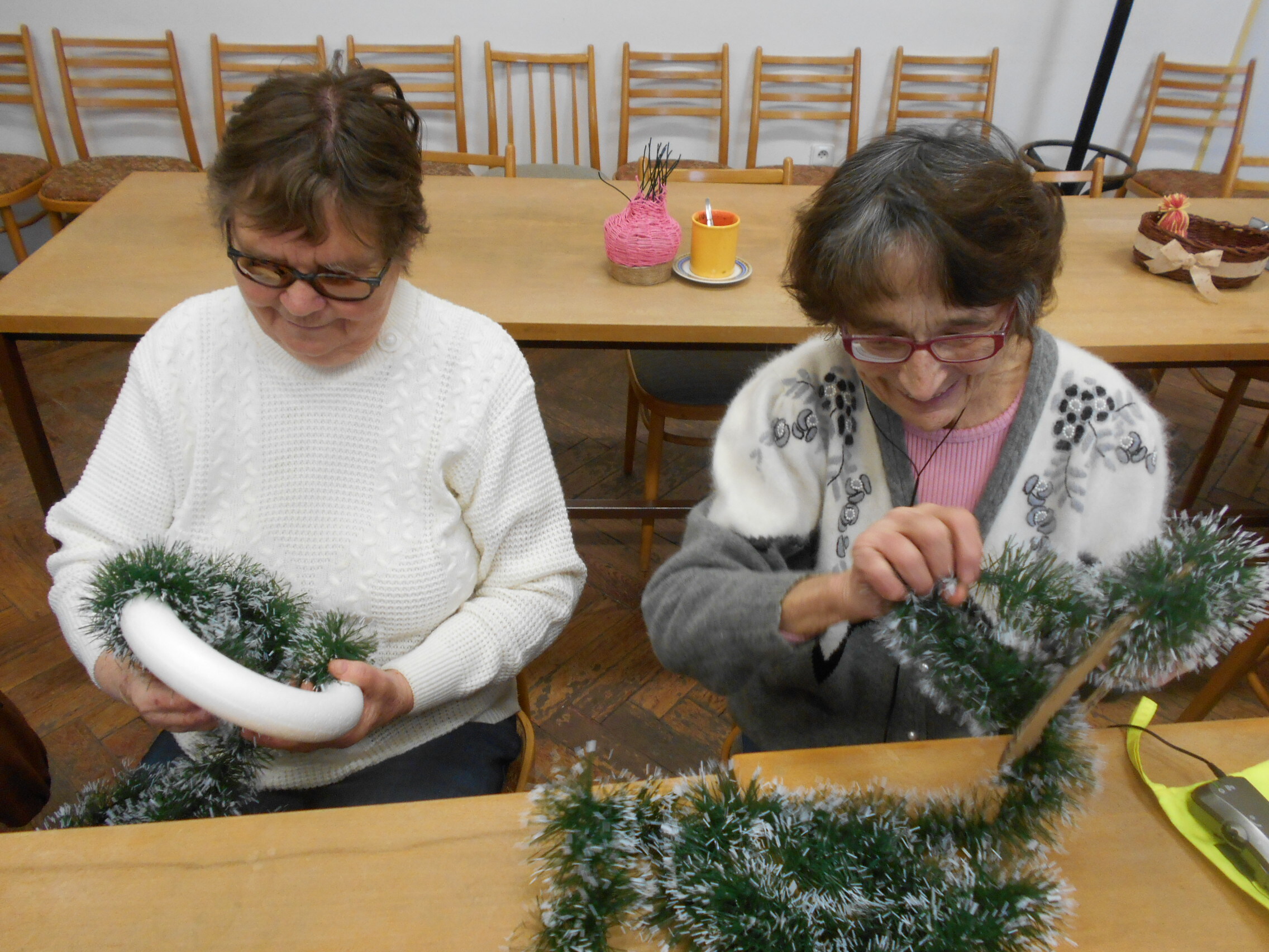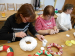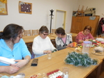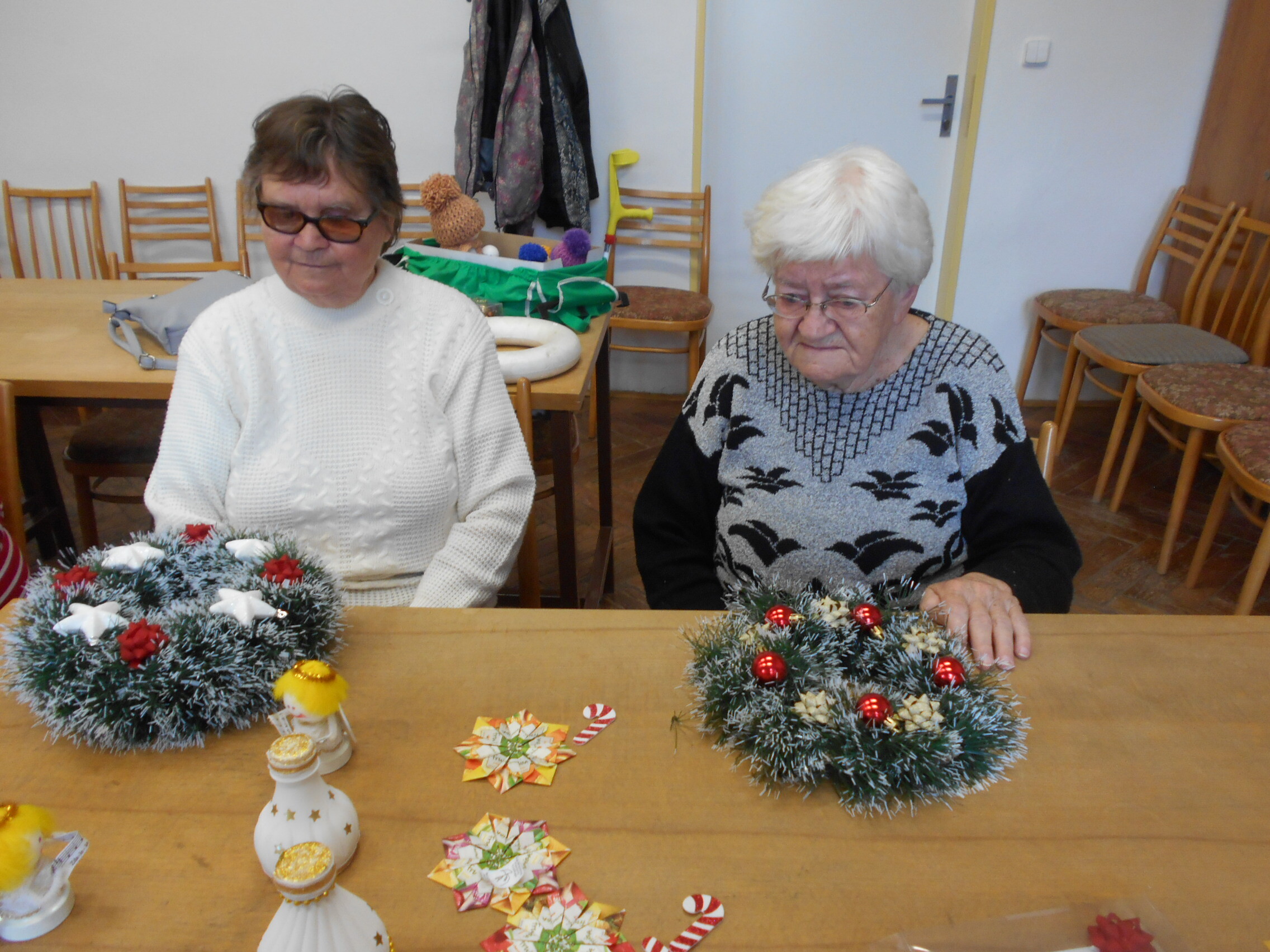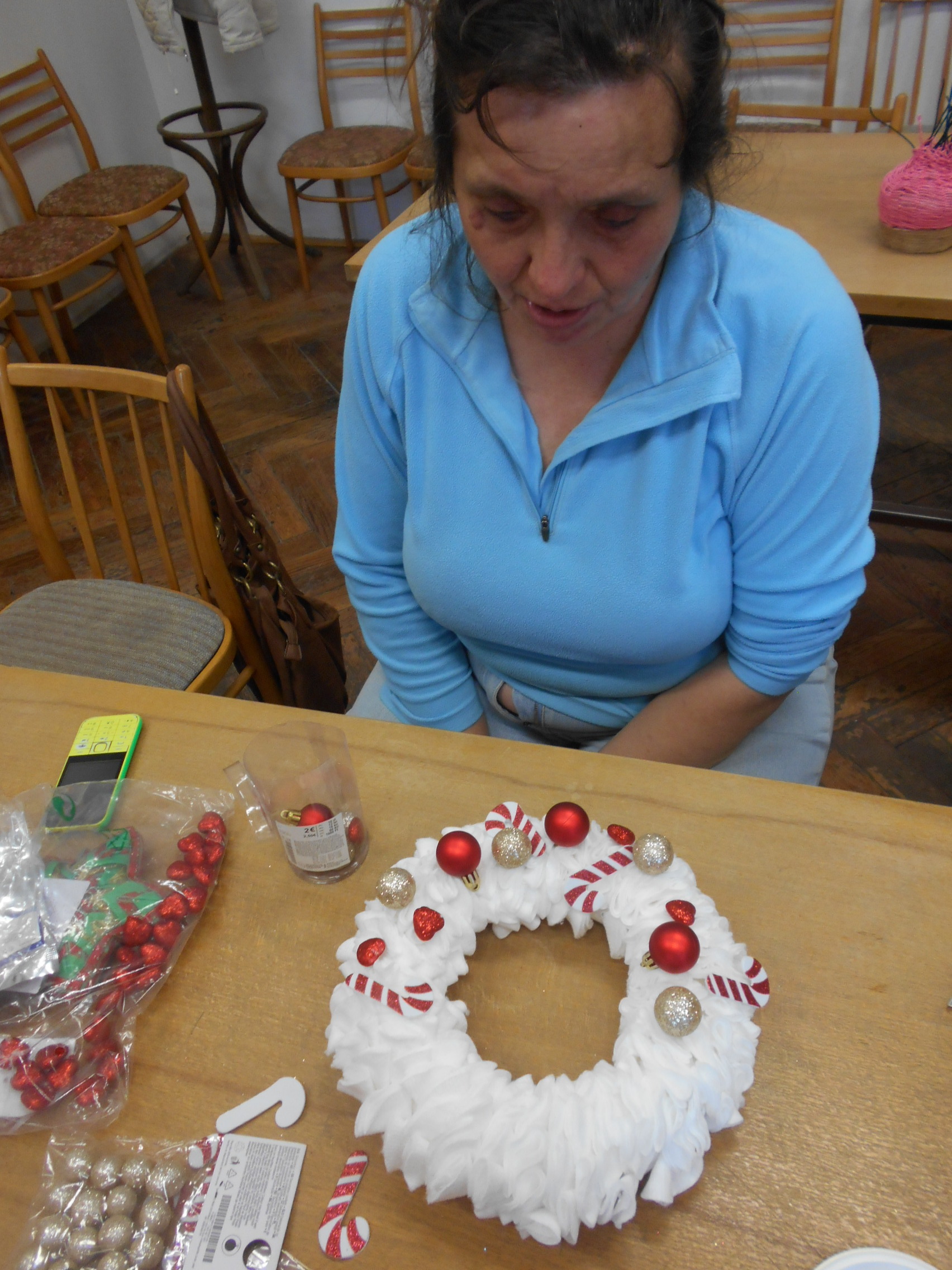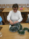 Na připravené polystyrénové korpusy jsme připevňovaly odličovací tampony nebo omotávaly vánoční řetězy. Pak jsme hotové věnce dozdobily vánočními ozdobami a dekorativními vánočními předměty a z výsledku hotových věnců jsme byly všichni nadšeni. Věnce jsme si odnesly domů a budou nám povětšinou zdobit vlastní domácnost. Děkujeme za příjemně strávené dopoledne a těšíme se opět na shledanou.