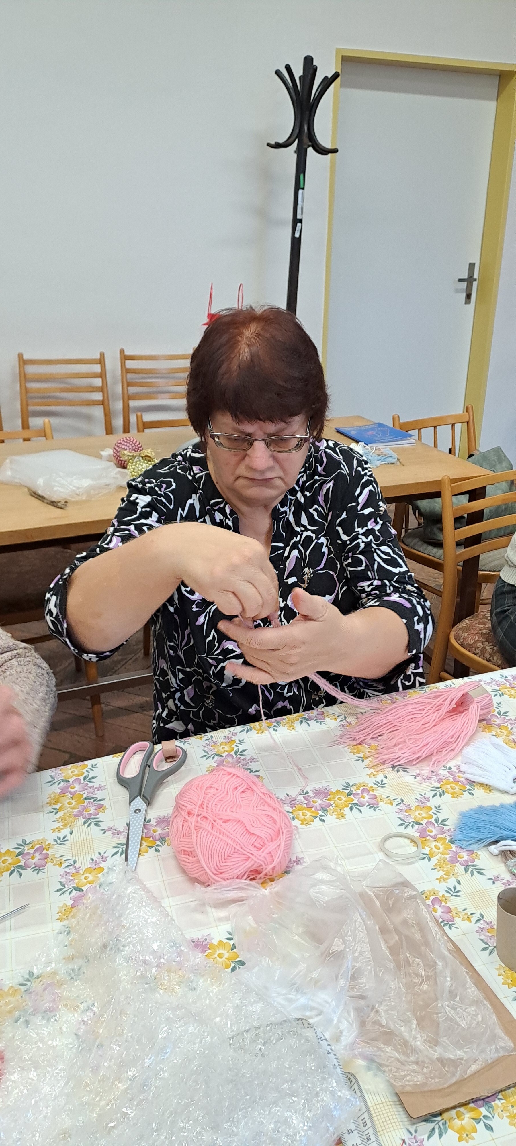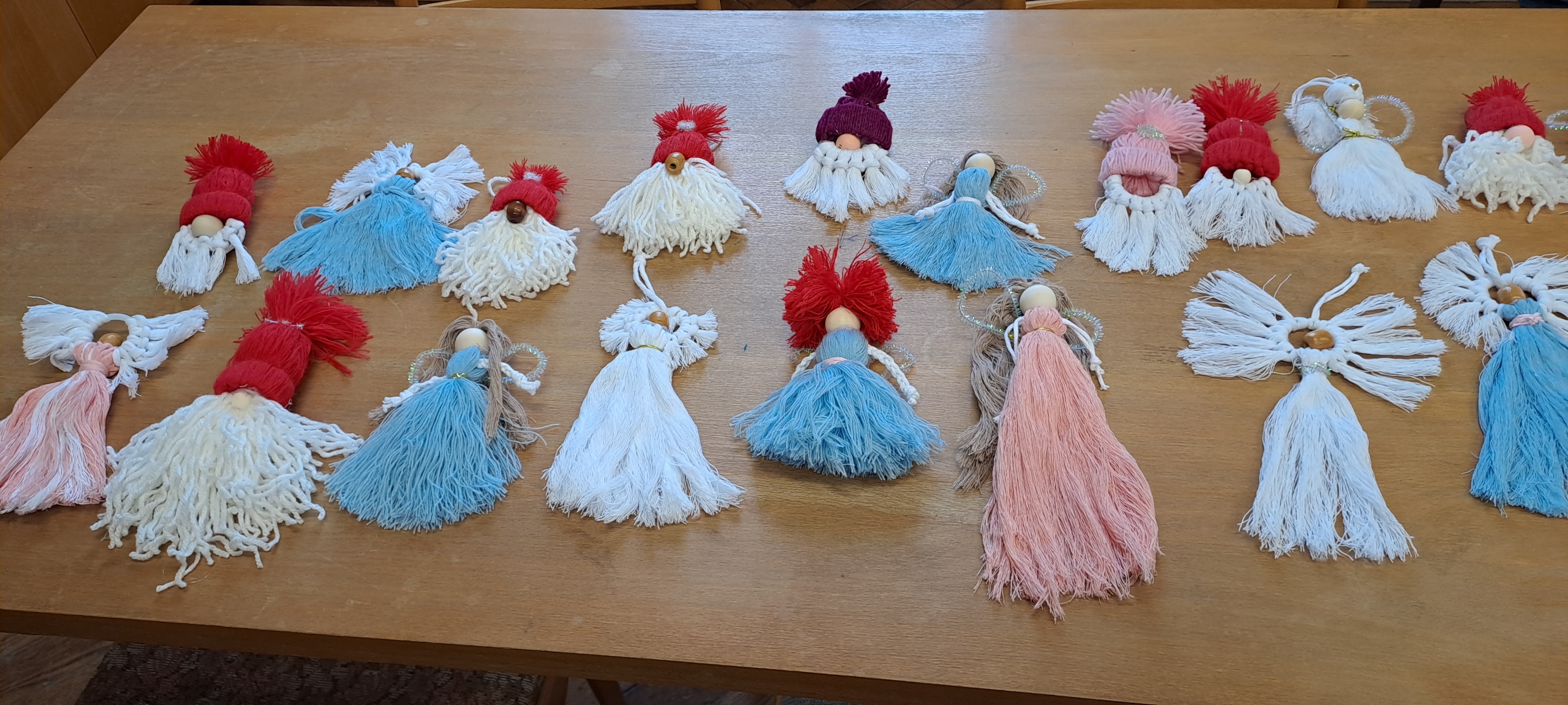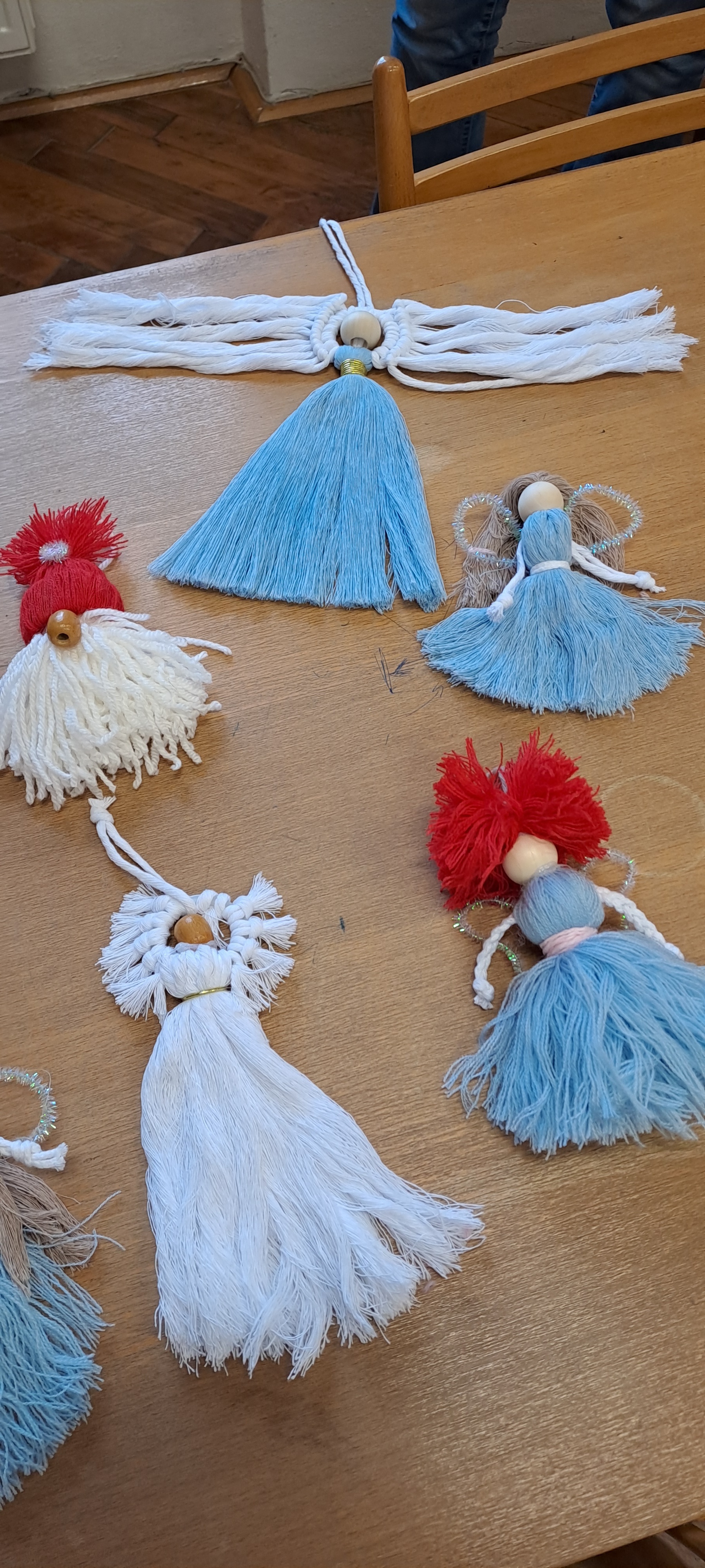 Po nějaké době jsme se opět vrátili k základům techniky macramé – drhání a s využitím vlny, macramé šňůry, kroužků na záclony a dřevěných korálků si vyzkoušeli tvoření dekorativních andělíčků a skřítků.