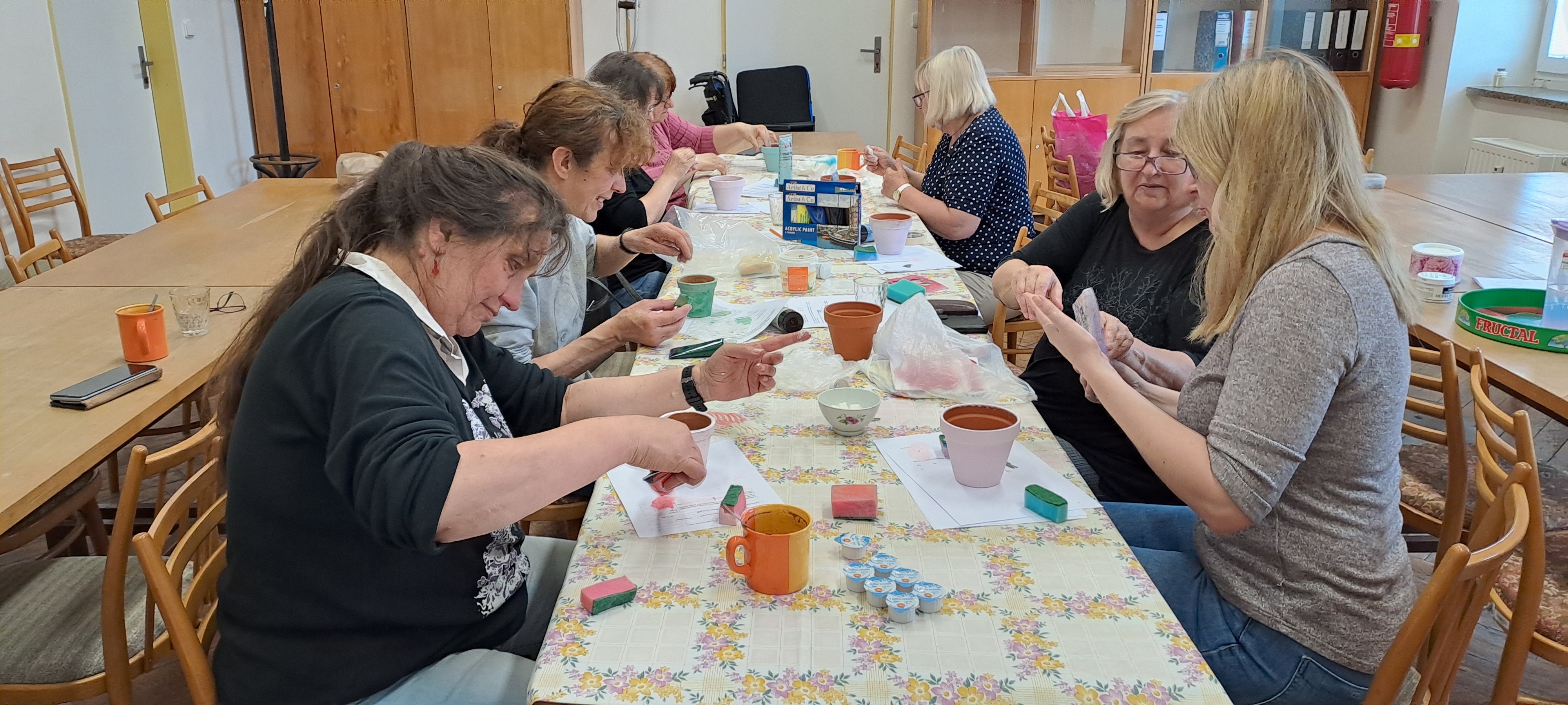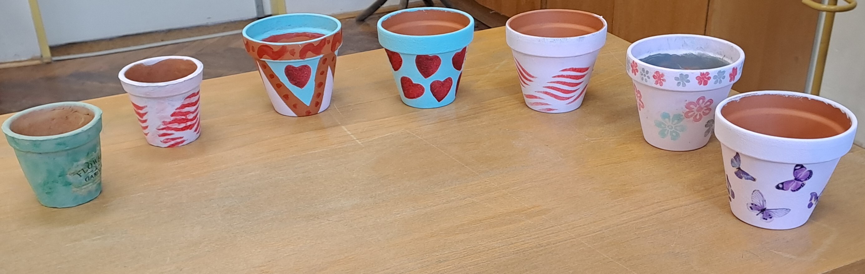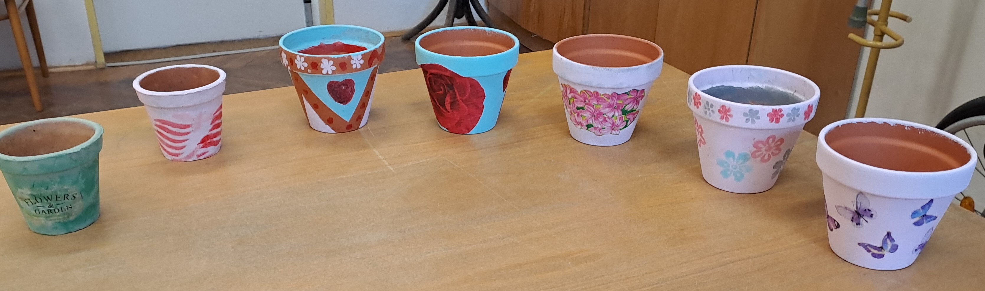 Nádoby jsme natřeli křídovými barvami dle vlastního výběru a fantazie a po zaschnutí barev jsme dozdobili květináče ubrouskovou technikou. Takhle ozdobené květináče jsou připravené na osázení oblíbených květin.