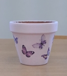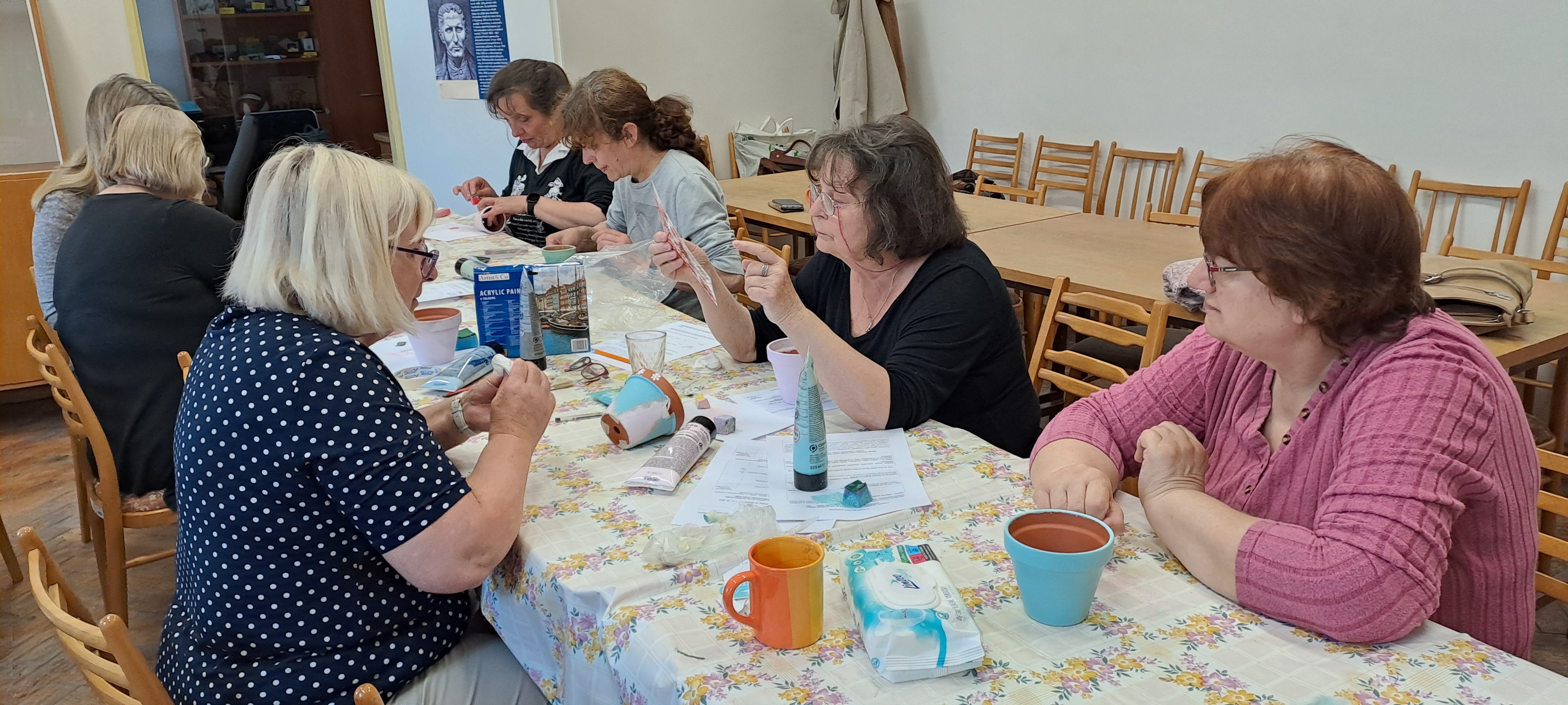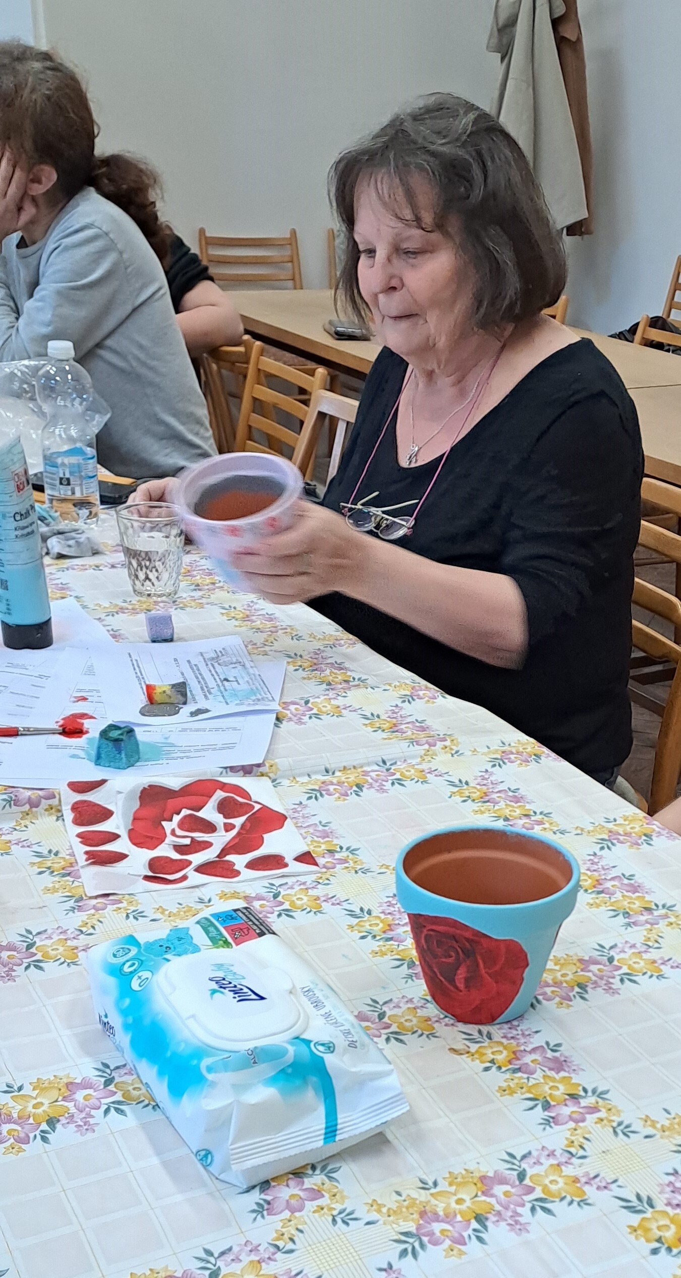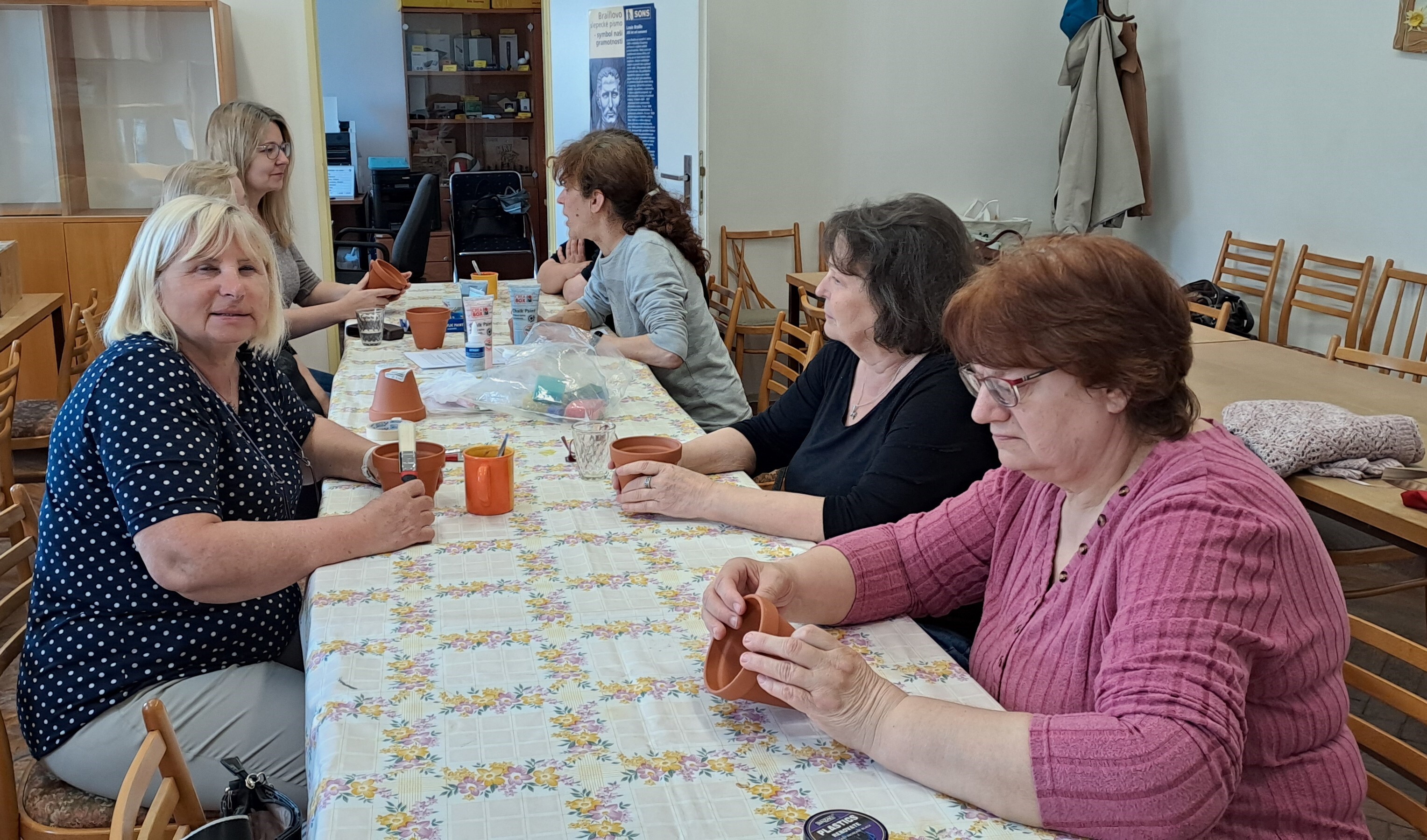 Nádoby jsme natřeli křídovými barvami dle vlastního výběru a fantazie a po zaschnutí barev jsme dozdobili květináče ubrouskovou technikou. Takhle ozdobené květináče jsou připravené na osázení oblíbených květin.