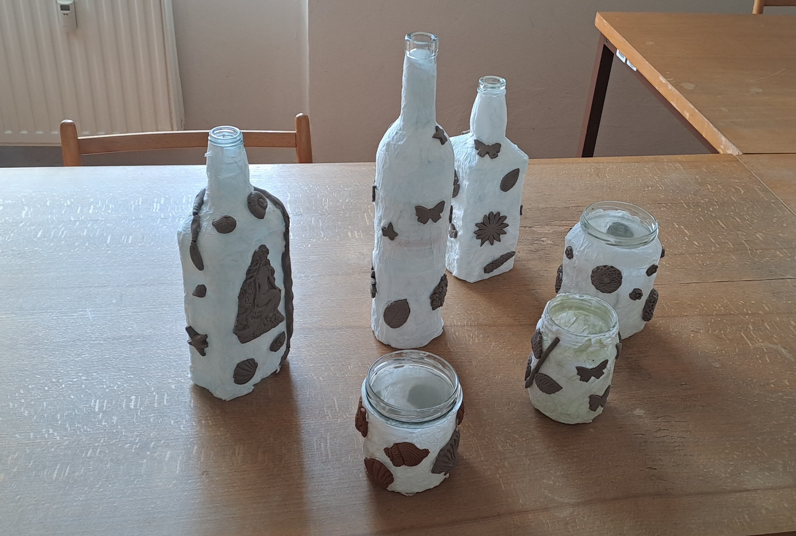 Na příštím setkání kdy samotvrdnoucí hmota zaschne, budeme sklenice malovat akrylovými a křídovými barvami.