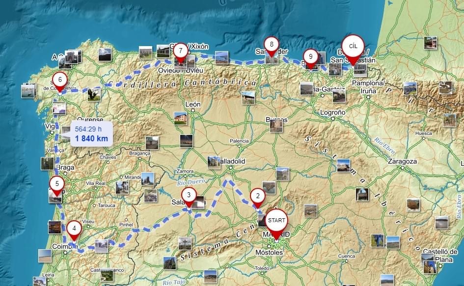 K protisměrné pouti na východ jsme si vybrali "severní" cestu (je dlouhá 830 km). Navštívili jsme tak Oviedo - hlavní město Asturie, zahrnuté do památek UNESCO; pak po pobřeží Biskajského zálivu přístav Santander - hlavní město Kantábrie (nedaleko něj leží světoznámá jeskyně Altamira s pravěkými nástěnnými malbami).