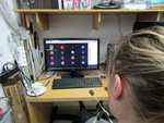 Haptickou stezkou nás bezpečně vedlo kovové madlo podél kruhové místnosti a v nikách stěny jsme nalezli k ošahání autentické repliky archeologických nálezů. Ty byly s popisem jak v Braillově písmu, či podsvíceným černotiskem. Hmatem jsme poznávali meč, sekery nebo slovanské šperky - gombíku. Pro silnější hmatový vjem byly některé z předmětů zvětšené. Haptická stezka je doplněná i zvukovými prvky. Pokud jsme šáhli na meč, ocitli jsme se na bitevním poli. Pak jsme se s naší průvodkyní pohodlně usadili v knihovně a vyslechli si průřez dějinami proti proudu s detailní prohlídkou rukama jednotlivých exponátů.
