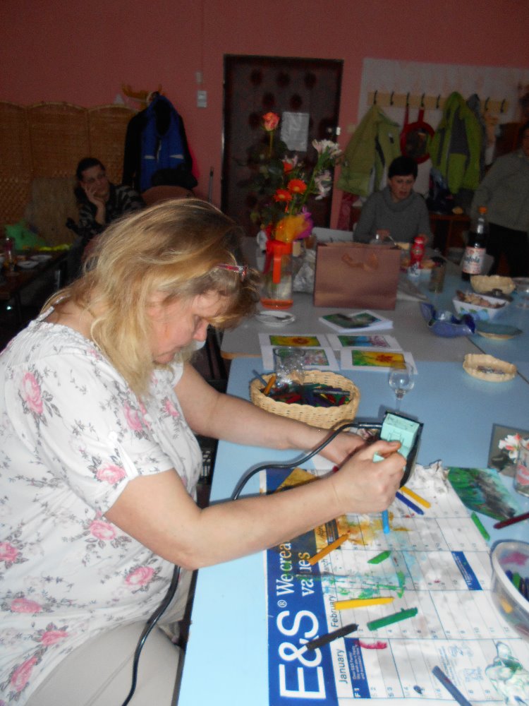 V KLUBU ŠIKULA JSME SLEDOVALI NOVÝ POSTUP PŘI VÝROBĚ ENKAUSTICKÝCH OBRÁZKŮ. BROŇKA HYVNAROVÁ NÁS UČILA V POKRAČOVÁNÍ KURZU MALOVÁNÍ ŽEHLIČKOU NOVÉ TECHNIKY A ROZŠÍŘILA NÁM TAK MOŽNOSTI ČAROVÁNÍ S VOSKOVKAMI. VYTVOŘILA NĚKOLIK KRAJINEK A KVĚTIN A MY JSME SE ZMOHLI JEN NA OBDIVNÉ – JÉÉÉÉ.