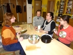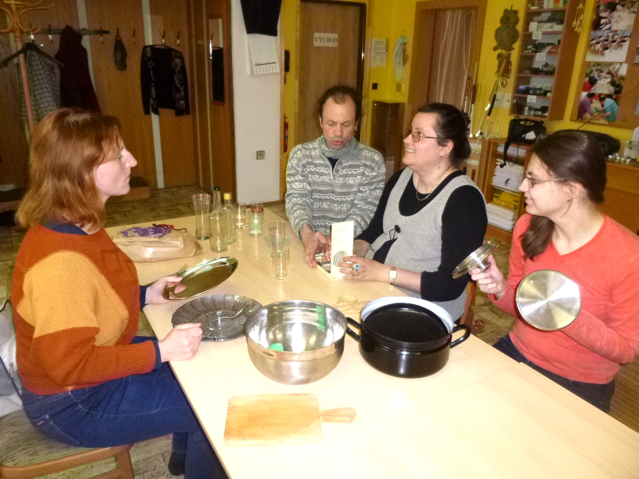 Tak to je prosím výsledek nácviku v rámci muzikoterapie, kdy přítomní aktéři - Michal, Iveta, Jana a Katka se sladili jak navzájem, tak s nástroji denní potřeby - vařečky, poklice, hrnce, mísy, skleničky, lžíce, kráječ na vajíčka, pařáček a láhev. Možná jednotlivé kuchyňské vybavení po hlase, či zvuku poznáte