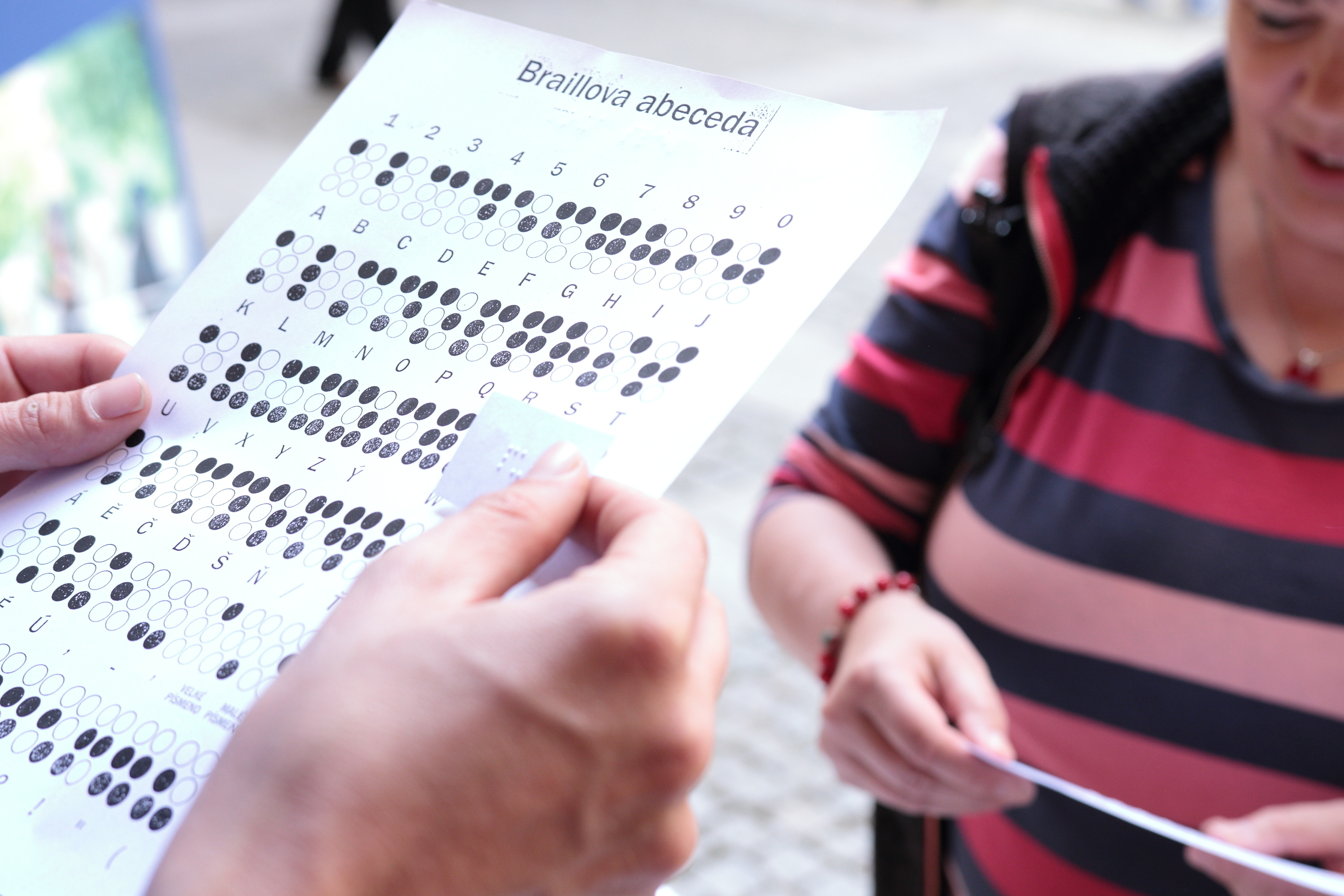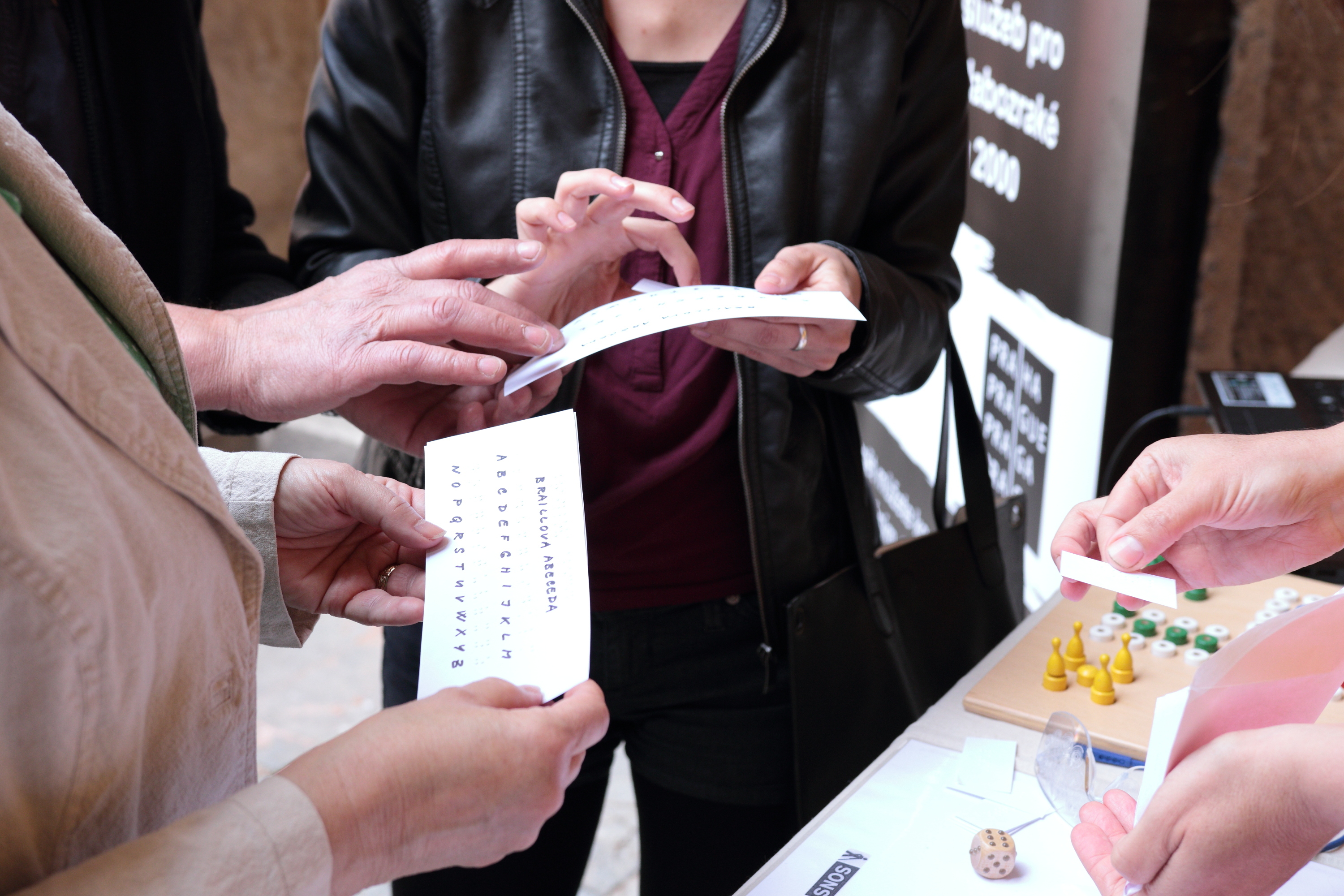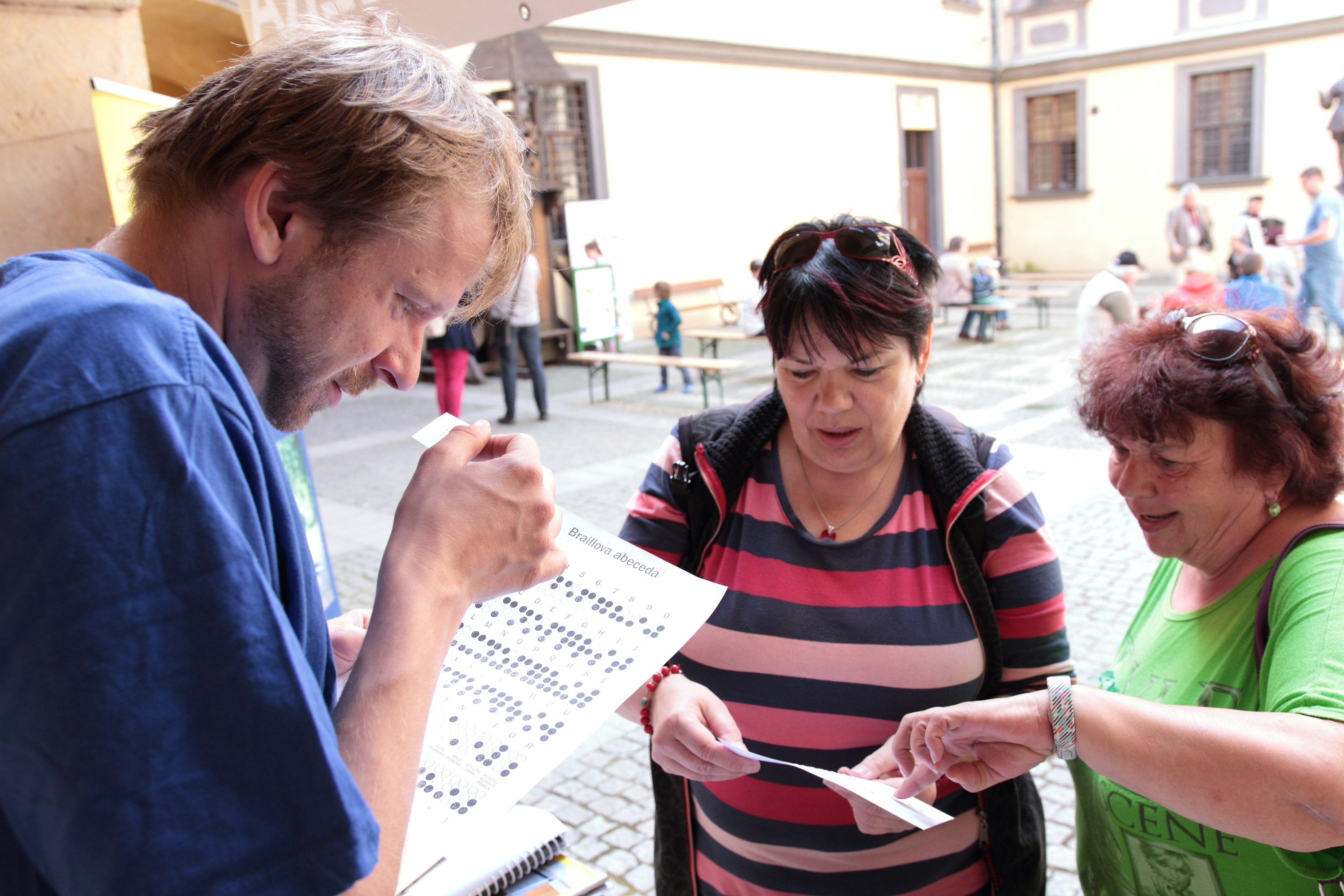 Neváhali jsme a opět připravili stánek plný zajímavostí ze ţivota zrakově hendikepovaných. Díky velkému zájmu v loňském roce jsme svoje řady letos posílili na šest pomocníků. O naše pomůcky a informace byl velký zájem. Děti měly moţnost nasadit si papírové klapky na oči a zahrát si pexeso nebo člověče nezlob se. Mnoho návštěvníků si zkusilo chůzi s bílou holí nebo podpis naslepo pomocí šablonky. Také jsme předváděli sadu simulačních brýlí, které zdravým lidem přibliţují nejčastější zrakové vady. Náš stánek jsme doplnili i pomůckami z praktického ţivota slabozrakých a nevidomých, jako jsou lupy, hodinky, kalendáře, kníţky, pomůcky na praní či pomůcky do kuchyně. Rovněţ jsme měli připravenou Braillovu abecedu a pět obálek s různými slovíčky v bodovém písmu, které mohli návštěvníci sami rozluštit. Na viděnou opět za rok.
