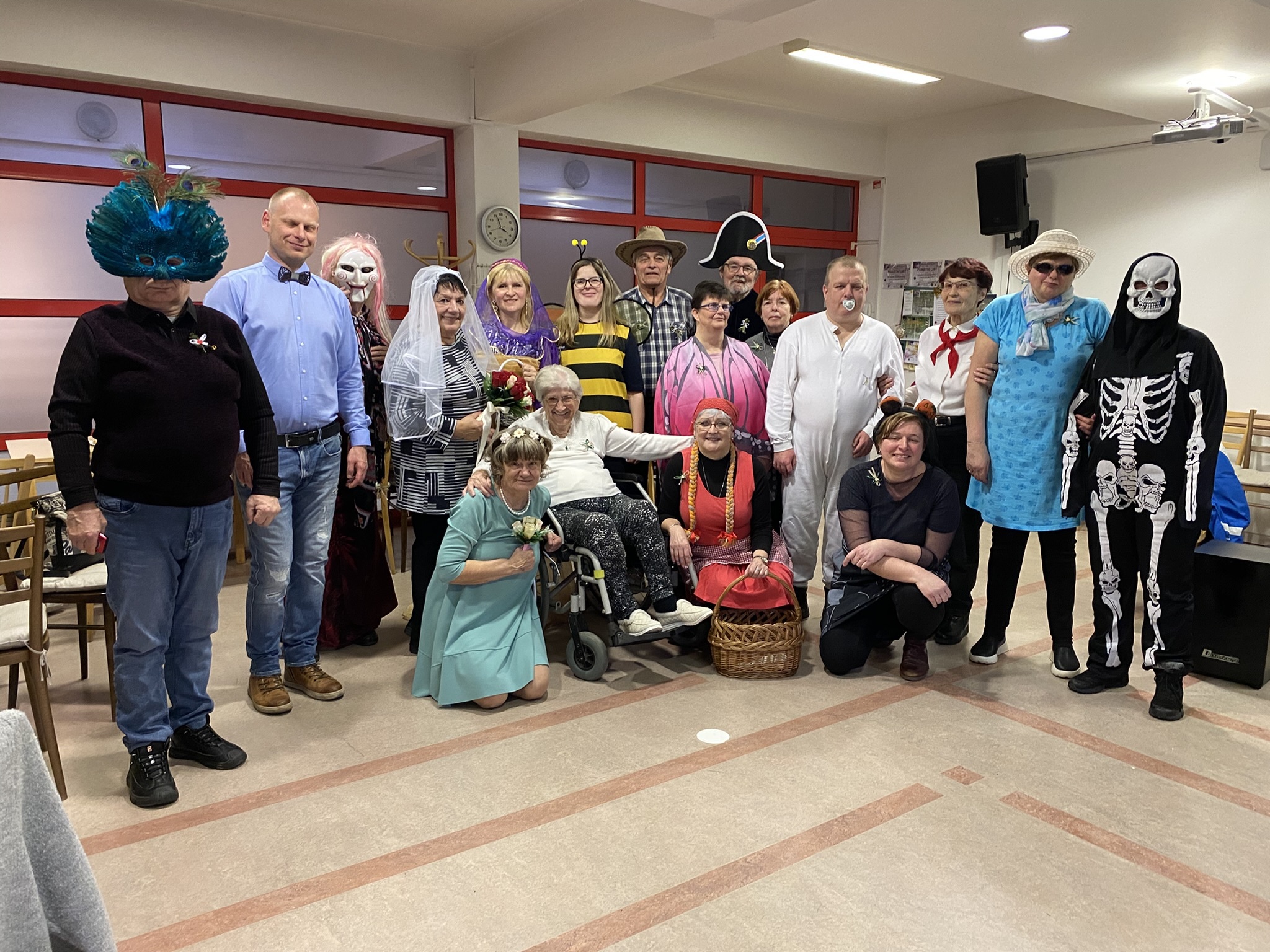 Psal se čtvrtek 13. února, když jsme se po roce opět sešli v Klubu seniorů na Peškově ulici, abychom si společně užili masopustní veselí se vším, co k němu patří. Nechyběla živá hudba, občerstvení v podobě koblih i domácích dobrot od účastníků a samozřejmě ani kostýmy a různá přestrojení, ve kterých byli mnozí skutečně k nepoznání. Namísto známých tváří jsme tak mezi sebou najednou měli například adeptku na Miss, Červenou Karkulku, pionýra, farmáře ze seriálu Dallas, páva, Napoleona, lázeňskou dámu, Šeherezádu, miminko, kostlivce, motýlka a další. Dokonce jsme zažili i fiktivní svatbu, kde nechyběl ženich, nevěsta a družička. Zpívalo se, tančilo se a panovala veselá nálada. Velkou radost nám svou účastí udělala také obyvatelka místního domova a naše dlouholetá členka paní Skácelová, která se za námi přišla pobavit.