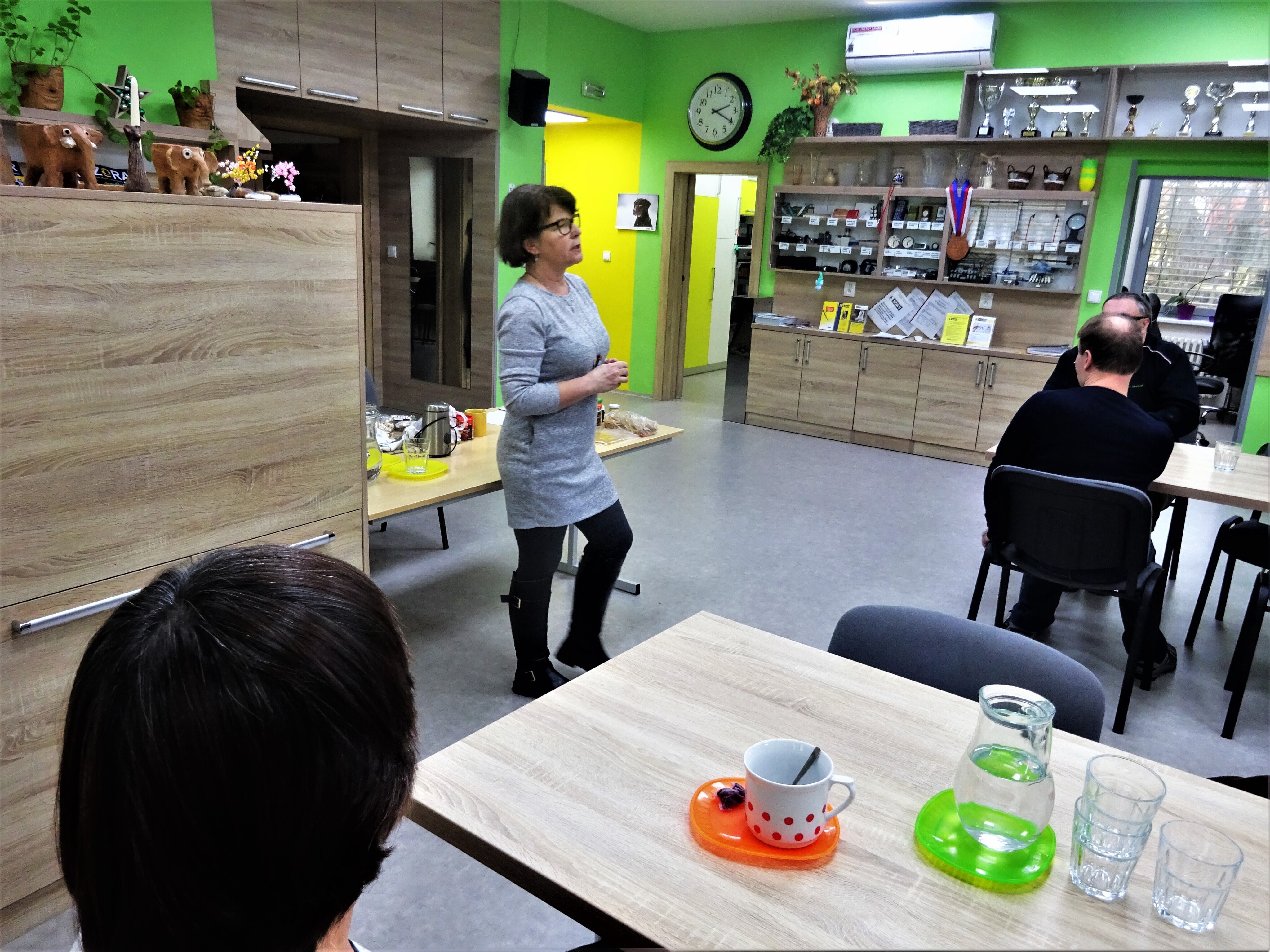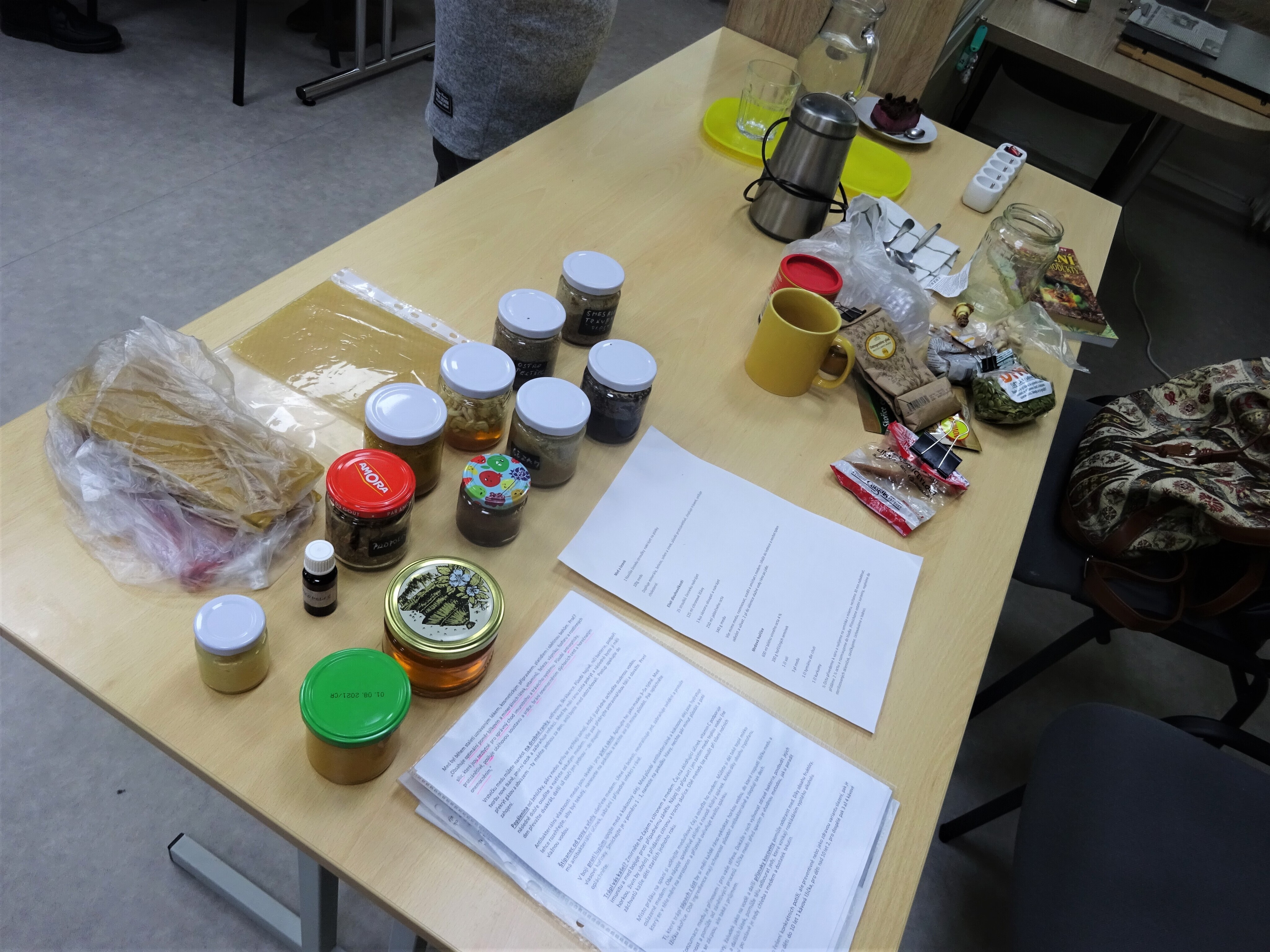 Beseda se nám pěkně rozjížděla, padalo spousta zajímavých dotazů, že v jeden moment to vypadalo, že se k bylinkám ani nedostanem. Beseda nebyla jenom o povídání, ale byla ušita přímo na mřru našim potřebám. Věci na ošahání kolovaly mezi účastníky, nejdříve to byl plastový model včelky v té správné velikosti, pak si měl možnost každý ošahat pláty metistěn vosku, porovnat odlišnosti skořice a v druhé polovině došlo i na ochutnávky produktů bylinek v medu, přímo před námi se vyráběla medová nutela. Každému chutnalo něco jiného. Ale o jeden receptík se podělíme i s vámi.