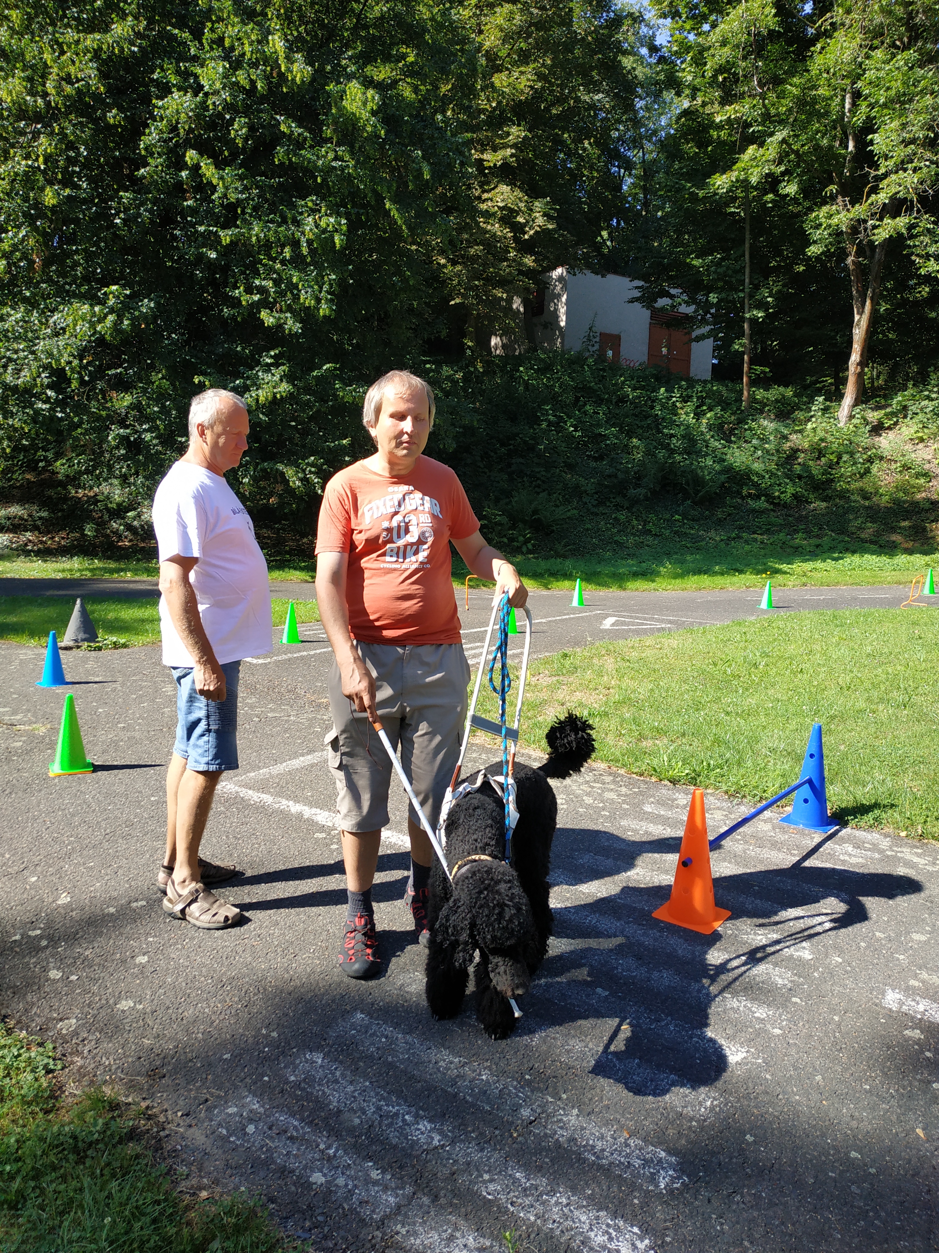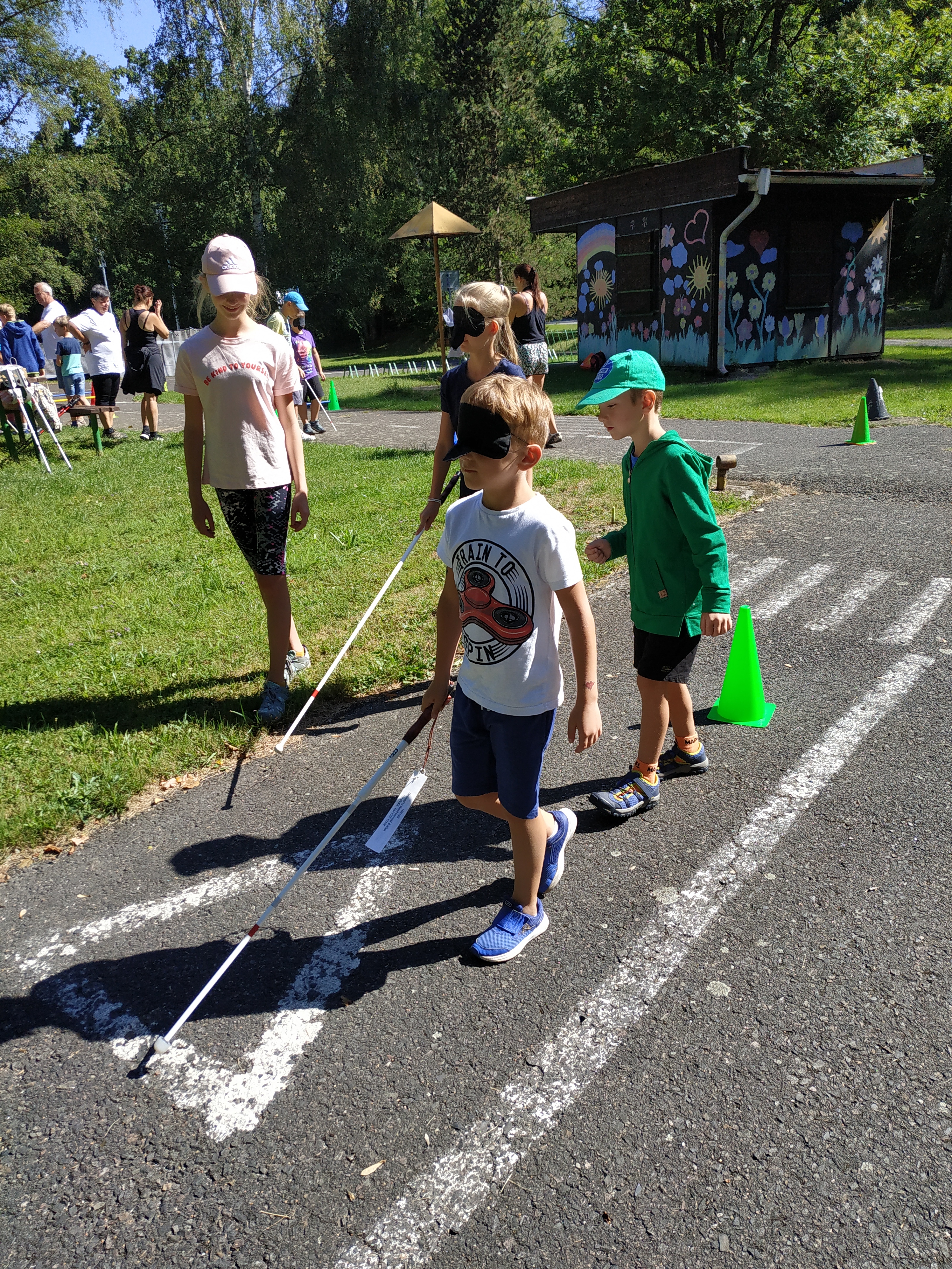 Dne 8. srpna jsme zavítali mezi děti pěíměstského tábora v Heřmanově Městci v Domě dětí Na Ježkovce. Nejprve Honza dětem stručně nastínil svět nevidomých a Zdeněk Nenečeřal popovídal o významu vodicího pejska pro nevidomého a také předvedl, jak mu pomáhá zvládat cestu. Poté jsme přistoupili k různým hrám: děti si vyzkoušeli chůzi s bílou holí, zahráli si pexeso pro nevidomé, zkoušeli po slepu rozpoznávat různé předměty. Zděněk jim ukázal, jak se čte braillovo písmo. Děti byli velmi vnímavé a hry je zaujaly. Nicméně si ověřili, že je lepší dívat se na svět zdravýma očima.