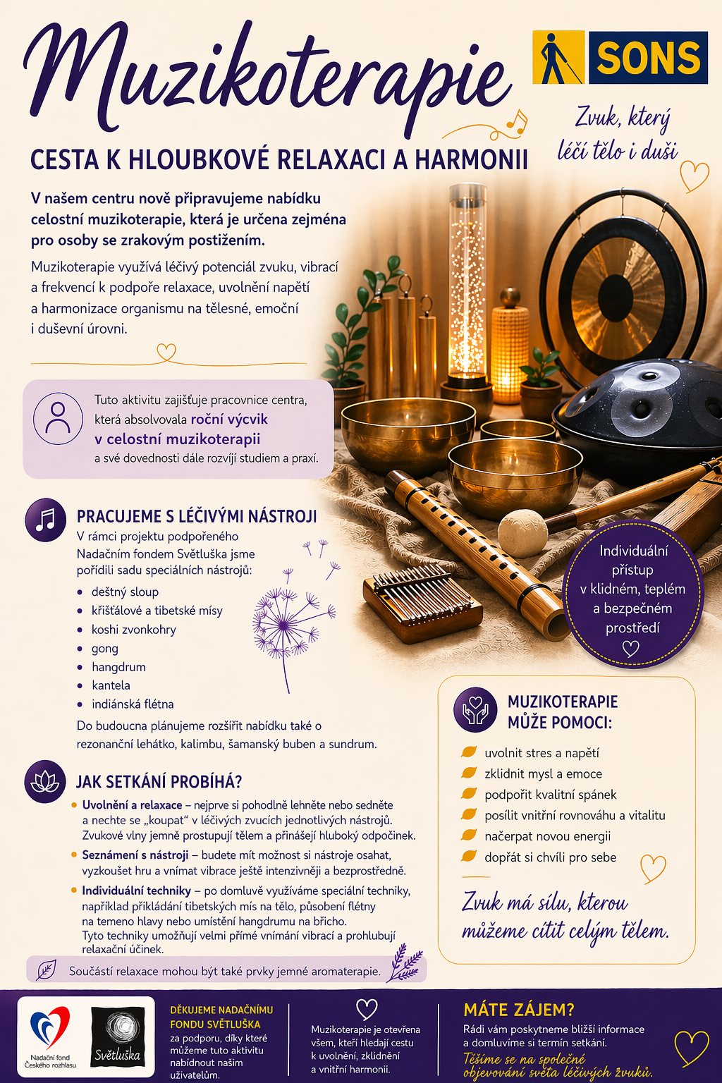 Pokud vás tato nová aktivita zaujala, rádi vám poskytneme bližší informace. Těšíme se na společné objevování světa léčivých zvuků. Aktivita bude probíhat ve vybrané středy a je pro uživatele a členy SONS zcela zdarma. Termíny si domluvte přímo na tel. čísle: 775 438 194.