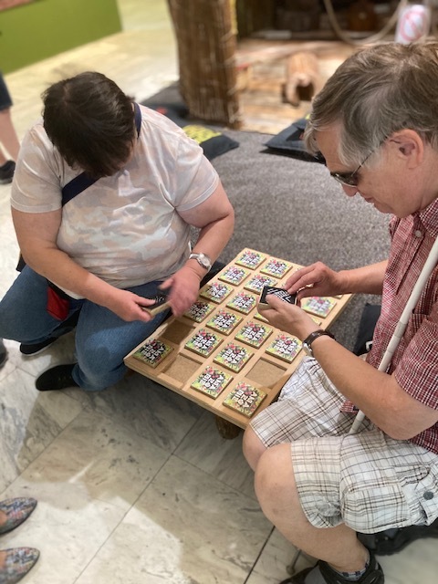 Výstava Tisíc tváří Amazonie. Kdo si hraje, nezlobí – Petra a Vláďa prohlížejí hmatové pexeso. Na dřevěných destičkách jsou různé plastické vzory, připomínající tradiční zdobení obyvatel Amazonie.