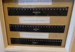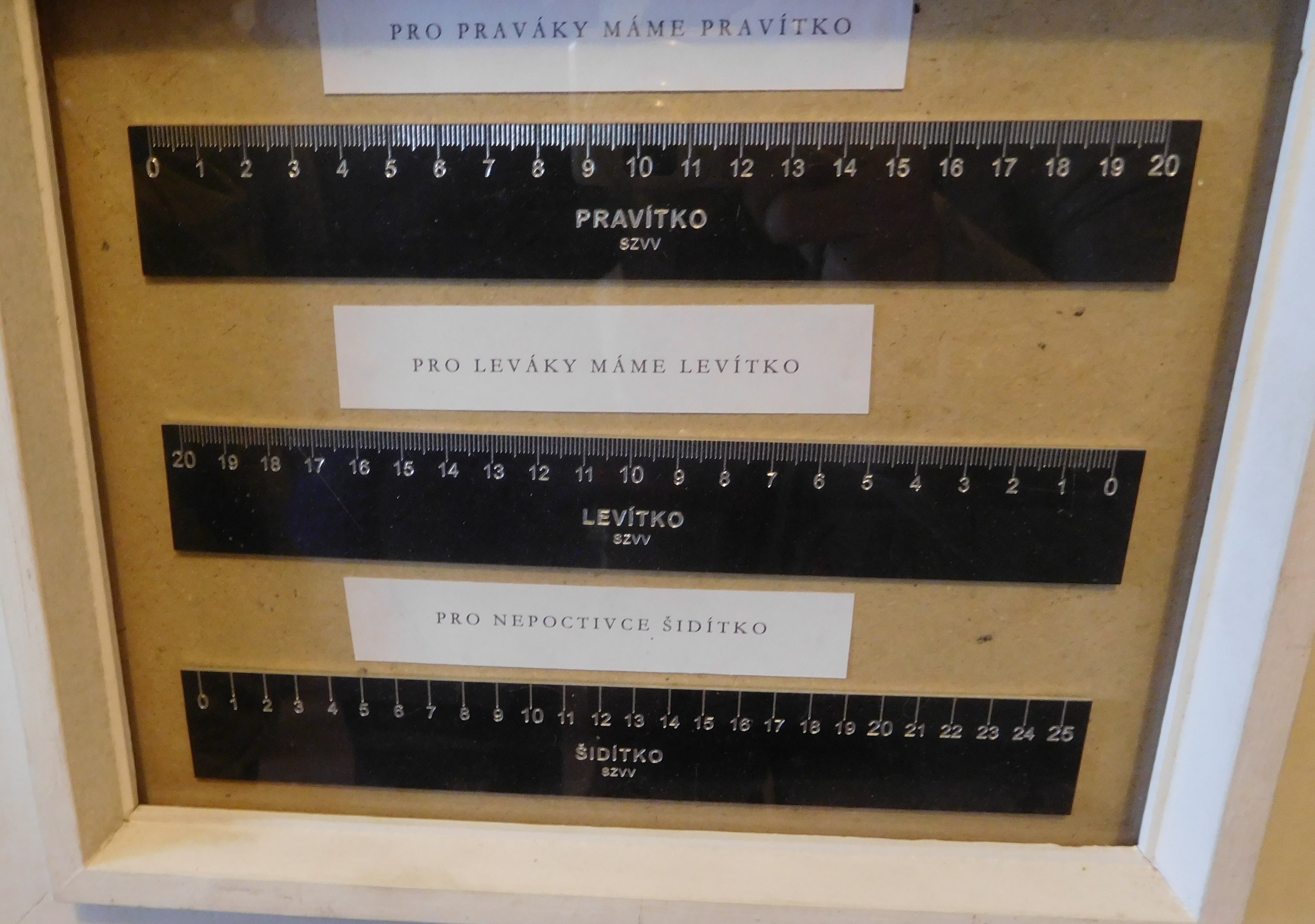 Pravítka, levítka a šidítka. Pravítko je klasické 20centimetrové pravítko, levítko má číselnou stupnici obrácenou a šidítko na délce 20 cm má po dílcích vyznačených 25 cm.