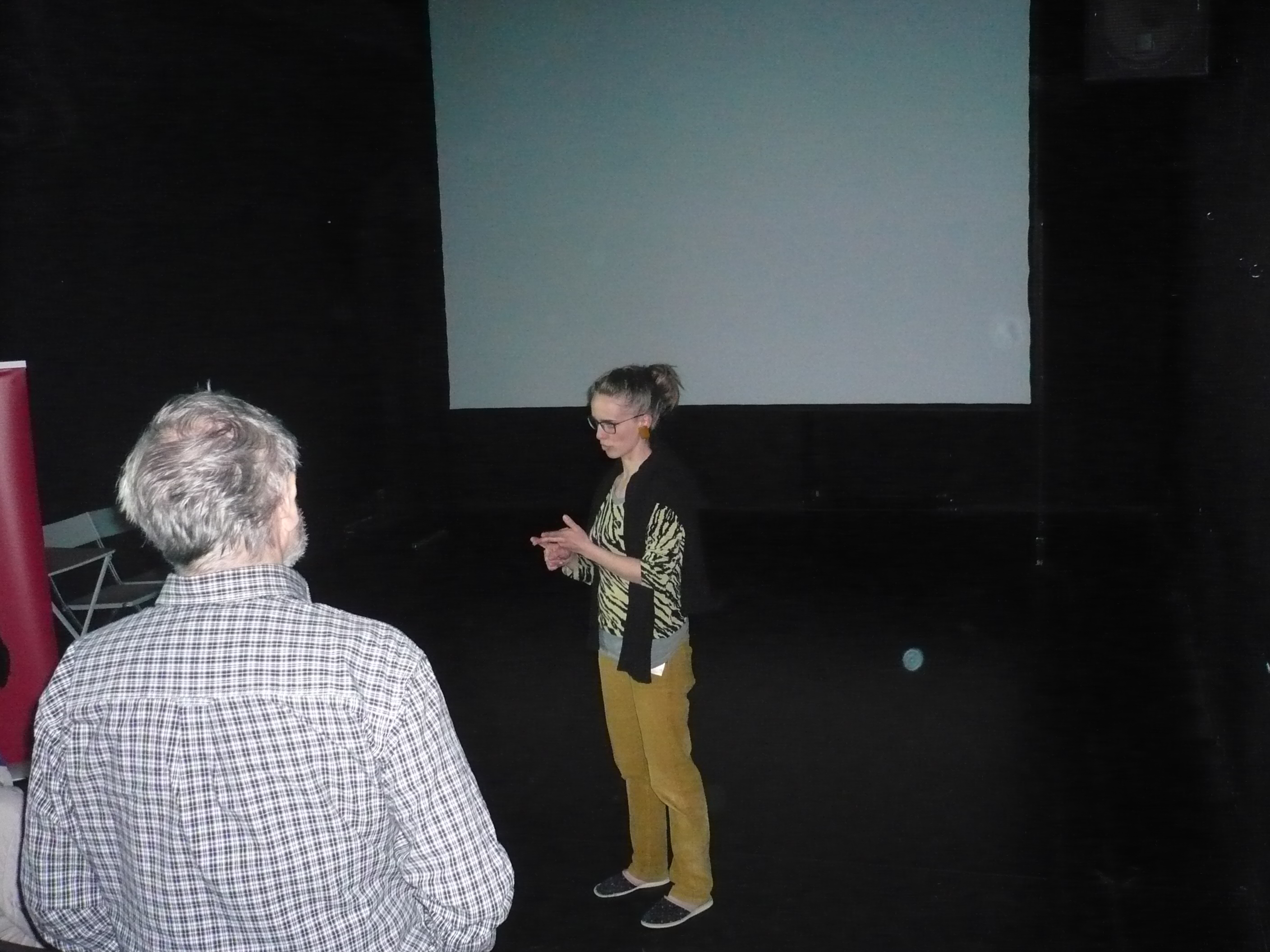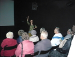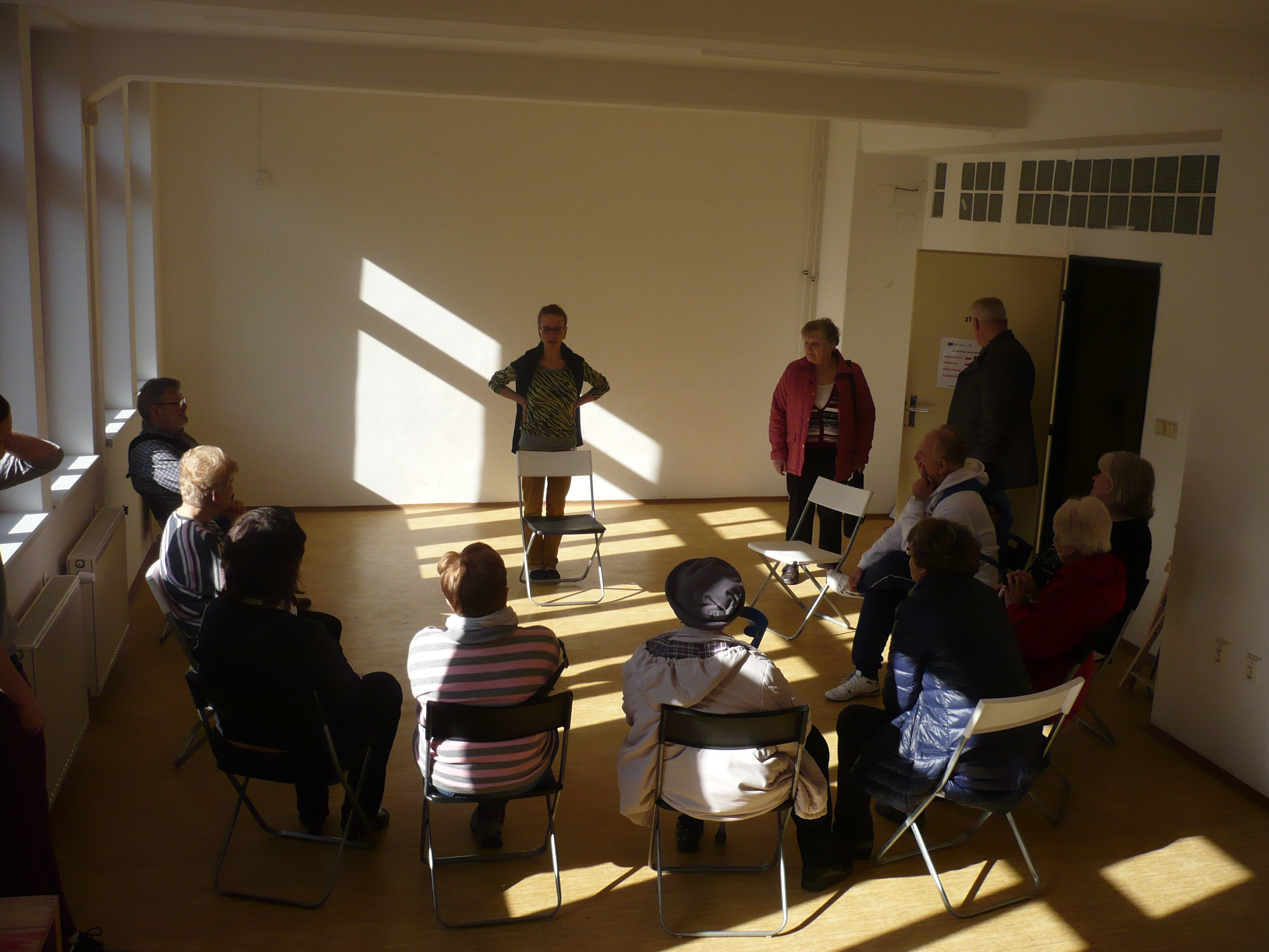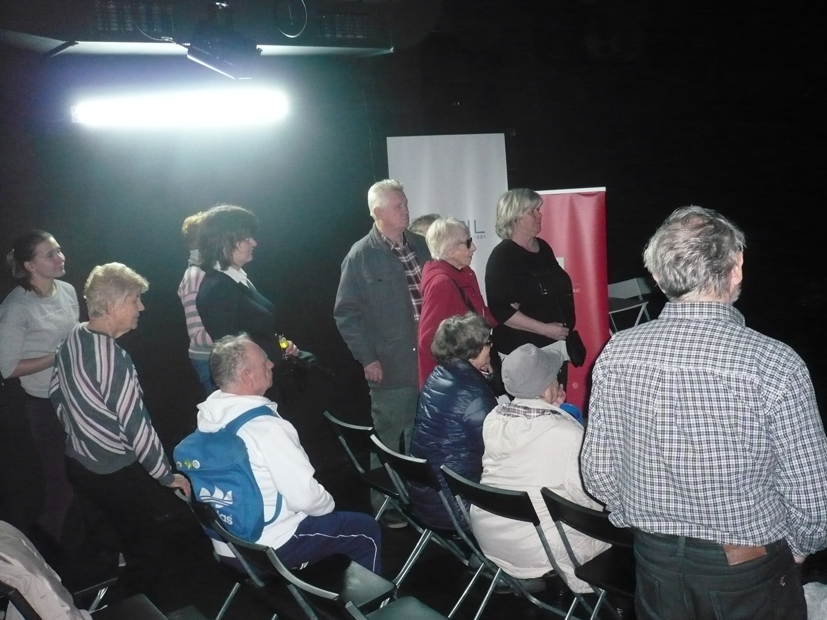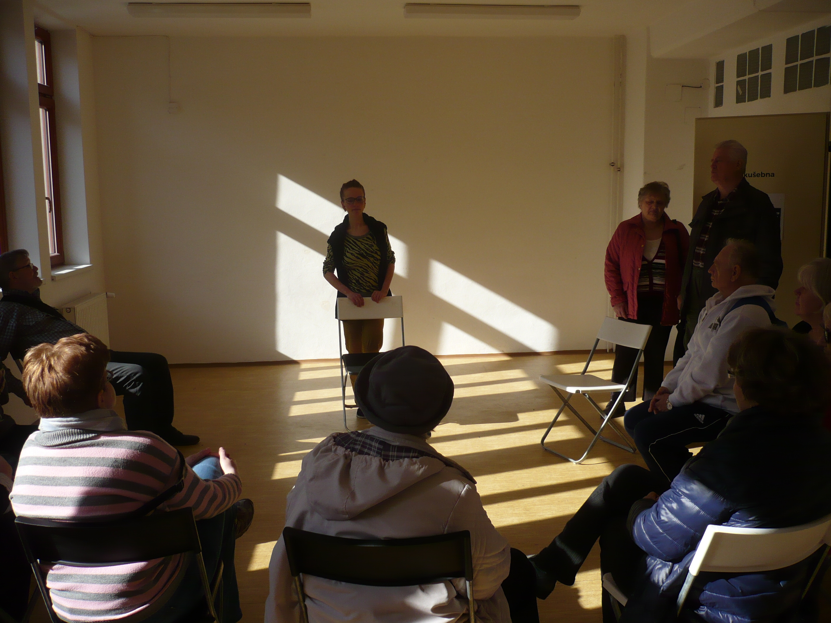 Když sejdeme po schodech do suterénu, je před námi malý divadelní sál. Odehrávají se tu jak divadelní, tak i filmová představení, diskusní fóra, literární večery nebo cestopisné přednášky. Z divadelniho sálu jsme prošli do rekvizitárny a odtud po točitých schodech do šatny a zkušebny. Divadélko bylo sice malé, ale jak se říká: co je malé, je i milé. A takové bylo i odpolední setkání v Divadle na cucky.