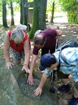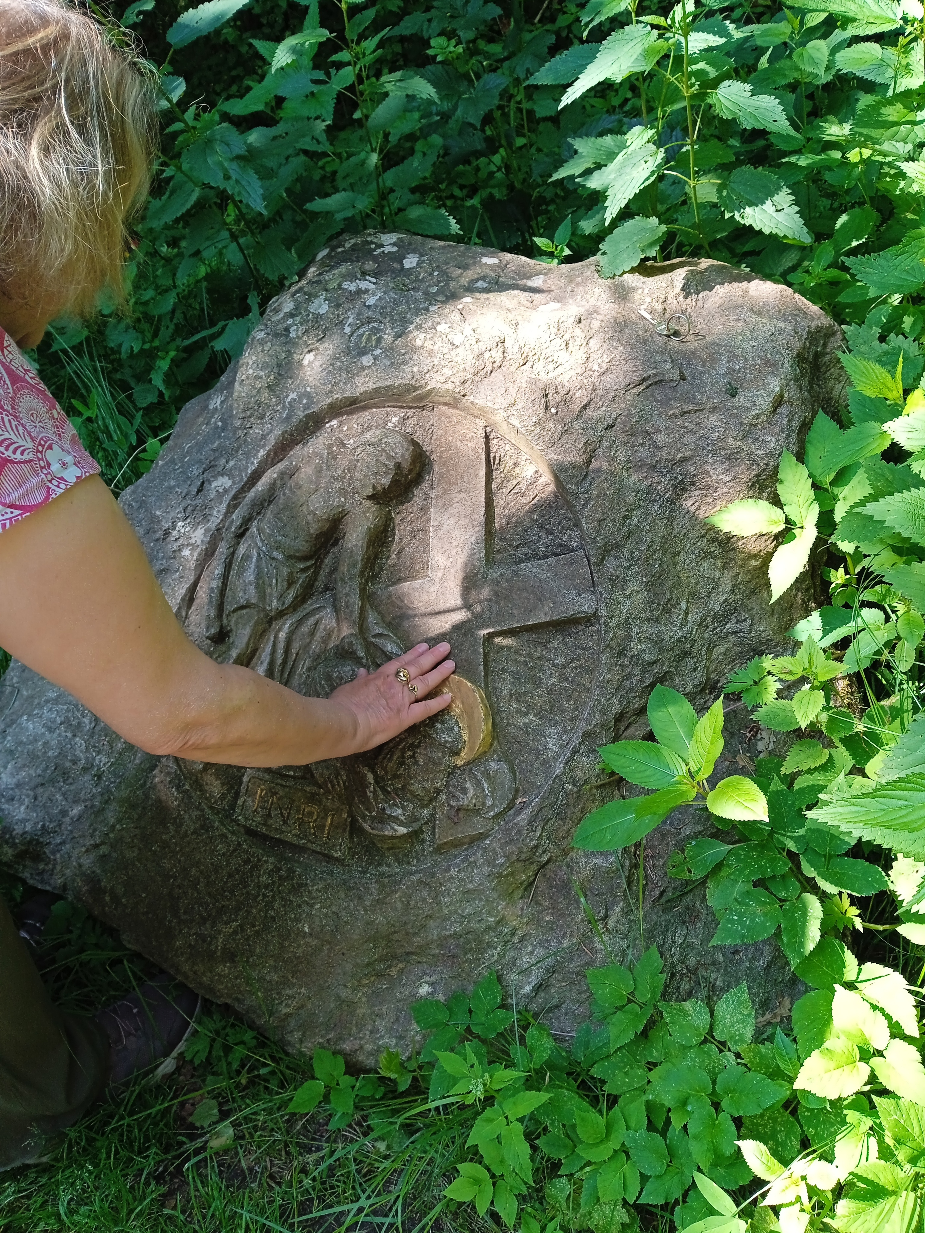 Cestou jsme si prohlédli jedinečnou křížovou cestu od sochaře Martina Mikuly. Čtrnáct zastavení je vytesaných do rulových bloků, které byly vytěženy při stavbě dálnice. Reliéfy vedou od kamenného kříže až ke kapli Panny Marie Bolestné u pramene údajně léčivé studánky. Díky haptickému zpracování jsme si mohli symboly křížové cesty prohlédnout hmatem – a to byl zážitek, který v nás zůstane ještě dlouho. Autor totiž chtěl propojit umění s krajinou tak, aby se dotekem objevovalo a zároveň v čase přirozeně slévalo s okolím. Povedlo se mu to dokonale.