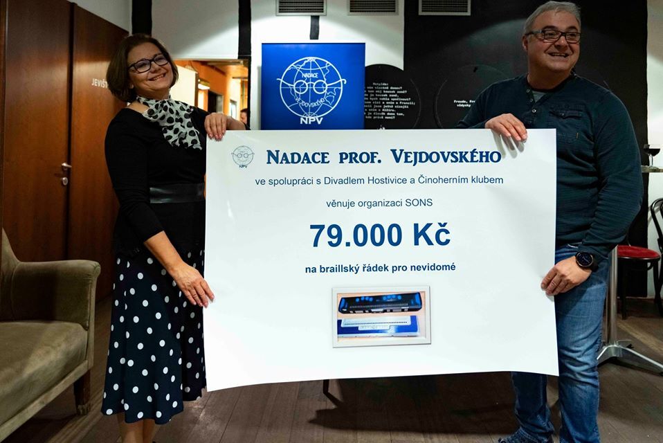 V den 124. výročí narození prof. Václava Vejdovského, 15. 2. 2020 se konalo charitativním divadelním přestavením v Činoherní klub s příhodným názvem - Na správné adrese. Herci Hostivické divadlo s Ivanou Andrlovou a Martinem Zounarem věnovali Nadace prof. Vejdovského pod režií Jolany Petříkové divadelní představení, jeho výtěžek ve výši 79.000 Kč byl věnován Nadaci prof. Vejdovského na Braillský řádek pro nevidomé, který bude využíván v SONS. Šek na pomůcku převzal z rukou nadace a herců prezident Sjednocené organizace nevidomých a slabozrakých Václav Polášek.