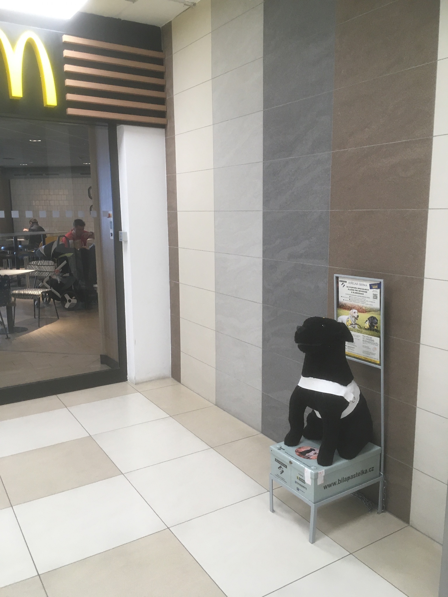 Našeho psa najdete poblíž vchodu do provozovny McDonald’s ve spodní části centra.