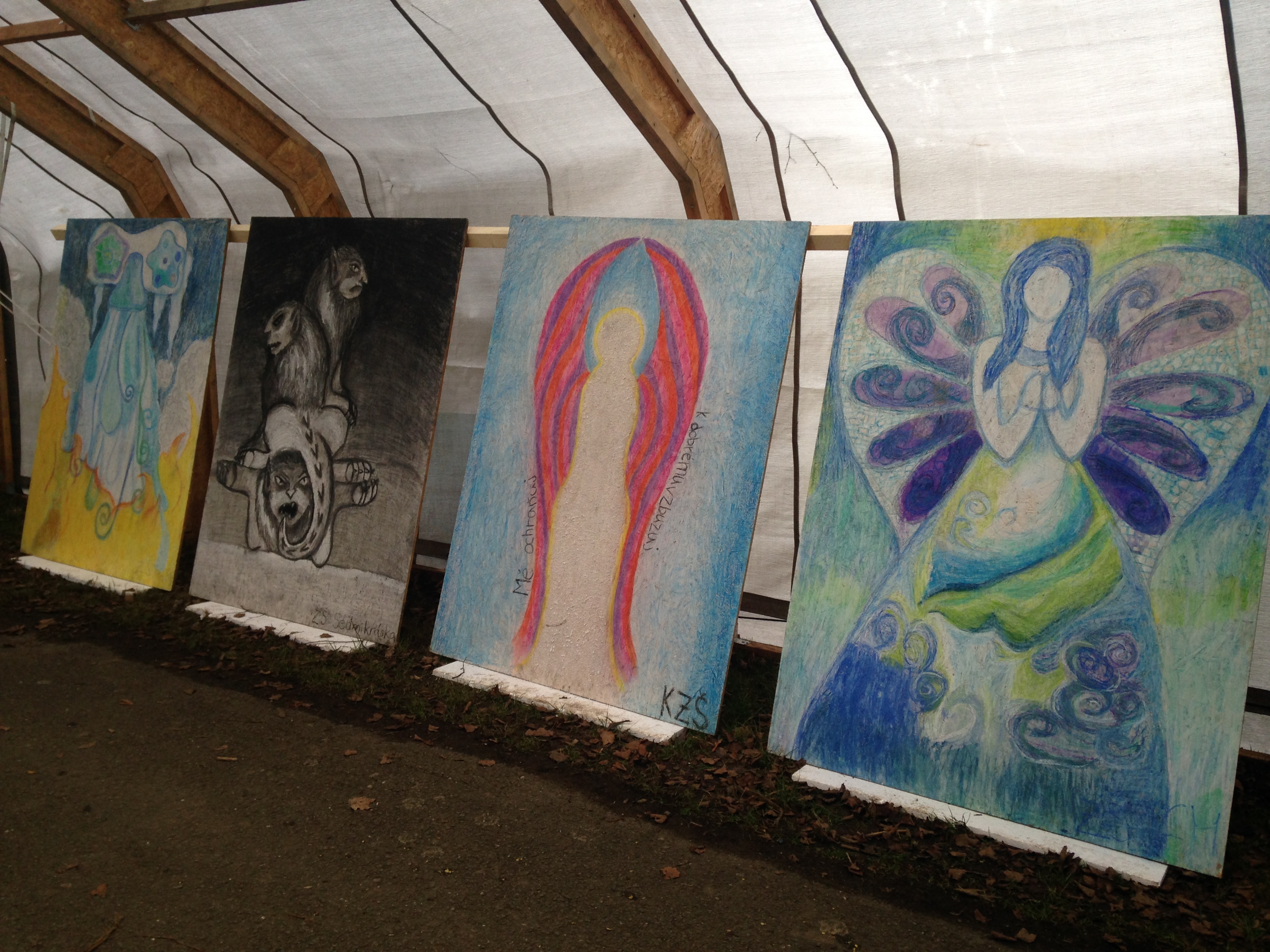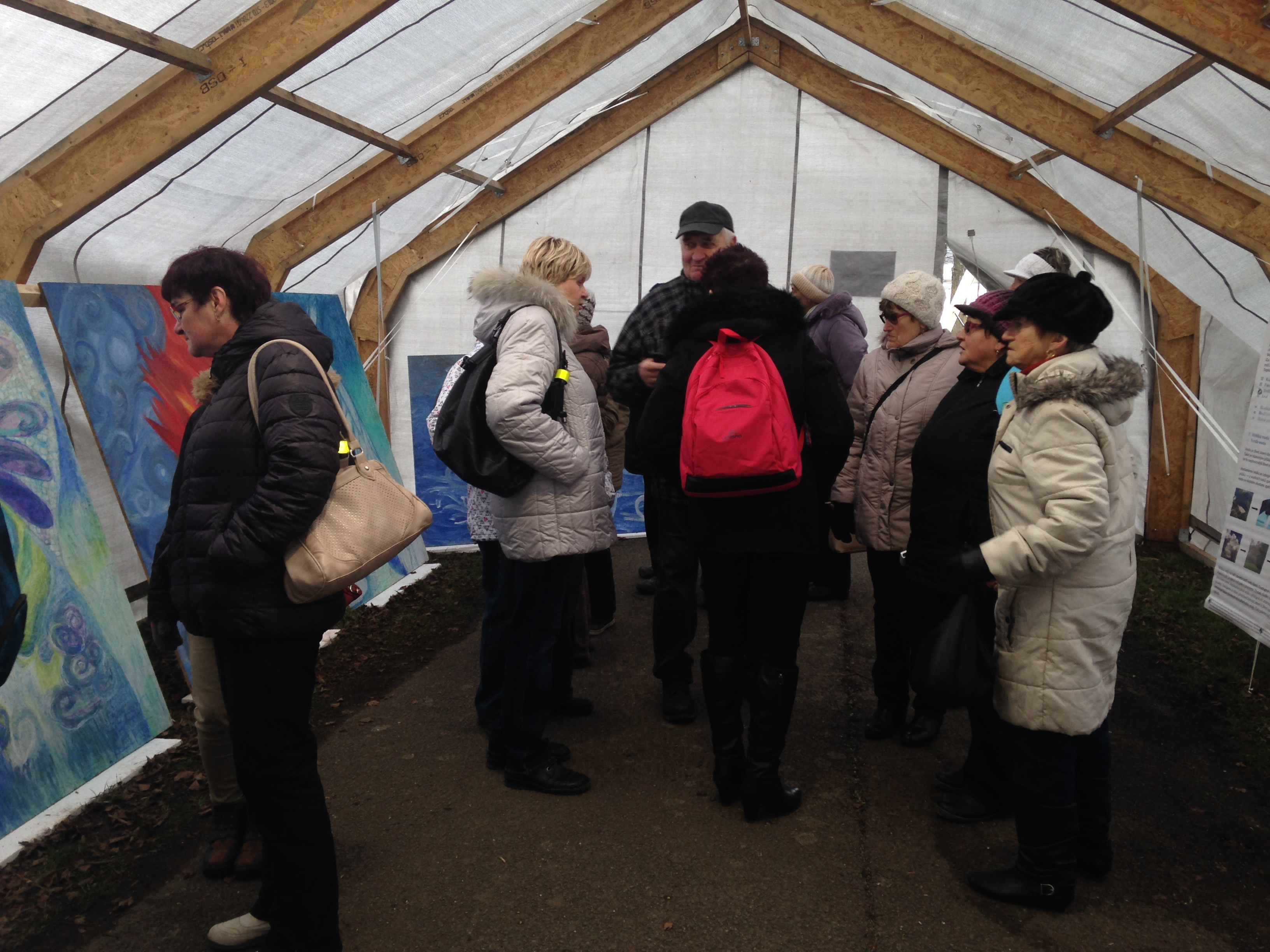 V dalším stanu byly umístěny veliké pastelové obrazy a popisky o historii této výstavy, se kterými nás průvodci seznamovali. Někteří účastníci využili vyhřívaného baru. Díky umožnění osahání soch výstavy jsme získali představu o struktuře a velikosti vystavených objektů.