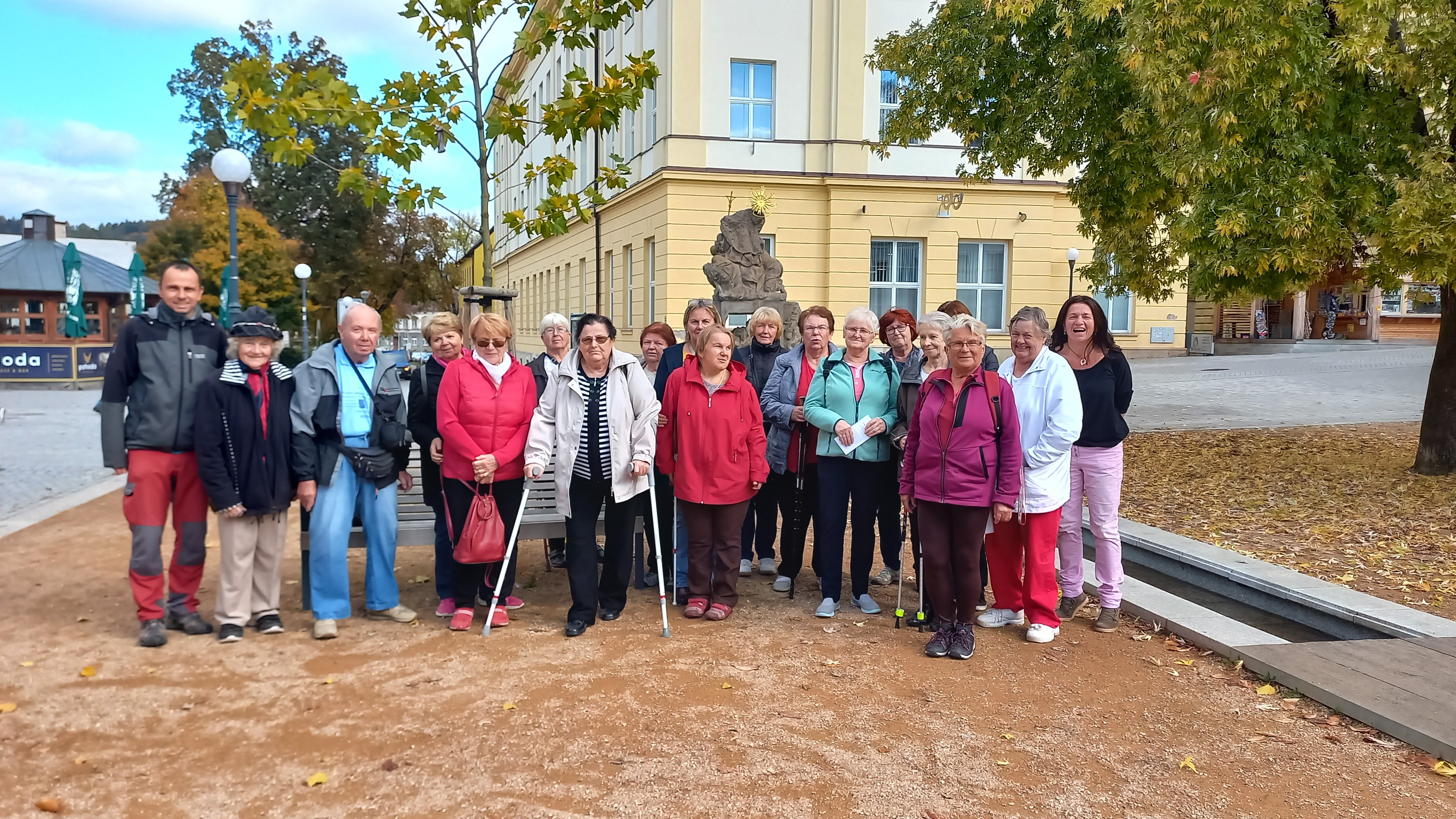 Kulturní část programu skončila a čekal nás oběd v místní restauraci. Byli jsme mile překvapeni. Pochutnali jsme si a i ceny byly solidní. Po dobrém obědě nechyběla ani tradiční cukrárna, fotografování účastníků s pozadím náměstí obklopeného obchody pod rozsáhlým podloubím. V centru stojí barokní sloup Nejsvětější Trojice.