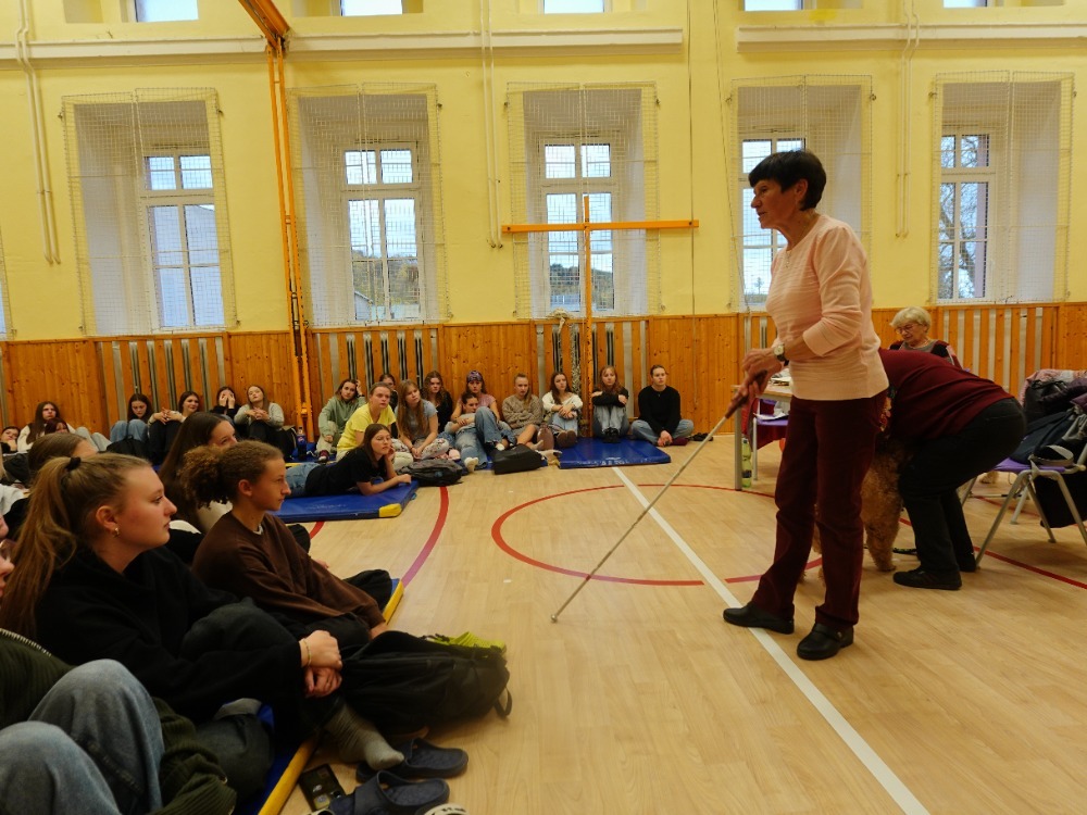 pomůcek, chůze s bílou holí, představení výcviku vodících psů s názornými