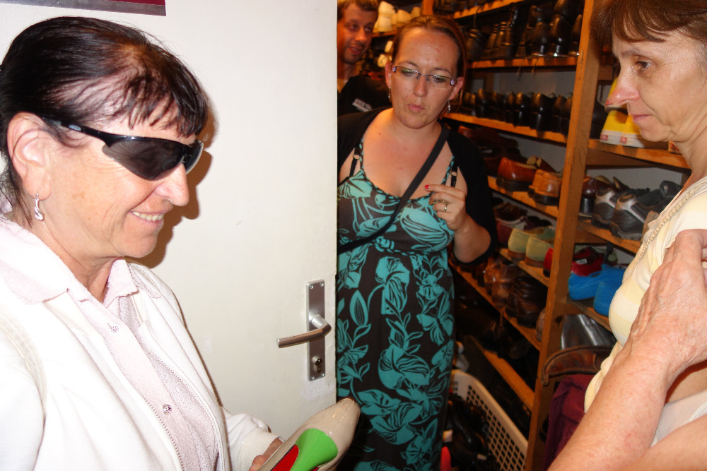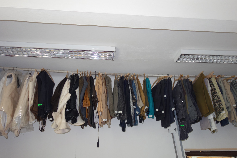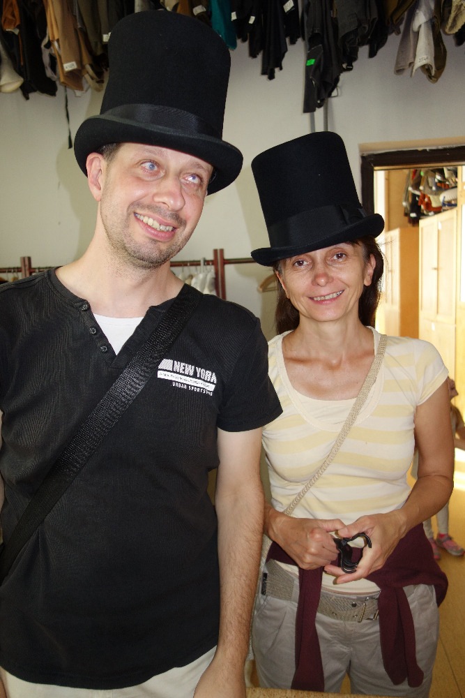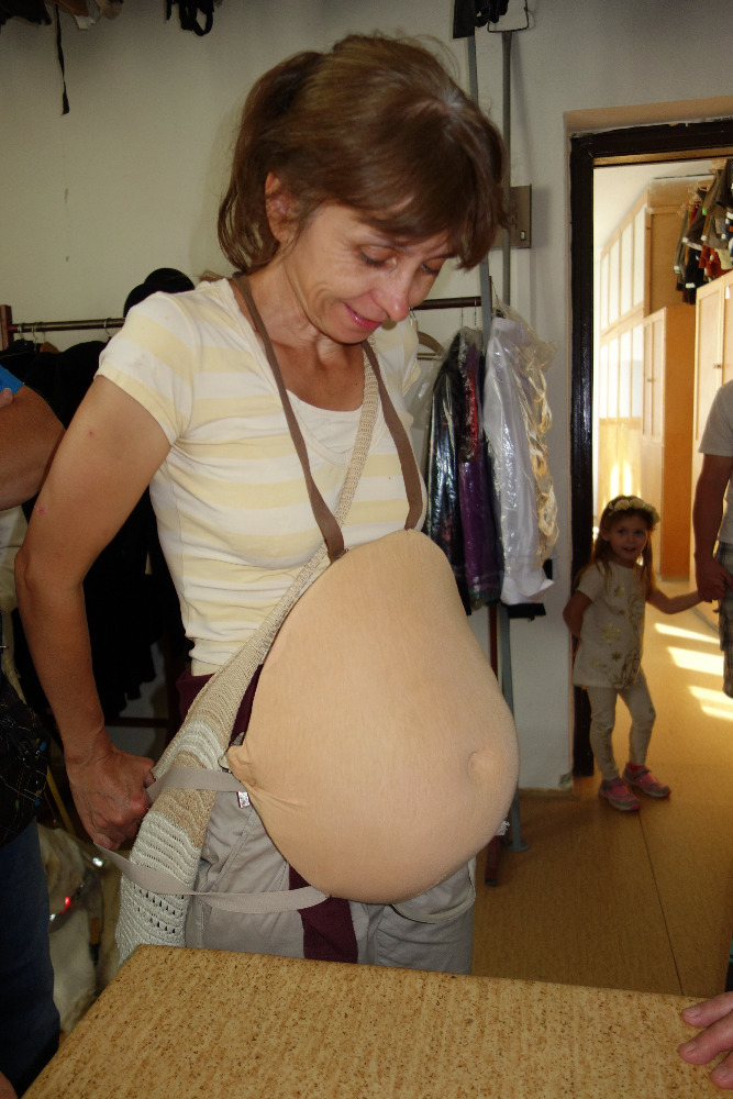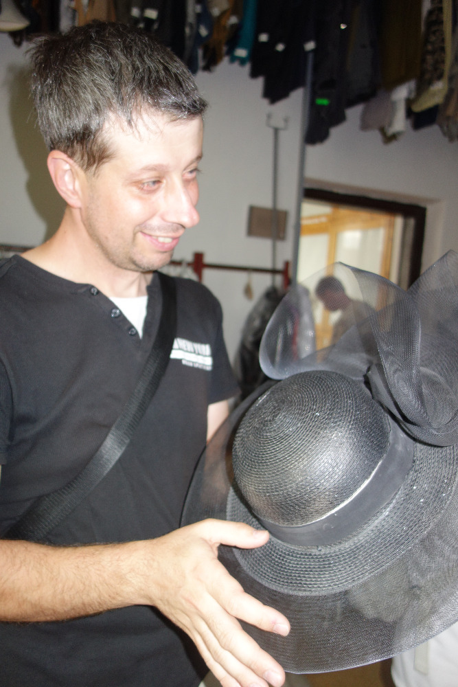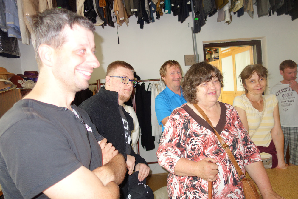 V doprovodu paní Moniky Kalinové jsme navštívili nejdříve kostymérnu. Uskladněno je tu několik kostýmů, které se buď koupí, přešívají, ušijí či jinak případně upravují. V second handech se dají najít prý úplné skvosty. Pro pořádek a pro inventúru má každý kostým své evidenční číslo. Vyzkoušeli jsme si zde také nejrůznější pestrobarevné klobouky a z našeho ženského osazenstva se tak staly rázem dámy z vyšší společnosti. Některé z nás si zatoužily rovzpomenout na těhotenství a vyzkoušely si i rekvizitu těhotenského bříška.