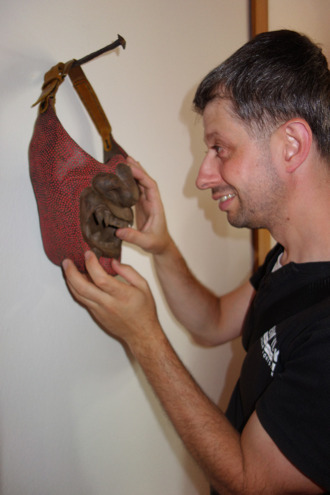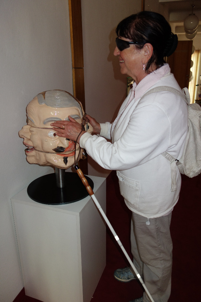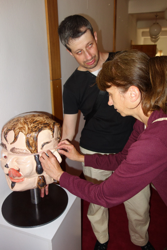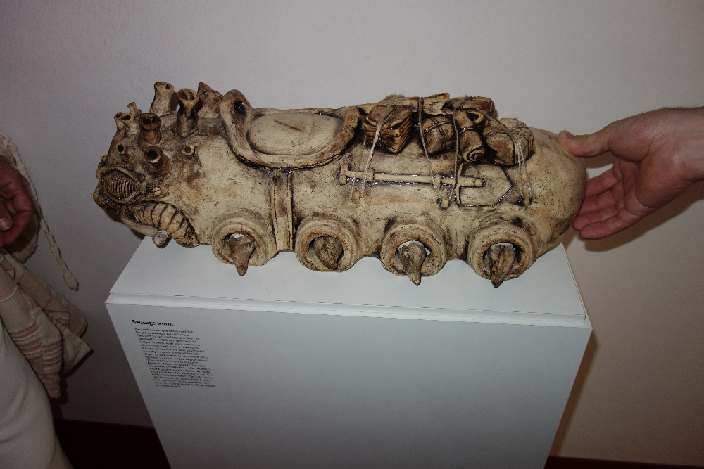 V poschodí divadla jsme se hapticky seznámili s keramickou tvorbou Karla Pevného. Svou výstavu nazval Pevnina. Obdivovali jsme keramického zvláštního až mimozemského červíka, který, když se zmáčklo tlačítko na zadečku, začal vehementně kmitat nožičkami, velkou otáčivou hlavu s různými výrazy, které se daly mezi sebou kombinovat ve třech patrech či masku s velkými tesáky.