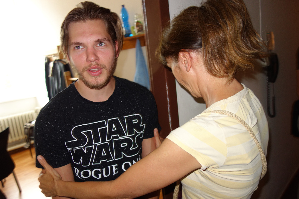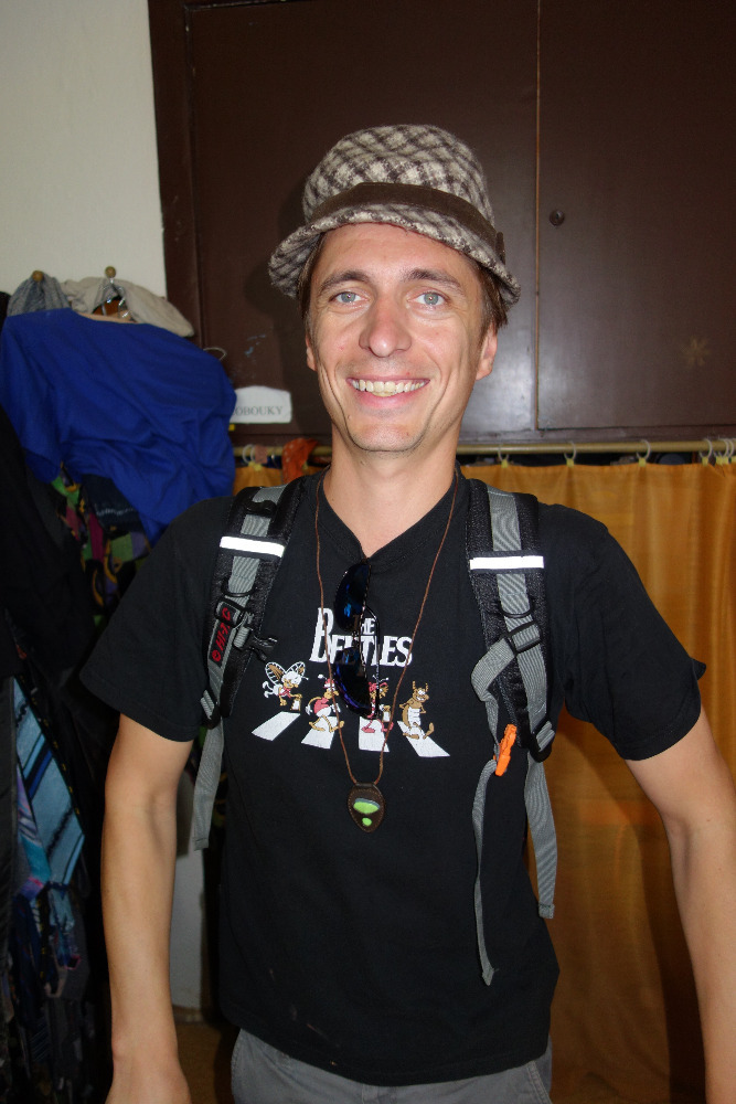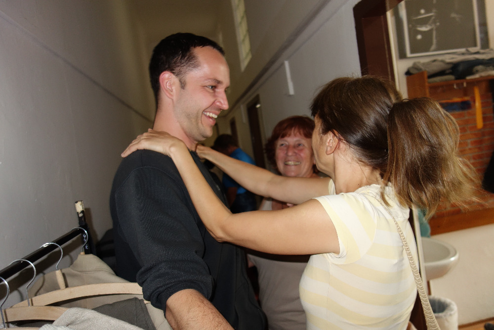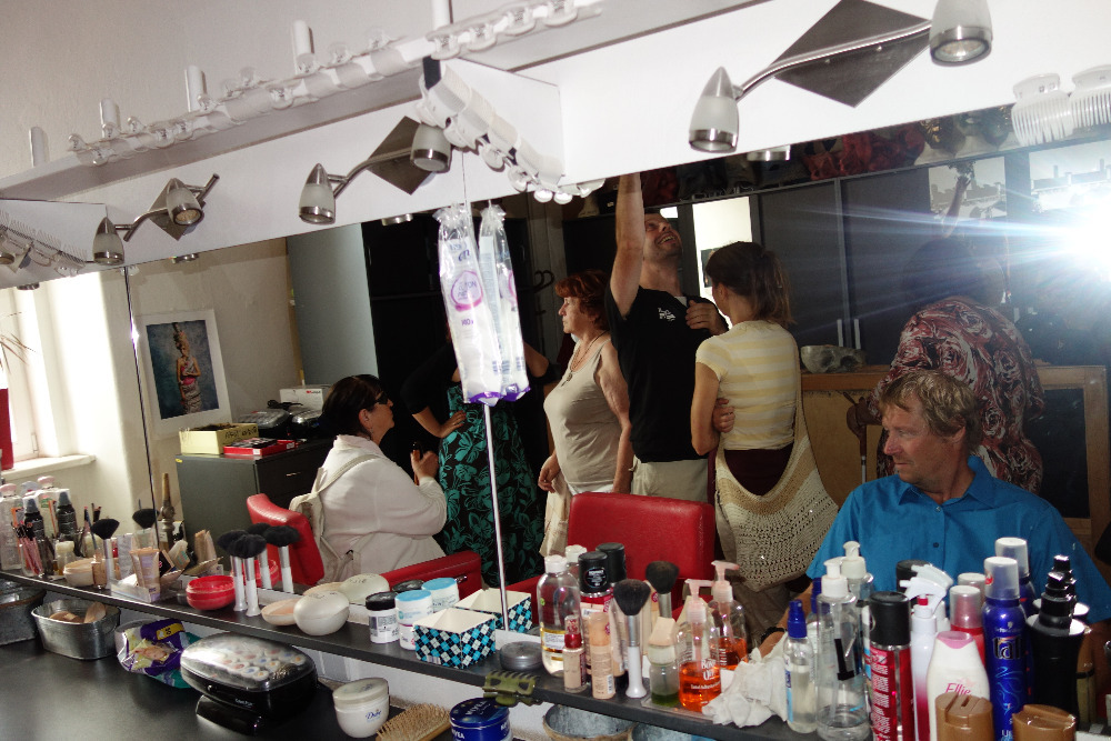 Z chodbičky jsme nakoukli do šaten herců. Ty jsou vybaveny opravdu jen tím nejobyčejnějším, starším nábytkem. Nedopřávají si tedy žádný přepych. Dveře zdobí jména herců, někde i jejich fotky. Nyní to začalo být dokonce velmi vzrušující. Naše dámy zažily totiž menší dostaveníčko se samotnými herci. Jako prvního jsme si „ohaptili“ mladého, sympatického blonďáčka Martina Hudce. Nechává si narůst vousy, aby vypadal starší, ale co si budeme povídat, jsou to tedy zatím spíše takové „chmýříčka“ a zatím moc efekt nemají. Podle trička usuzuji, že je velkým fanouškem Hvězdných válek. Viděli jsme ho naposledy v roli Claudia toužící po krásné Hero ve známé Shakespearově hře Mnoho povyku pro nic. Podezřívám ho, že se mu naše „haptění“ dokonce velmi líbilo. Prozrazoval to totiž na něho jeho šibalský až téměř blažený úsměv. Jako druhý přišel na řadu tmavovlasý Jiří Hejcman. Toho jsme mohli obdivovat jako cholerického režiséra v bláznivé komedii Bez roucha. Jedna hra se hraje 3x. Napřed probíhá její zkouška, poté je vidět, co se děje v zákulisí a nakonec při 50. repríze. To už jen trefit ty správné z osmi dveří, položit na stůl sardinky, či je odnést, kam správně umístit noviny – to už prostě není reálné, navíc se bortí vztahy mezi herci a chudák režisér už s tím nic nemůže dělat, leda se dočista zbláznit. Také jsme ho viděli naposledy v roli ironického Benedika, který nakonec spolu s jeho zatvrzelou odpůrkyní Beatricií propadnou nakonec vzájemné a vášnivé lásce ve hře Mnoho povyku pro nic.