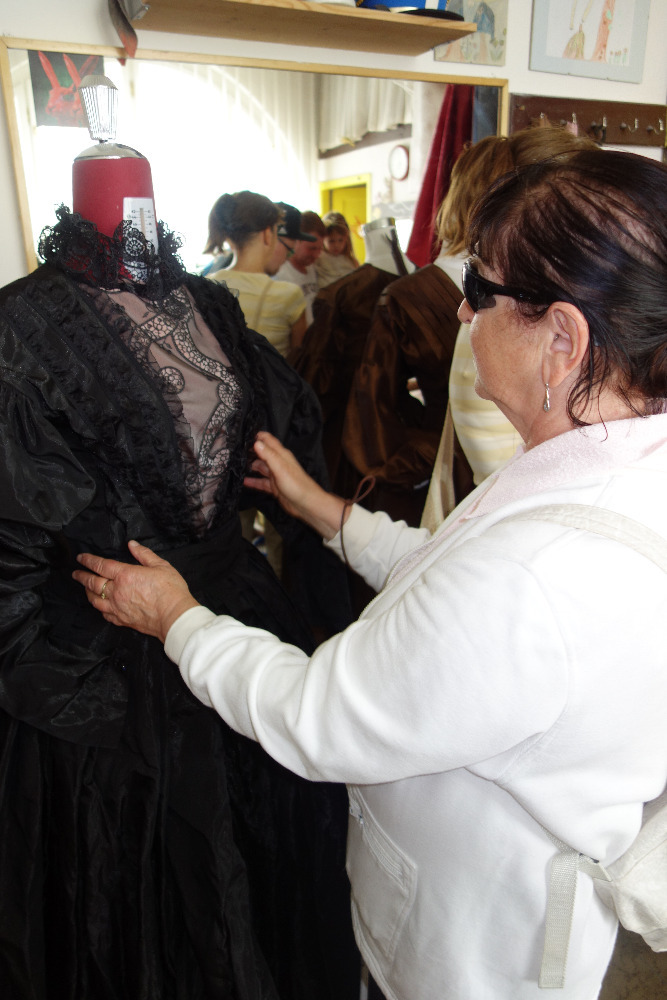 V krejčovně jsme zhlédli různé návrhy šatů a dotykem prozkoumali i právě ušité překrásné dobové šaty z chystané nové hry Fidlovačka.