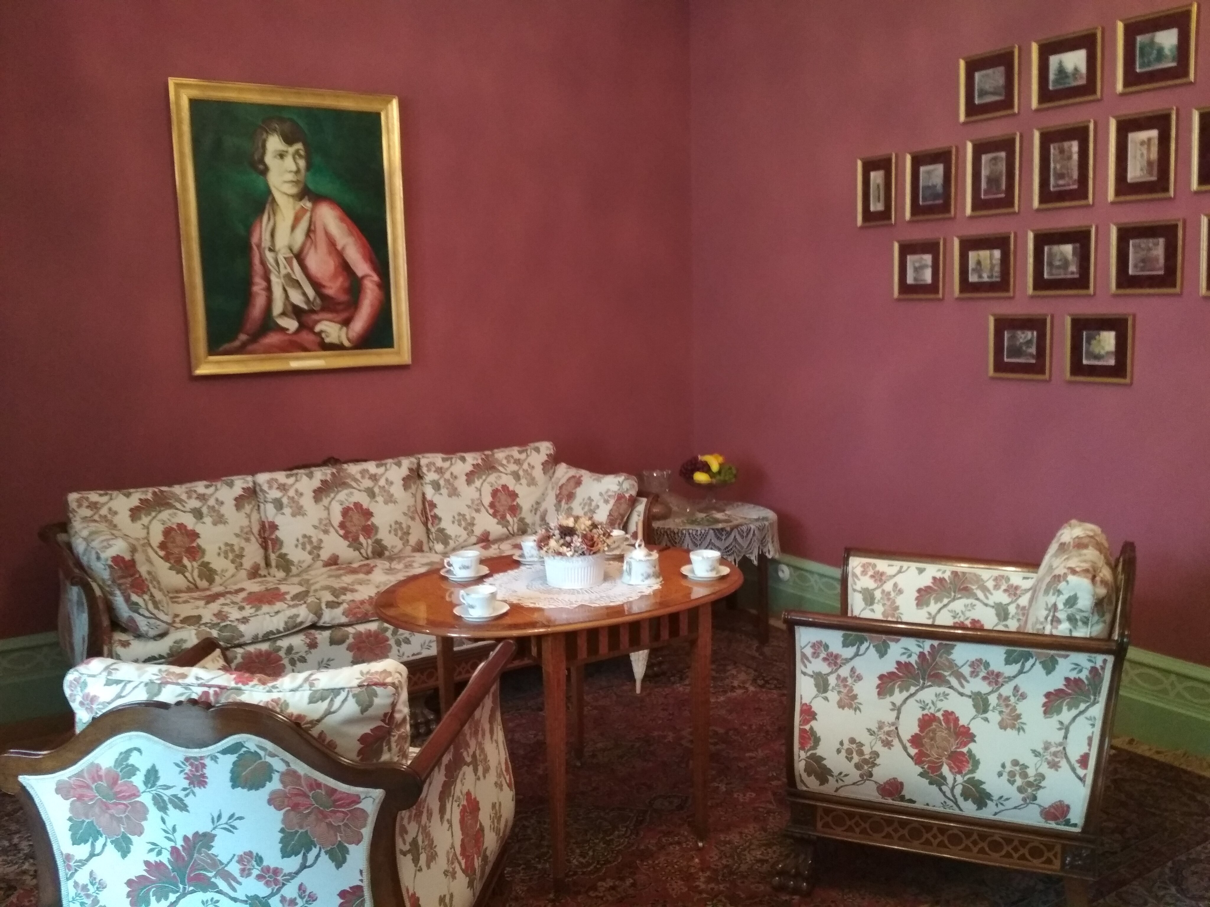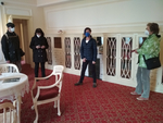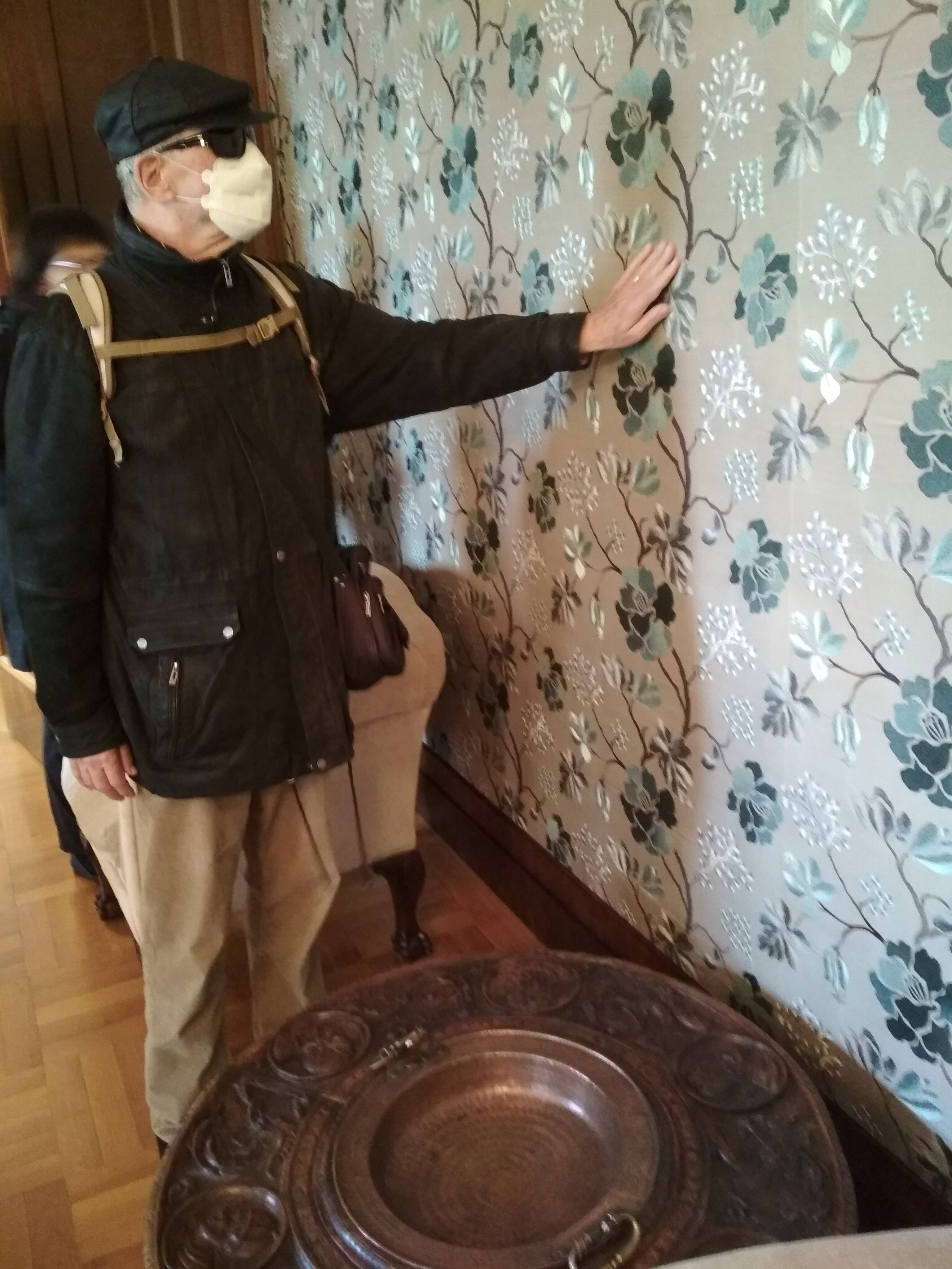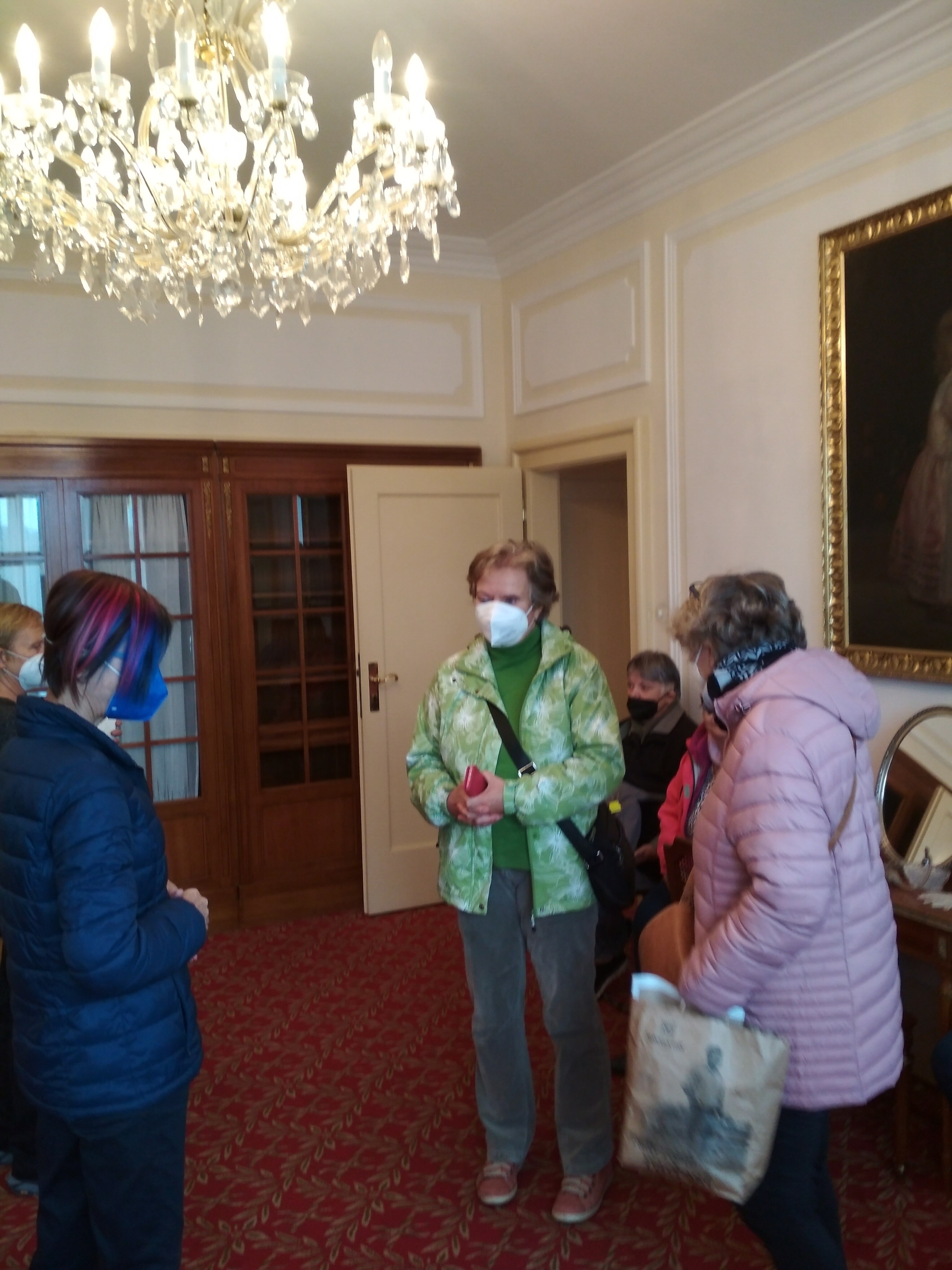 Panu Leovi Zankelovi se líbila nejen paní průvodkyně, ale všechny zúčastněné ženy a rád si poseděl v pohodlných křeslech rodiny Stiassni. Tu možnost jsme měli samozřejmě všichni, a tak jsme poznávali nejen zrakem a hmatem, ale právě i tím, že jsme měli možnost vyzkoušet si pohodlí obytných částí. Mě osobně upoutalo rozlehlé dřevěné schodiště, potažené červeným kobercem. Po tomto schodišti údajně scházeli slavnostně manželé Stiassni, když měli hosty. Pan Alfréd tu pak během večera sešel ještě několikrát a předváděl hostům své prvotřídní vlněné obleky, které byly vyrobeny a ušity v jeho továrnách a dílnách. Není tedy divu, že z celé rodiny měl největší osobní šatnu.