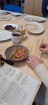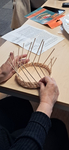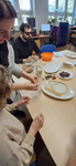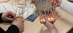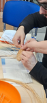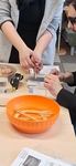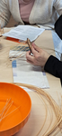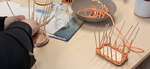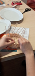 Před začátkem výroby čehokoli se materiál namočí do vody. My použili klasickou plastovou misku, kam jsme smotané kousky ponořili. Ještě vlhký se materiál lépe tvaroval a držel, kroutil a opracovával.