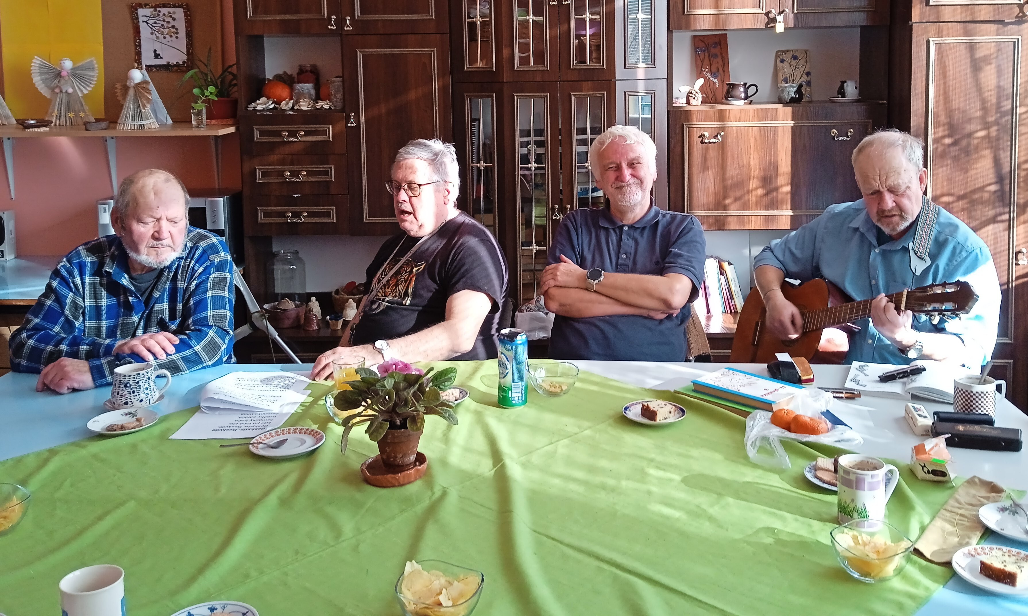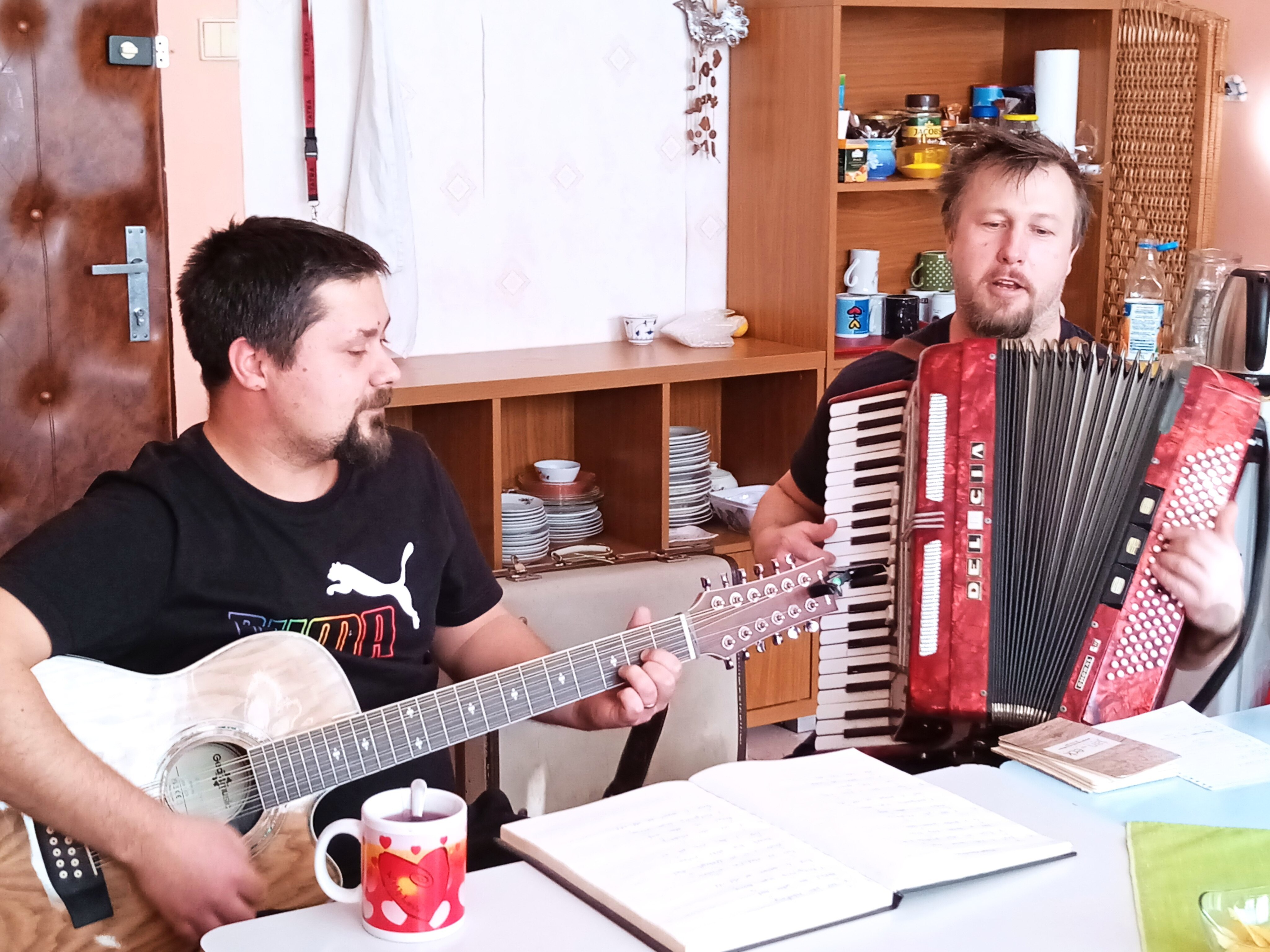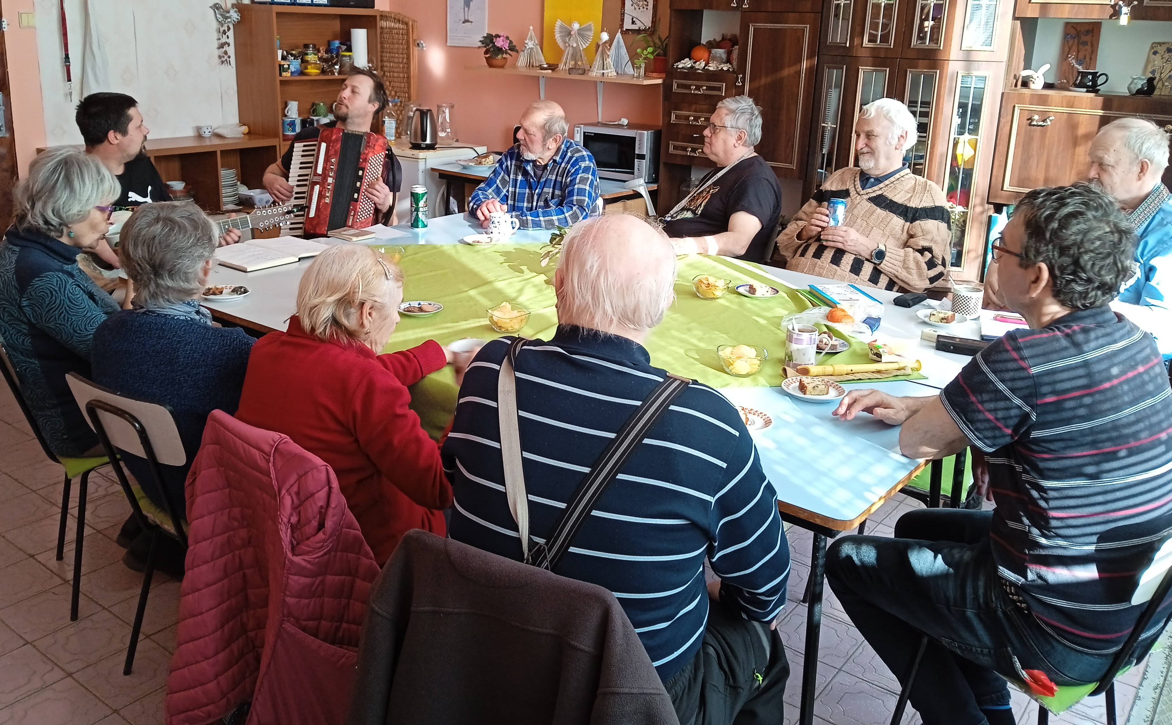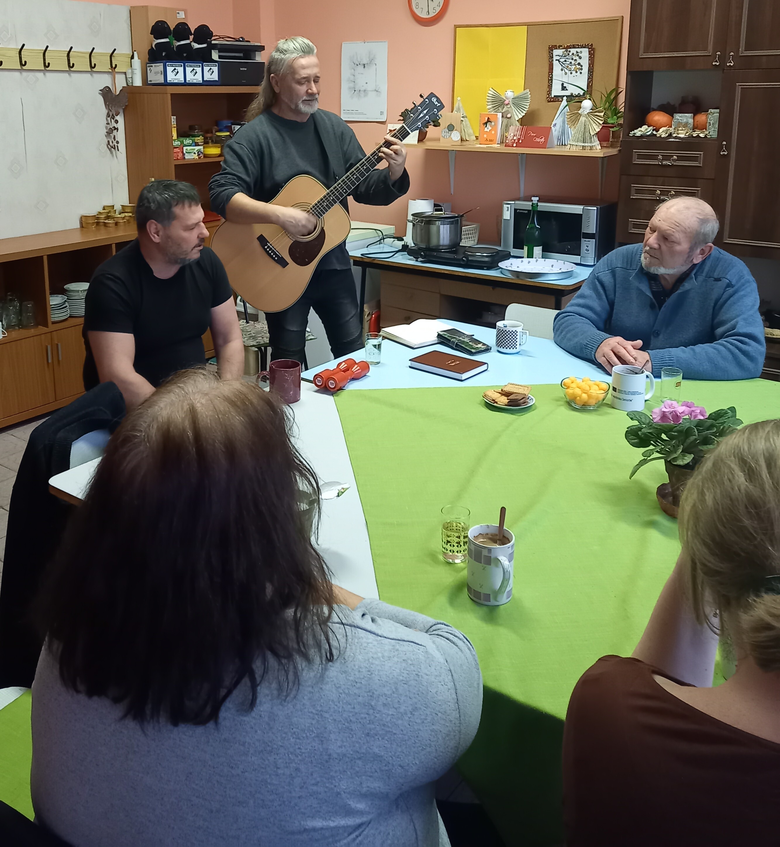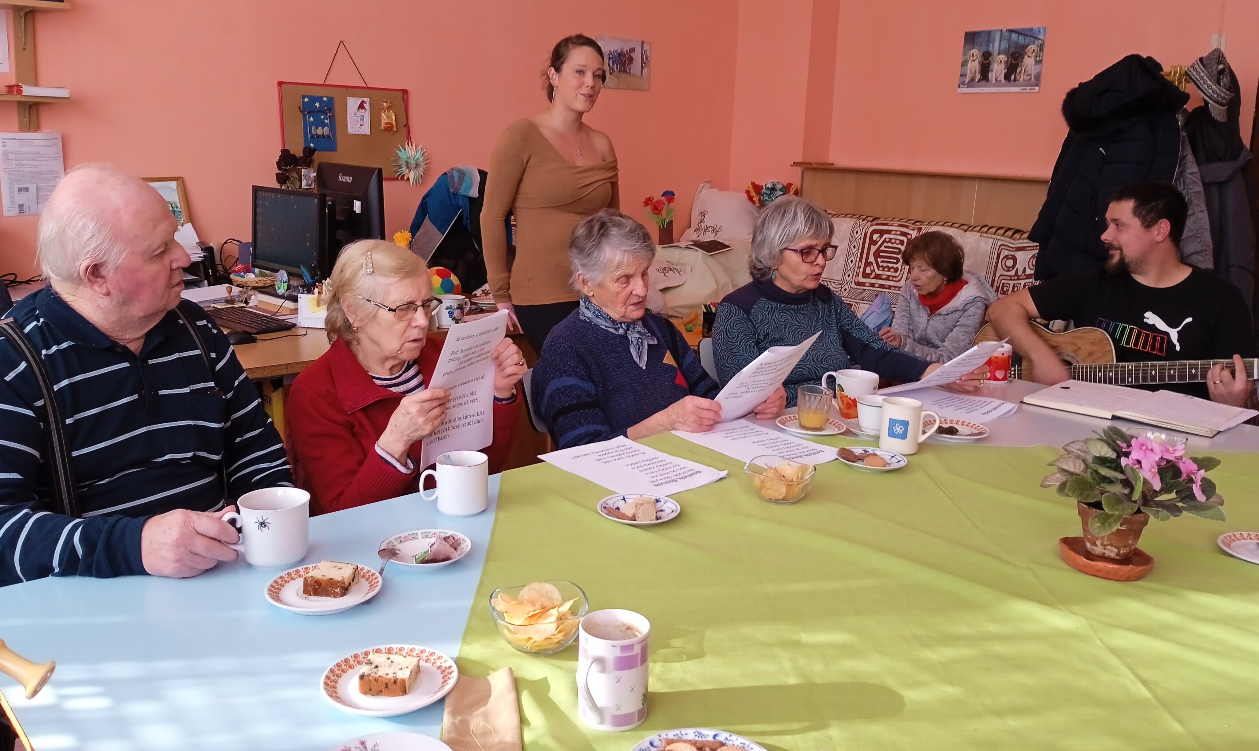 Jednou za dva měsíce pořádáme v kanceláři odbočky hudební odpoledne s muzikanty. Nejčastěji nás svým zpěvem a hrou na nástroje doprovází pánové Hynek Janík na kytaru a Petr Jurník na cajon. Občas se přidá s kytarou pan Jaroslav Halama nebo pan Jiří Fikáček, na zobcovou flétnu pan Stanislav Doubek a na akordeon pan Petr Audý. Setkání při muzice a při společném zpěvu nás moc baví. Vždycky tak trochu omládneme a vrátíme se ve vzpomínkách k táborákům, tanečním zábavám a mladičkým láskám...