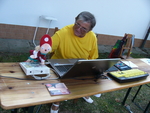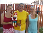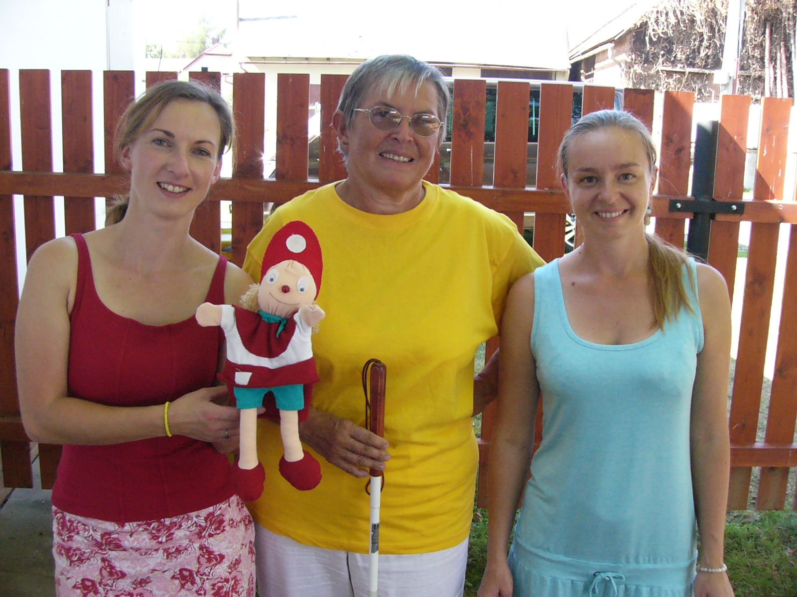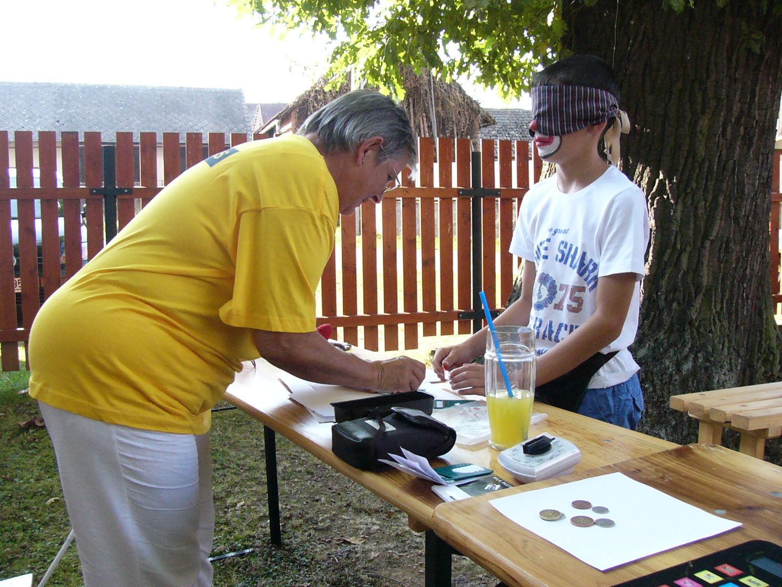 Děvčata připravila náš stánek pro presentaci a předvádění kompenzačních pomůcek i elektronických zařízení. Podařilo se jim vystavět těžkou překážkovou a orientační dráhu pro chůzi s bílou holí a také připravit stanoviště pro další disciplíny. Všechny úkoly, mimo práce na počítači, byly plněny se zakrytým zrakem pomocí látkových škrabošek, které děvčata ušila. Na jednom stolečku byly láhve s vodou, pohárky a námi zapůjčená pomůcka- hladinka. Děti i jejich rodiče měli za úkol otevřít láhev, nalít do pohárku a pomocí hladinky určit správnou míru, potom pomocí nálevky nalít vodu do jiné láhve a uzavřít. Tato disciplína se setkala s velkým zájmem a některé děti se dožadovaly opakování. Na dalším dovednostním stanovišti bylo zřízeno hmatové centrum, kde si soutěžící prověřovali dovednost hmatem rozpoznávat tvary předmětů a správně je zařazovat do otvorů. Tato disciplína byla pro většinu dětí i rodičů velmi náročná, moc se jim nedařilo a to nebyli ani časově omezeni. Hned vedle byl stolek s nádobkami- kořenkami s různým kořením i tekutinami. Podle vůně i chuti měli soutěžící určit, co je obsahem nádobek. Kupodivu, tady se to podařilo velké většině hned napoprvé. Další populární disciplínou byla chůze se slepeckou bílou holí v překážkové dráze až ke stolku s naším stanovištěm, kde úspěšné čekala sladká odměna a poklad. Sladkou odměnou byly perníčky a sušenky- cukrovíčko napečené členkami Tiliánku. Poklad bylo nutné nahmatat a vylovit z pokladnice- plátěného pytlíku a tvořily ho plastové různobarevné „brilianty“. A na závěr si každý mohl vyzkoušet rozpoznávání hodnot mincí a bankovek, podpis do okénka podpisové šablony. Málo komu se podařilo určit správně hodnotu všech mincí, děti na tom byly lépe než dospělí. Posledním tahákem, hlavně pro děti, byla obsluha počítače-notebooku s programem pro nevidomé a ovládání pomocí speciální klávesnice pro nevidomé. Většina z účastníků se podivovala i dalším kompenzačním pomůckám, maxikalkulačce, hmatové minutce do kuchyně, optickým i digitálním lupám, mluvícím hodinkám, kartám na kanastu a dalším kompenzačním pomůckám pro slabozraké a nevidomé.