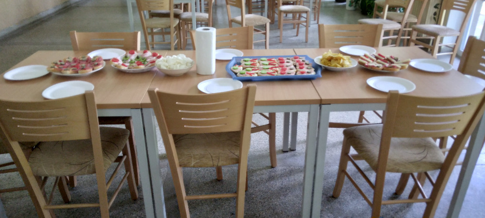 Protože naše kancelář není pro takové množství lidí dostatečně velká, posezení děláme buď venku za budovou, na takovém úzkém dvorku, nebo v aule. Protože sídlíme v bývalé základní škole, jsou přízemní prostory perfektní. Dříve jimi pobíhaly houfy dětí, dnes slouží jako odpočinková zóna starším generacím.