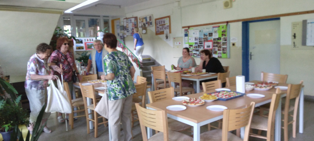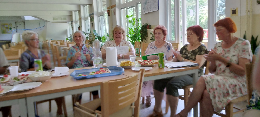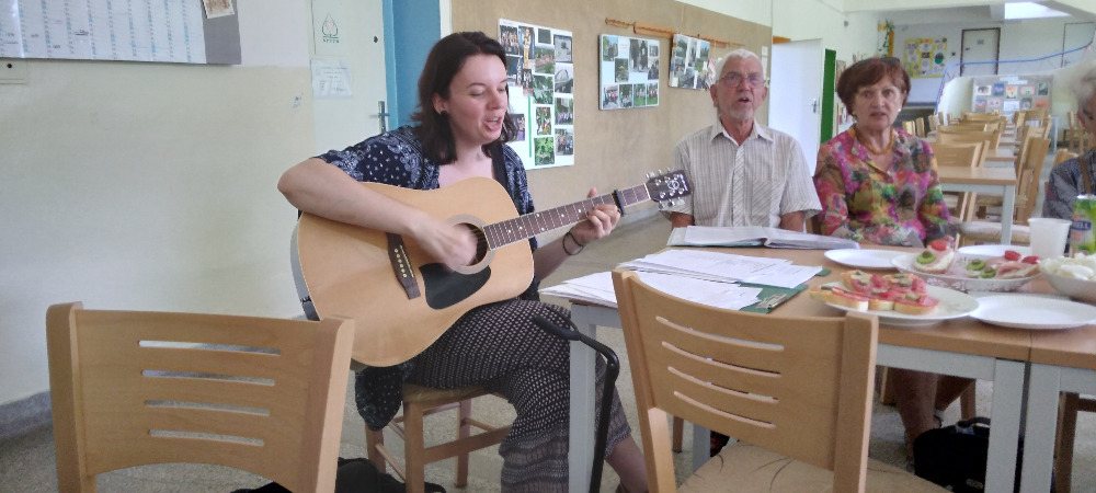 Naši klienti a příznivci jsou většinou starší. Krom lidí ze SONSu nám doprovodný program připraví i Sbor Fit Senior. Dámy se vždy posilní a pak lidové písně zapějí. Radka doprovází na kytaru, kdo chce na menší – chrastivé nástroje. Naše vytrvalá dobrovolnice Jitka většinou obíhá klienty „pro jejich objednávky“ a já myju nádobí, Radka hraje, Andy hýří nápady a komunikuje.